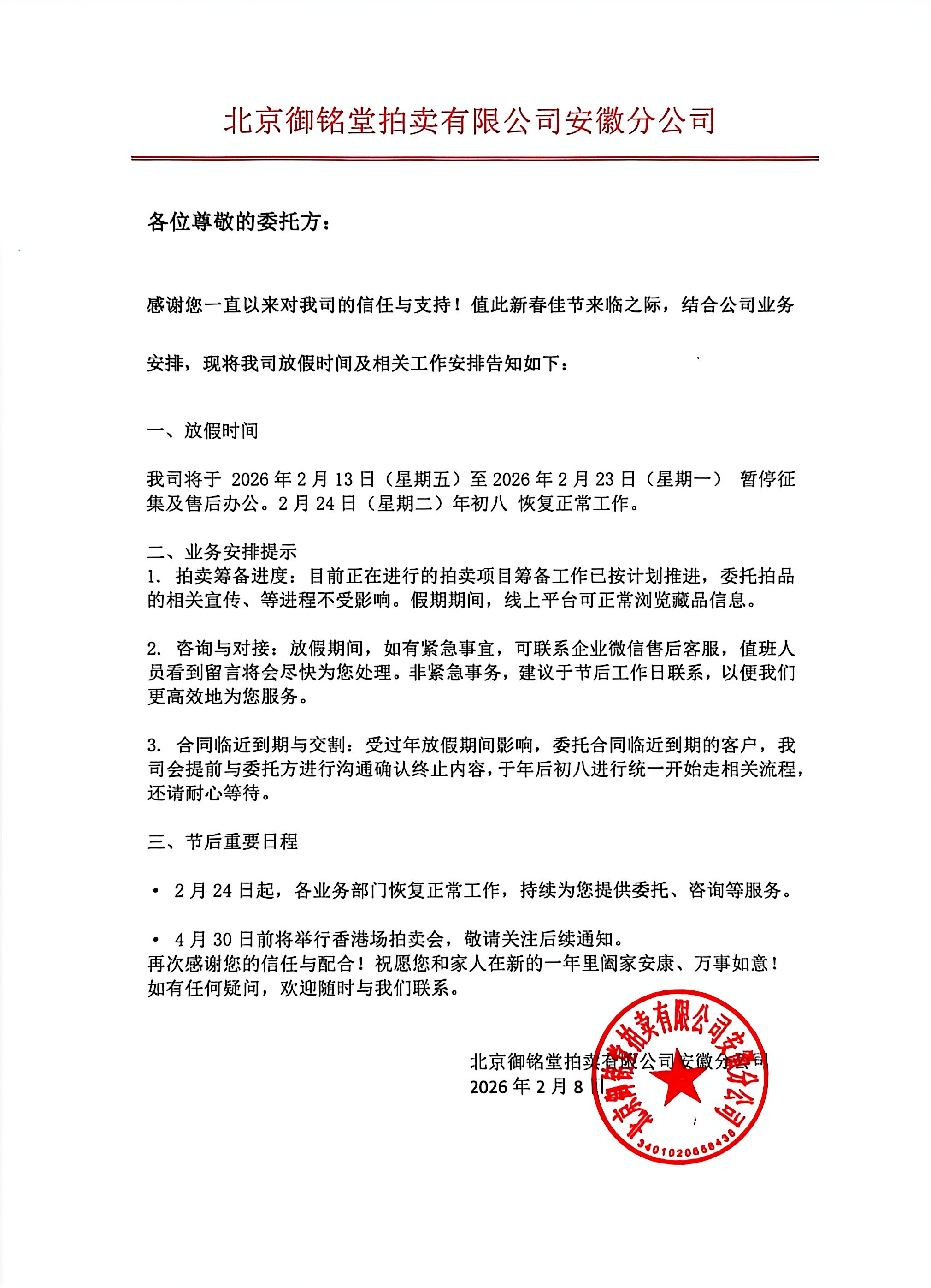 北京御铭堂拍卖有限公司安徽分公司-放假通知