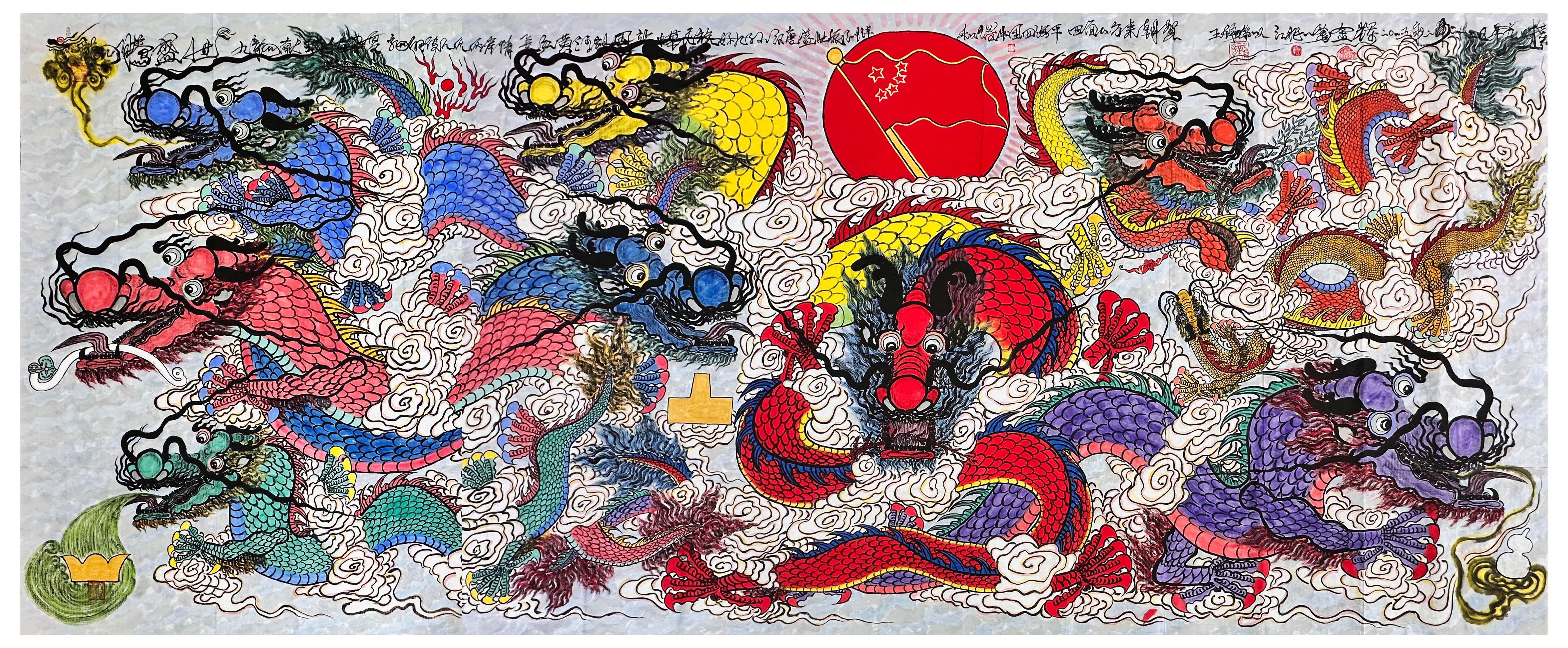 多条龙 “聚首” 的构图,暗喻 “团结凝聚”,搭配鲜明色彩强化视觉冲击力,是当代主题性艺术中 “以传统符号诠释时代精神” 的典型方式。