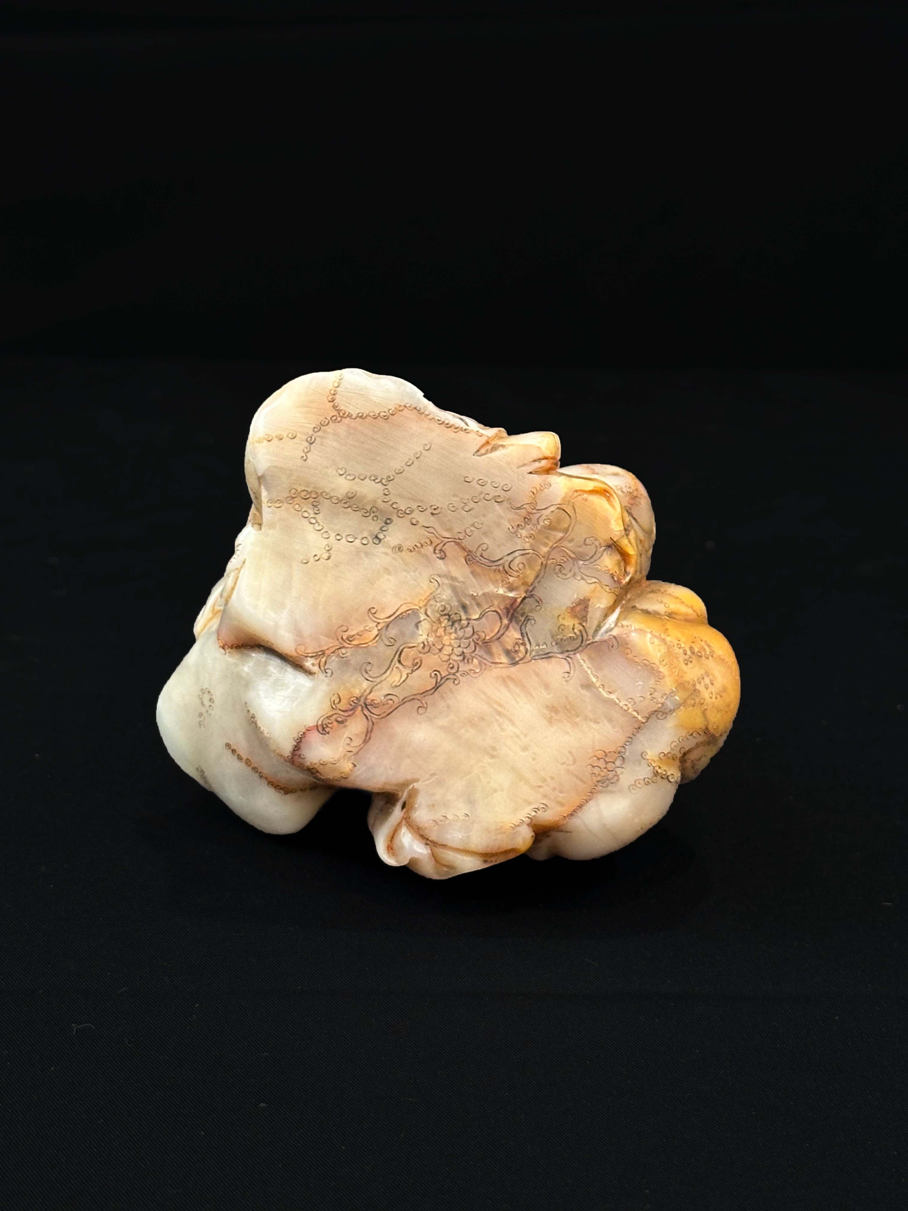 石质细腻温润,呈半透明状,色泽为米白中带天然的黄褐、粉红纹理,蜡质感强。