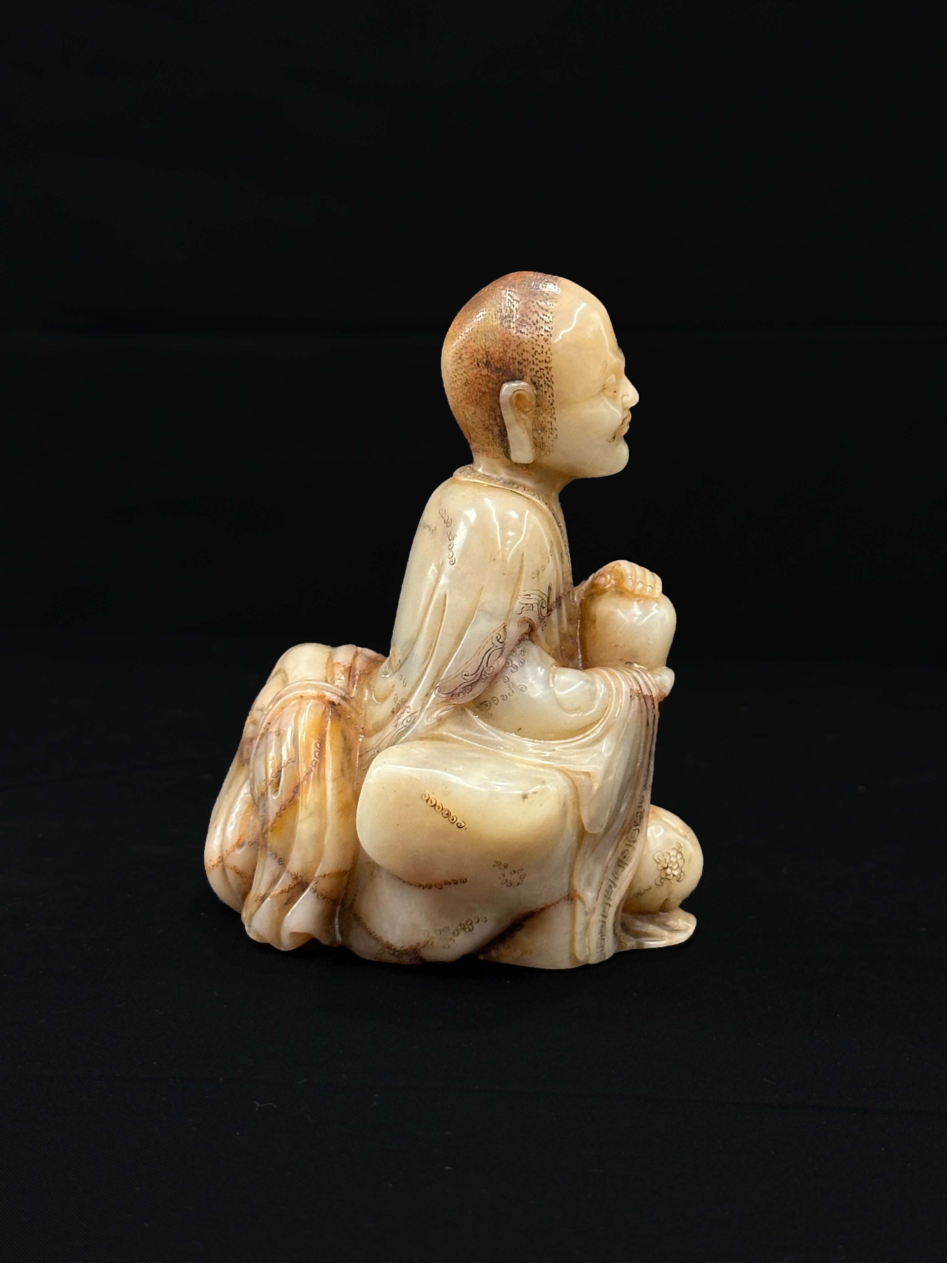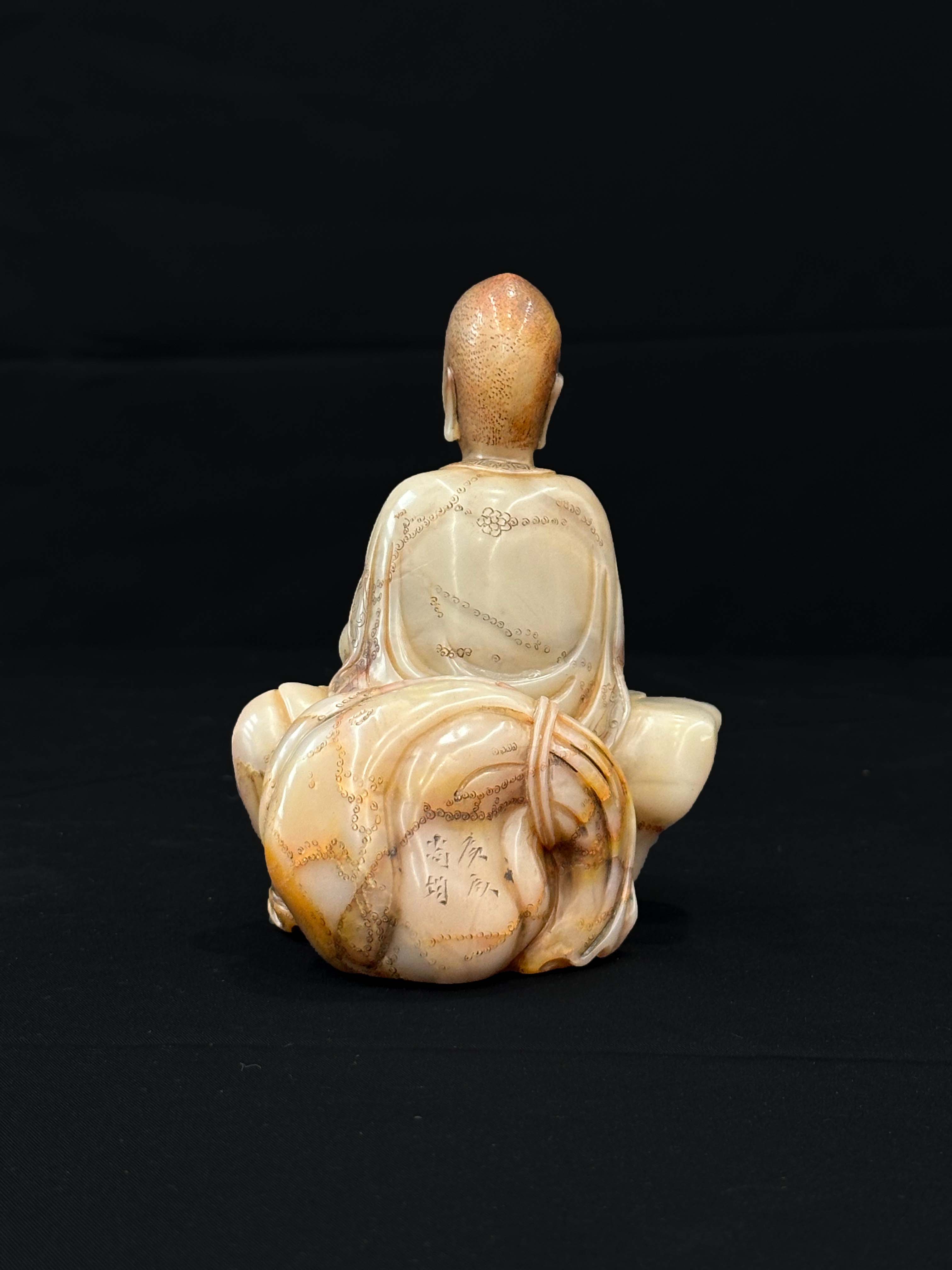 采用立体圆雕,罗汉呈坐姿,一手托宝,一手扶膝,衣纹流畅飘逸,褶皱层次分明。