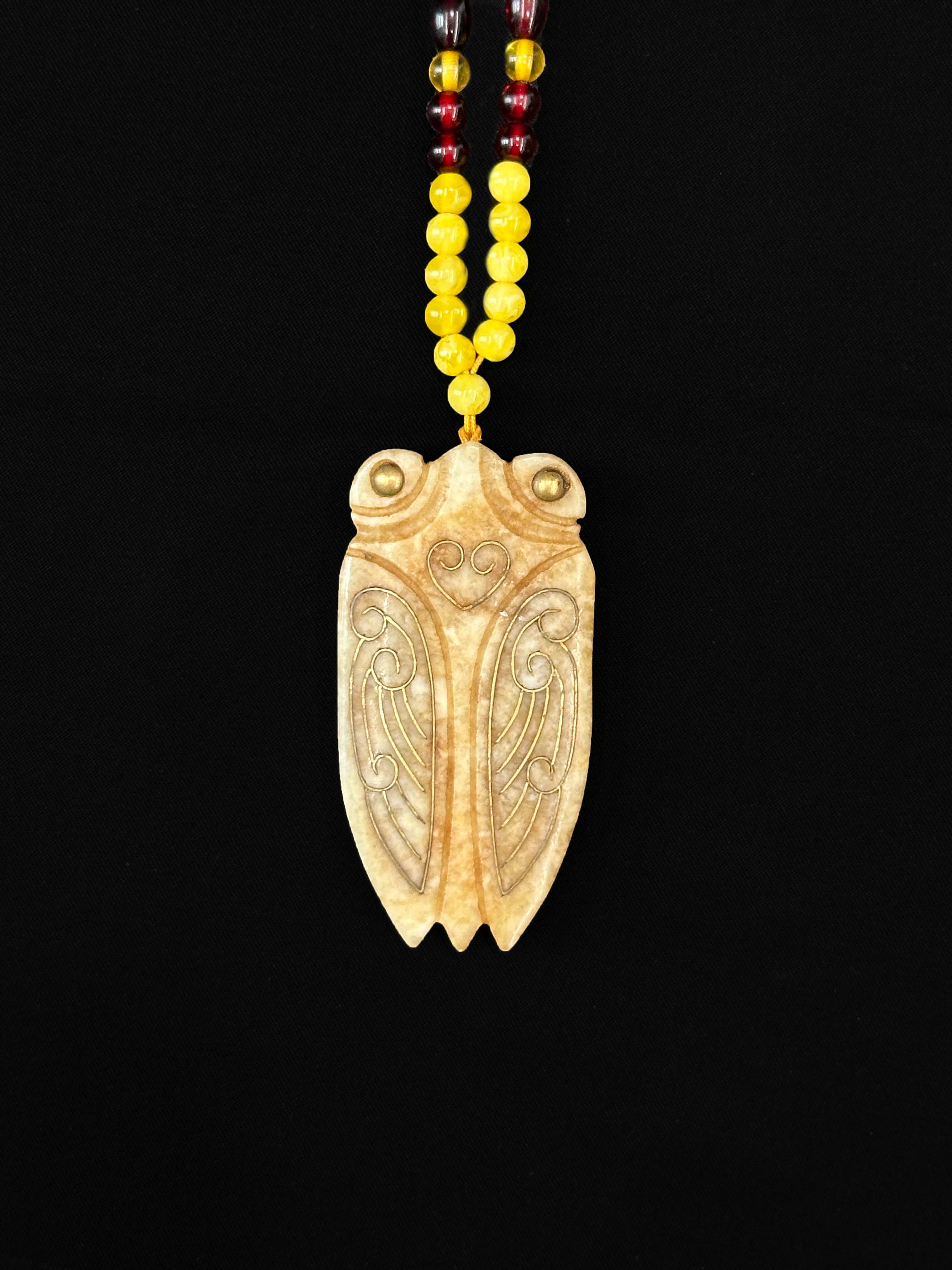 采用典型的 “汉八刀” 工艺,线条简练有力,蝉翼以阴刻线勾勒,纹理清晰;双目处镶嵌金饰,增添华贵感;尾部呈三瓣状,符合汉代玉蝉的经典形制。