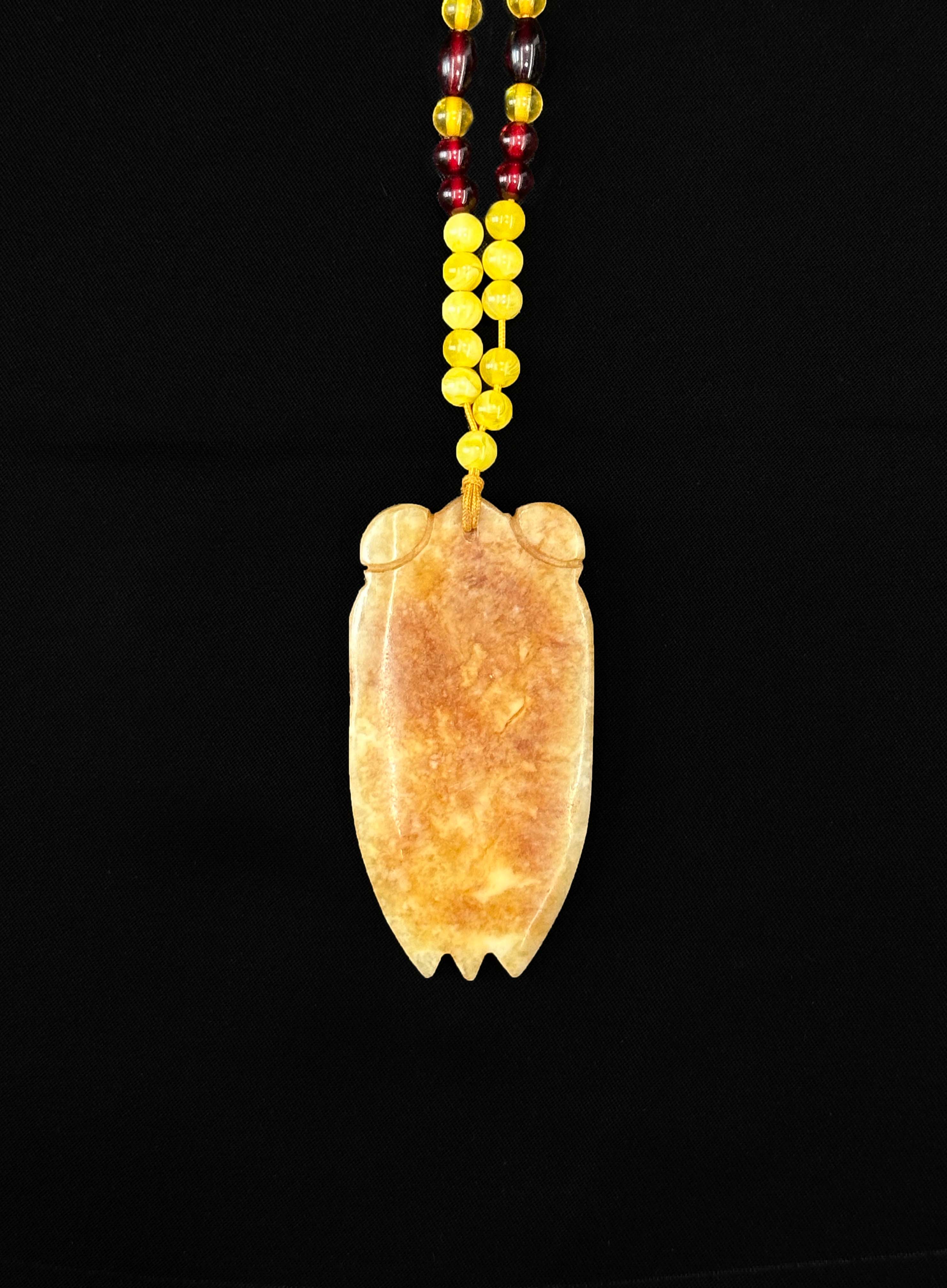 珠串为鸡油黄琥珀圆珠,色泽温润饱满,间以酒红色琥珀桶珠与圆珠点缀,形成鲜明的色彩对比,提升了整体的层次感与视觉冲击力。