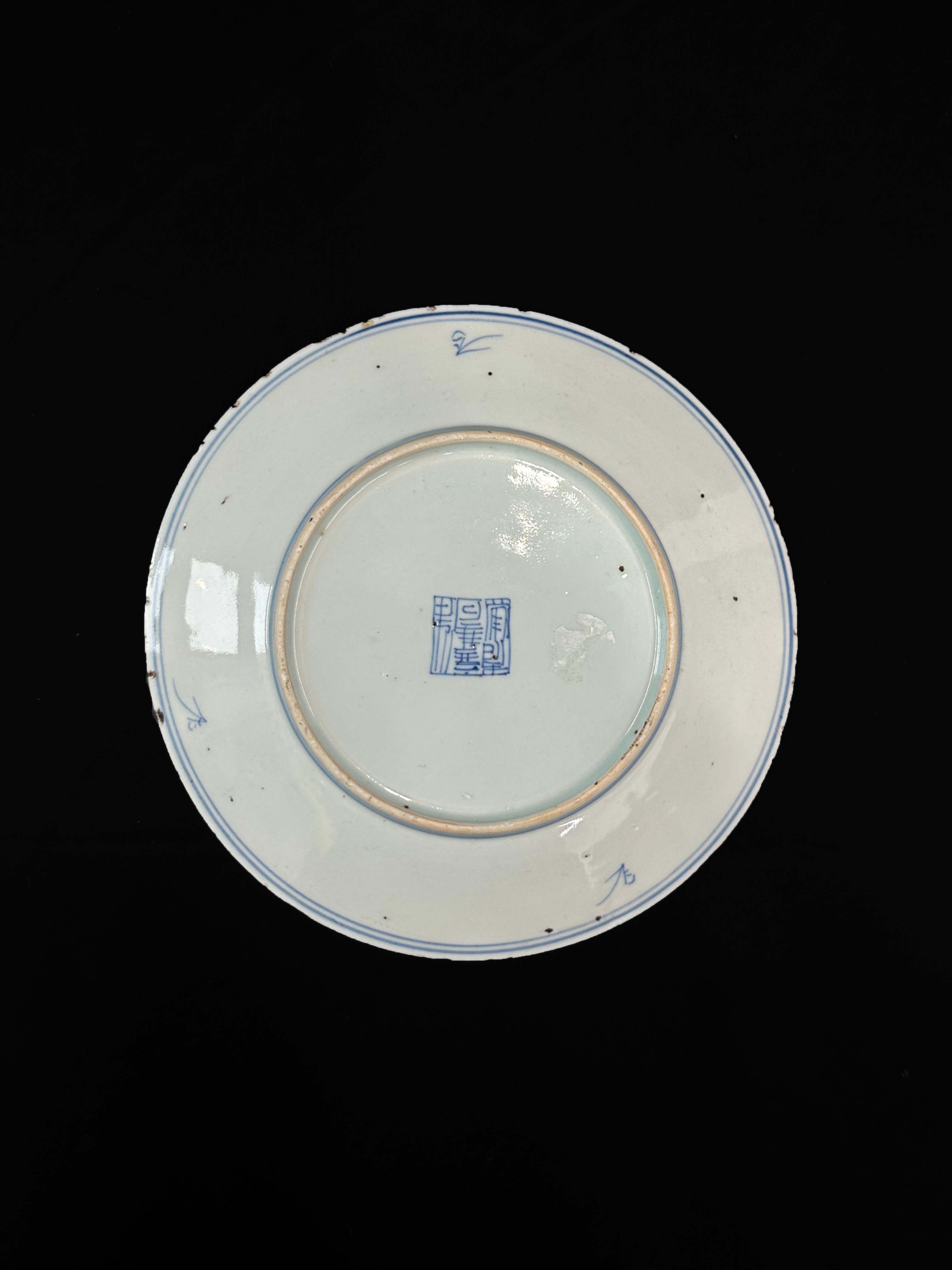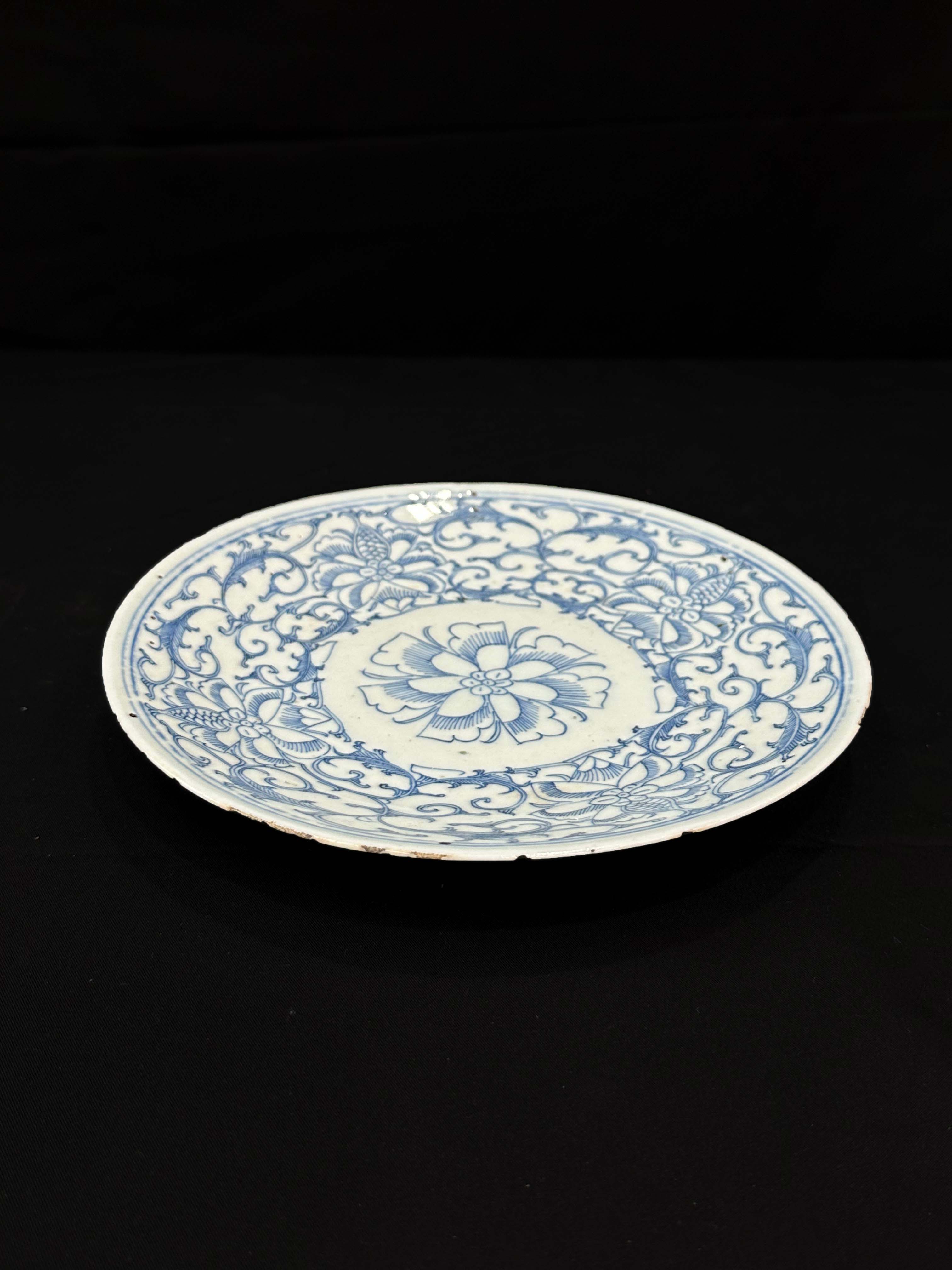 胎质洁白细腻,釉面光润,青花发色淡雅清新,蓝白对比明快,盘心为一朵饱满的宝相花,花瓣层叠,线条流畅;