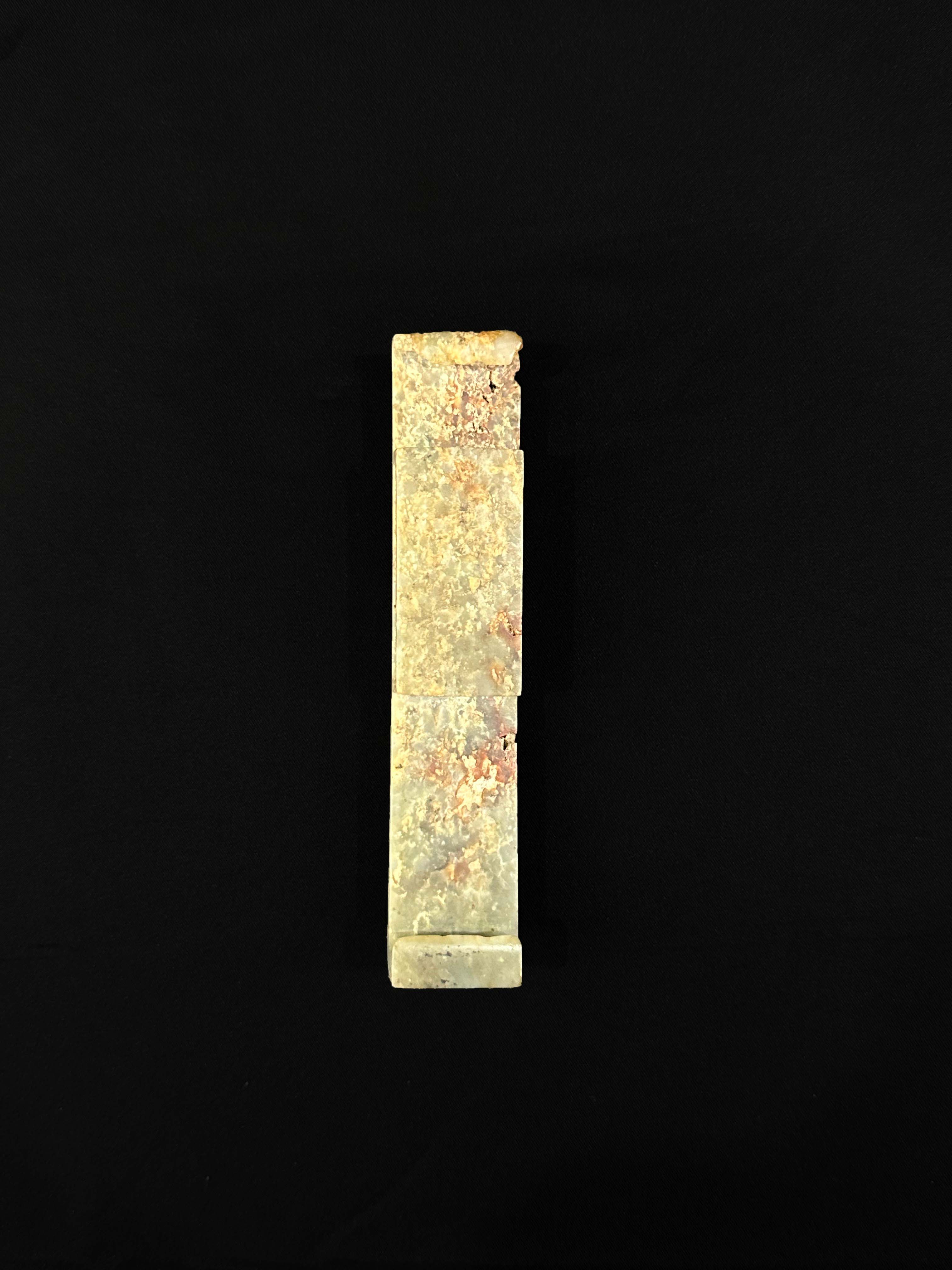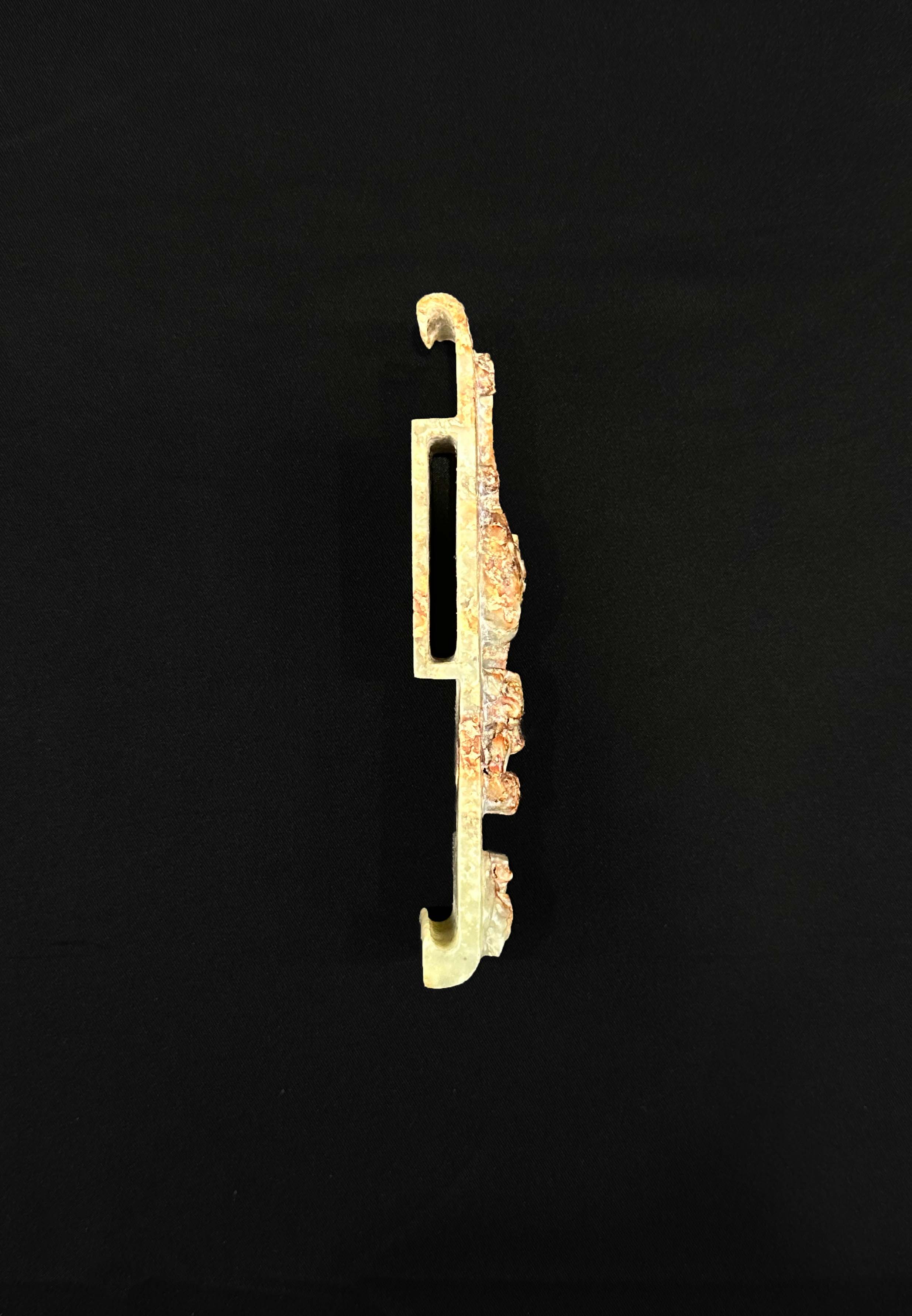 长方牌形,采用高浮雕技法雕琢螭龙纹,龙身蜿蜒灵动,线条流畅有力,两端向下勾卷,中部有长方形穿孔(銎口),用于穿系革带,将剑鞘固定于腰间。