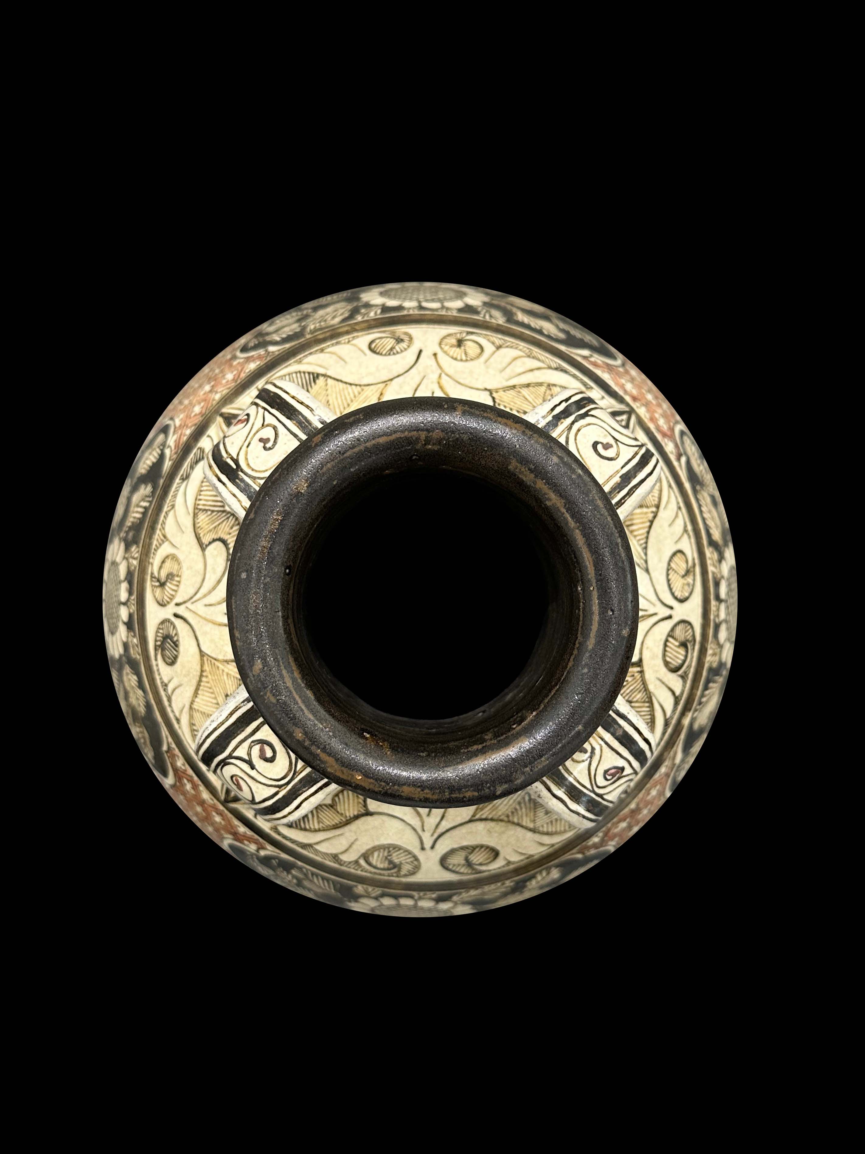 以竹刀或铁针在化妆土层剔刻牡丹纹样,形成 “减地留花” 的浮雕效果,刀法流畅,深峻处可见胎色,层次感强。同时用尖状工具划刻叶脉、花瓣等细节,与刻花形成粗细对比。