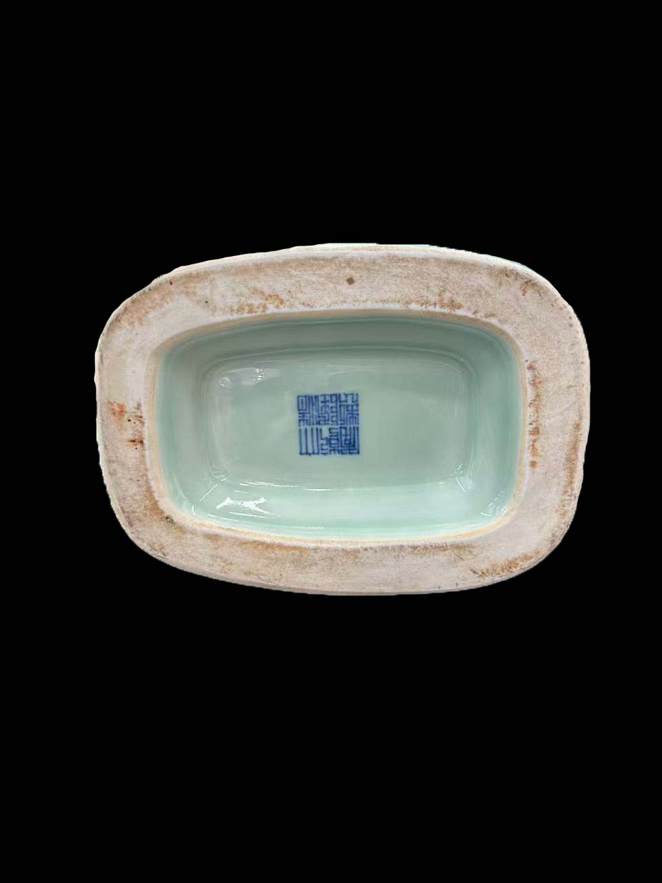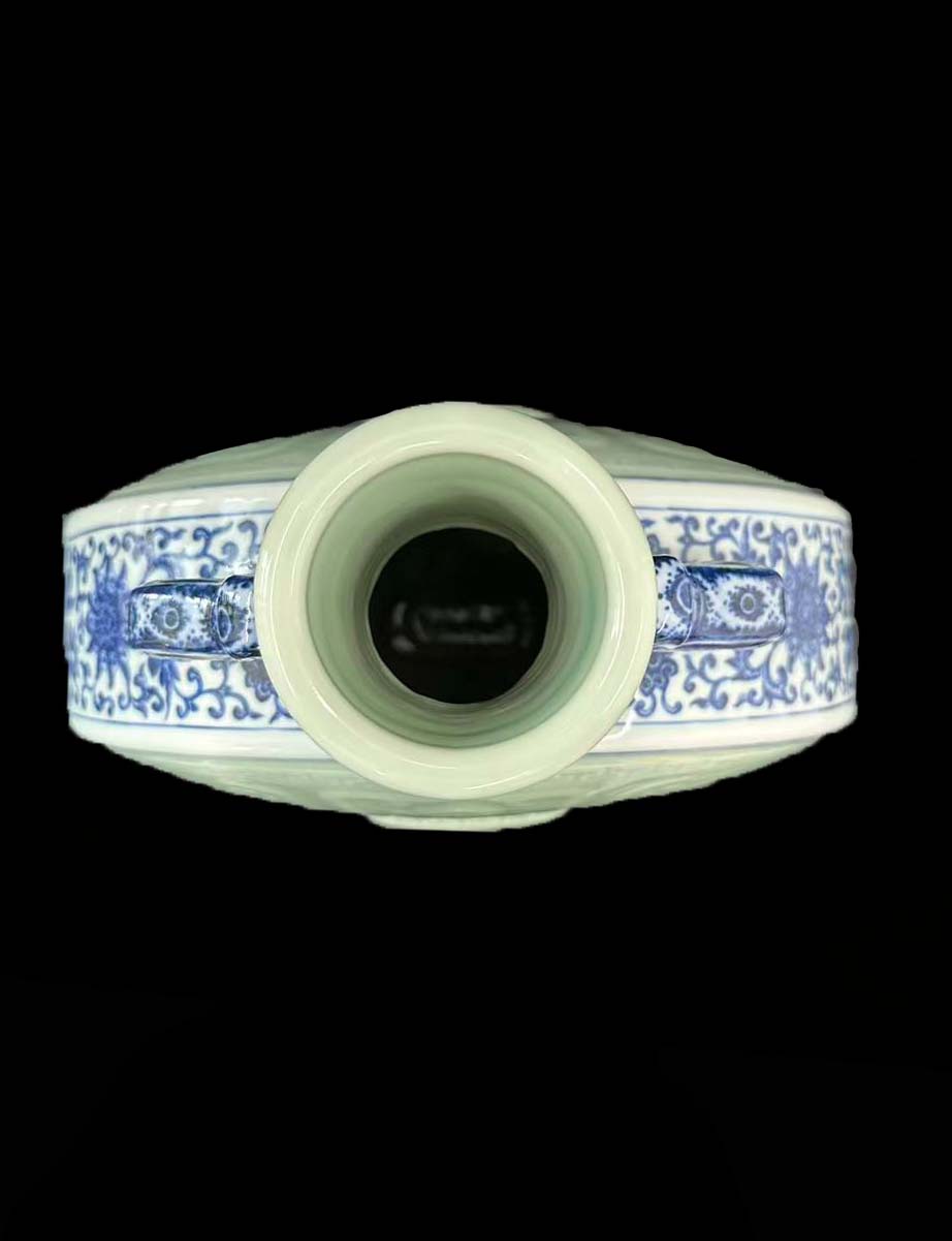 瓶腹通体施温润的豆青釉,色泽淡雅匀净,釉面莹润光洁。在豆青釉下采用暗刻技法,中心为宝相花纹,周围分八格刻绘 “八吉祥” 纹,部、双耳及底足以青花绘缠枝花卉纹,青花发色浓艳,与豆青釉的素雅形成鲜明对比,体现了乾隆时期 “彩釉结合” 的高超工艺。