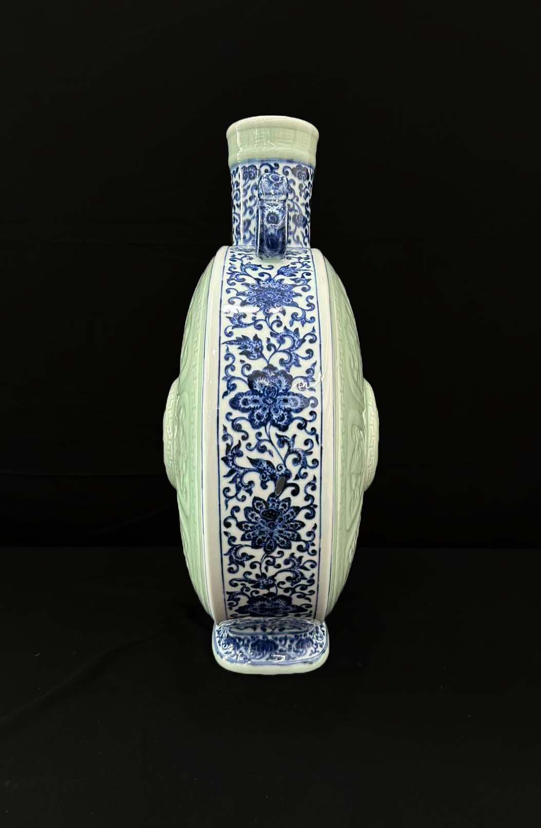 抱月瓶又称 “扁壶”,源自西亚金属器造型,明清时期成为宫廷经典陈设器。这件器物小口、直颈、扁圆腹、圈足,颈部两侧饰青花夔龙形双耳,既增强了器物的平衡感,又带有吉祥寓意。