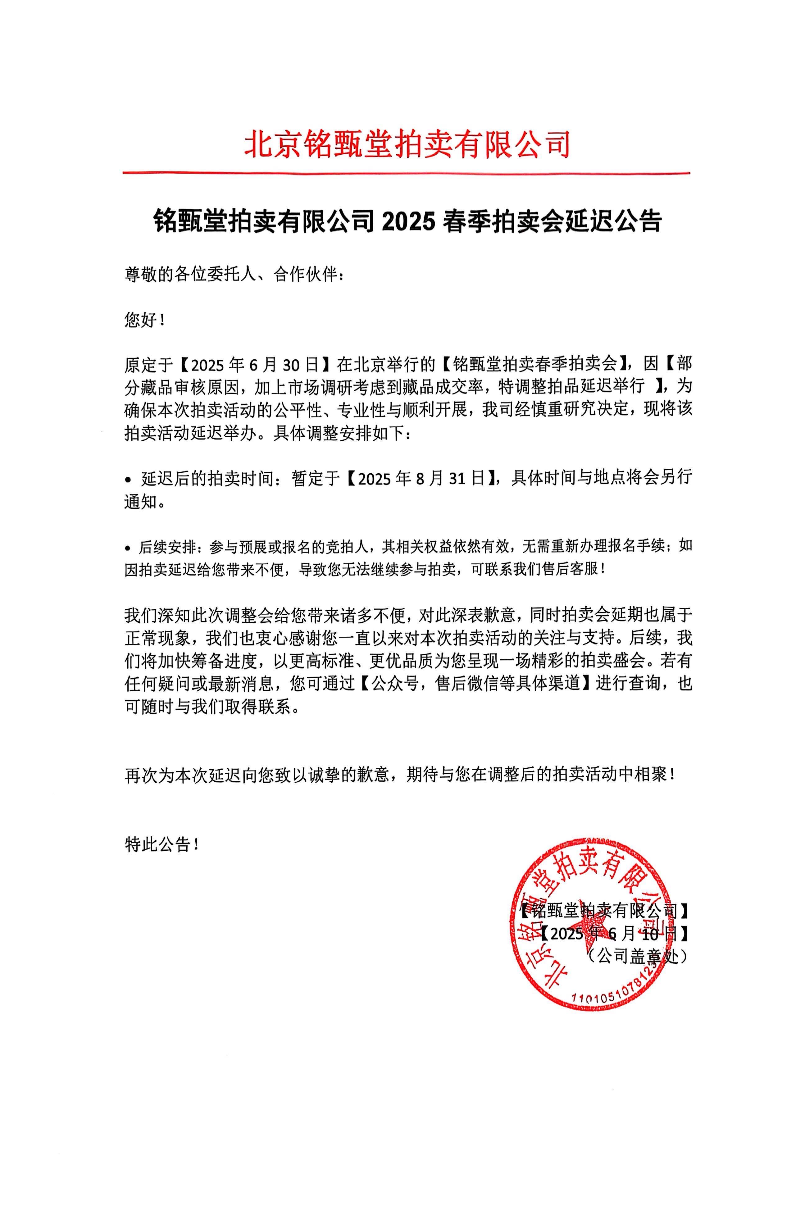 御铭堂拍卖有限公司2025年春季拍卖会延迟公告