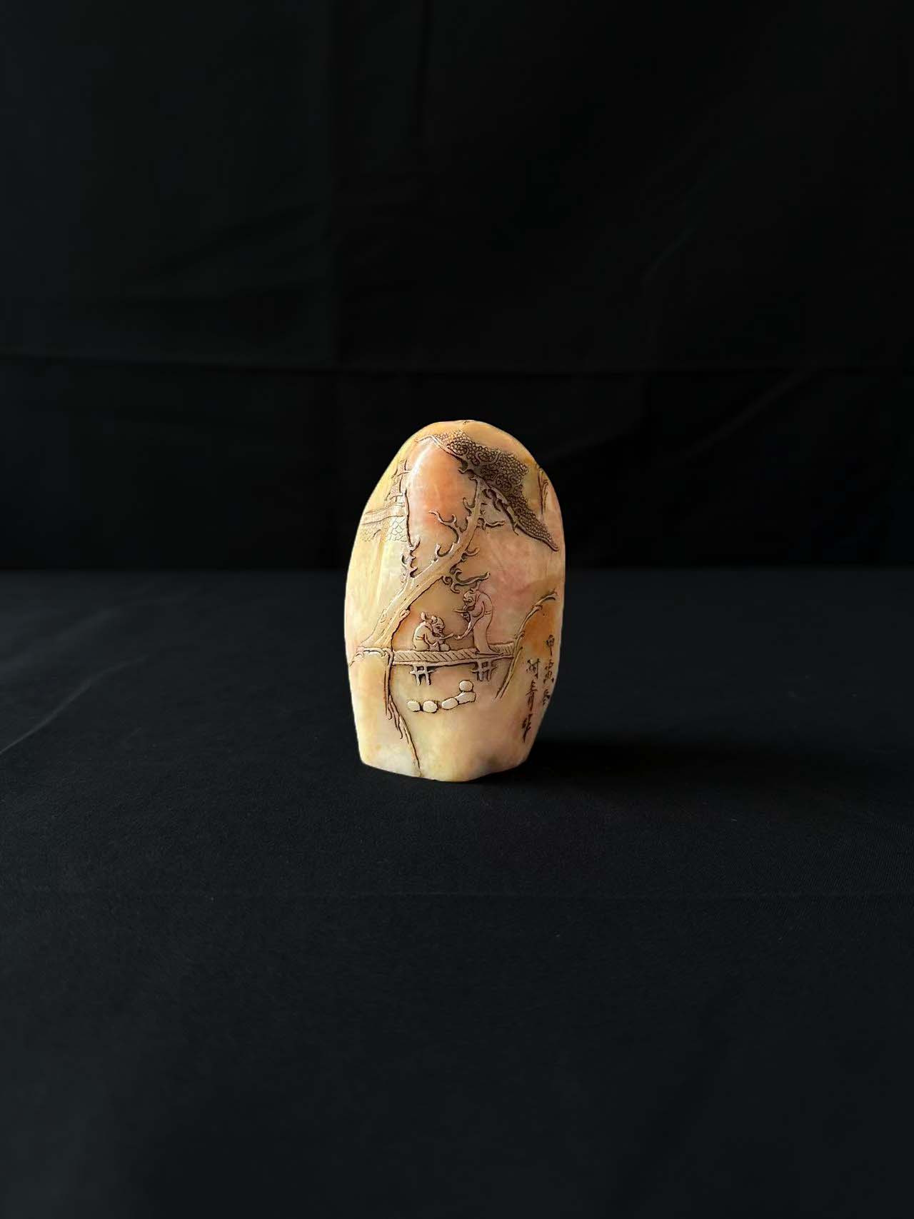 (浅浮雕),以细密线条勾勒纹饰,保留石材天然形态,风格清雅含蓄,符合传统文房器物的审美。