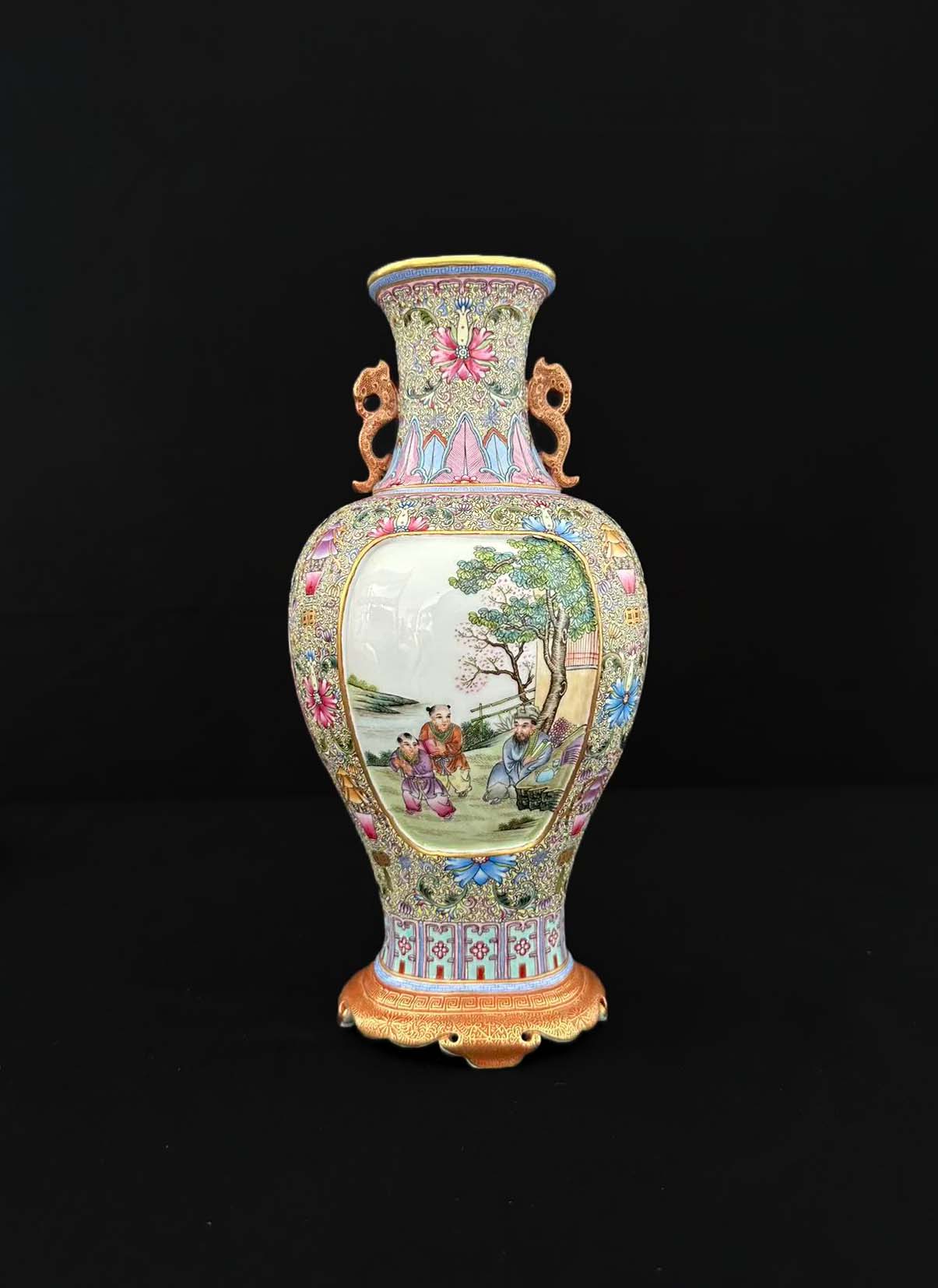 光内绘粉彩人物纹,颈部与足部辅以描金装饰,同时设双如意耳,是清代乾隆朝 “繁缛华丽” 装饰风格的典型体现。