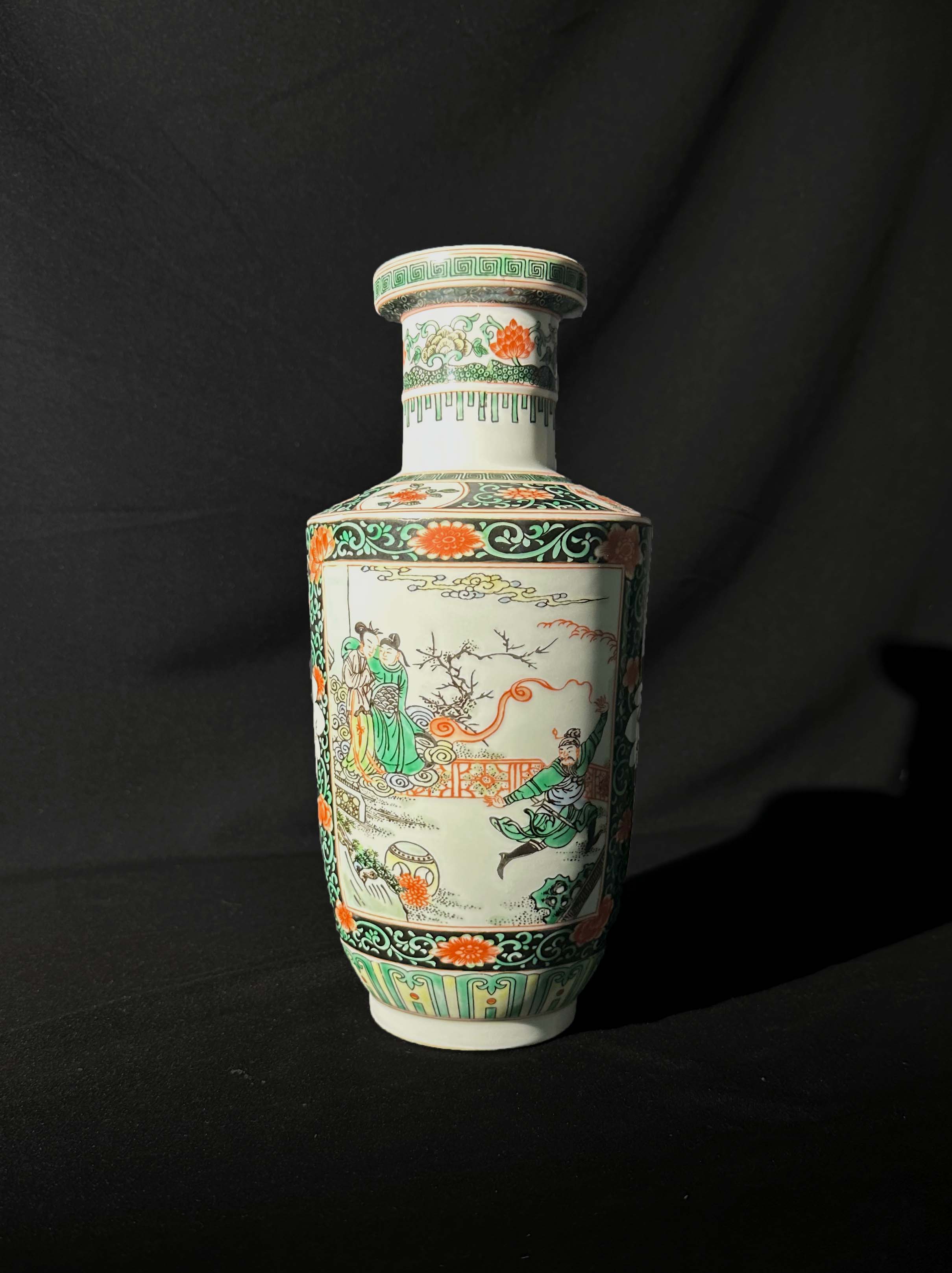 以白釉为地,绘制仕女图,画面展现古代女子游园、刺绣等生活场景,人物服饰色彩明快粉、黄、紫等,配景有柳树、桌案等,风格细腻写实。