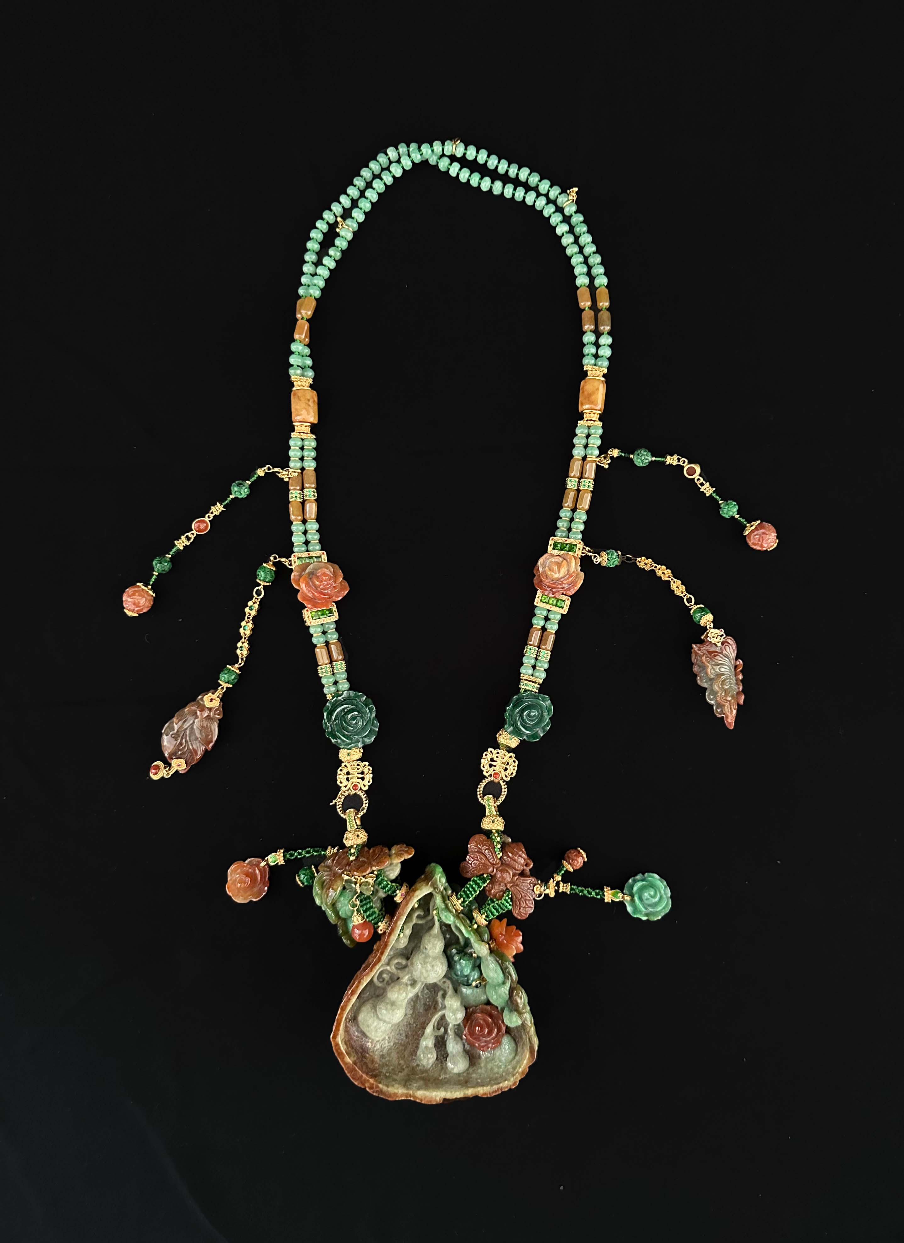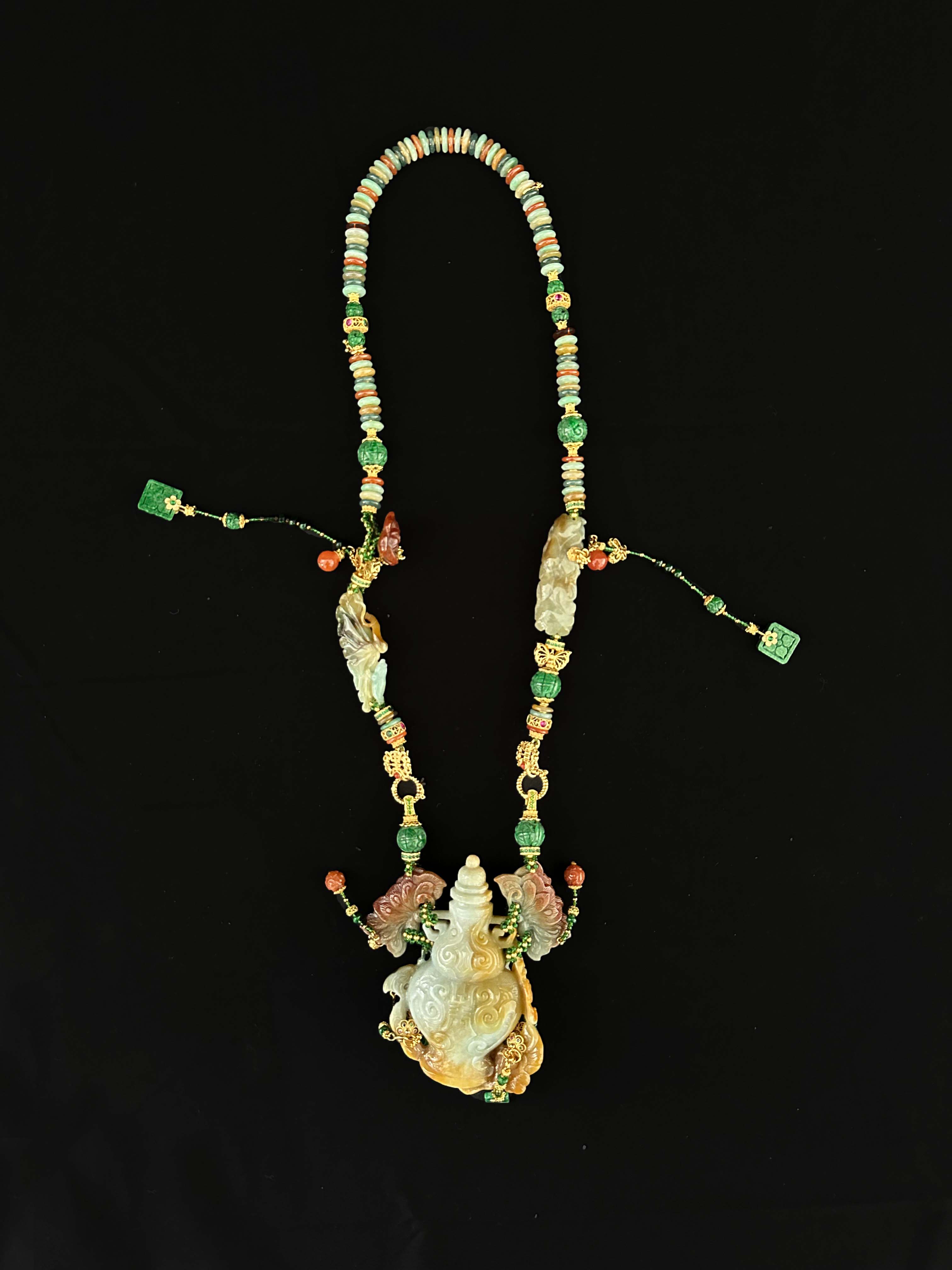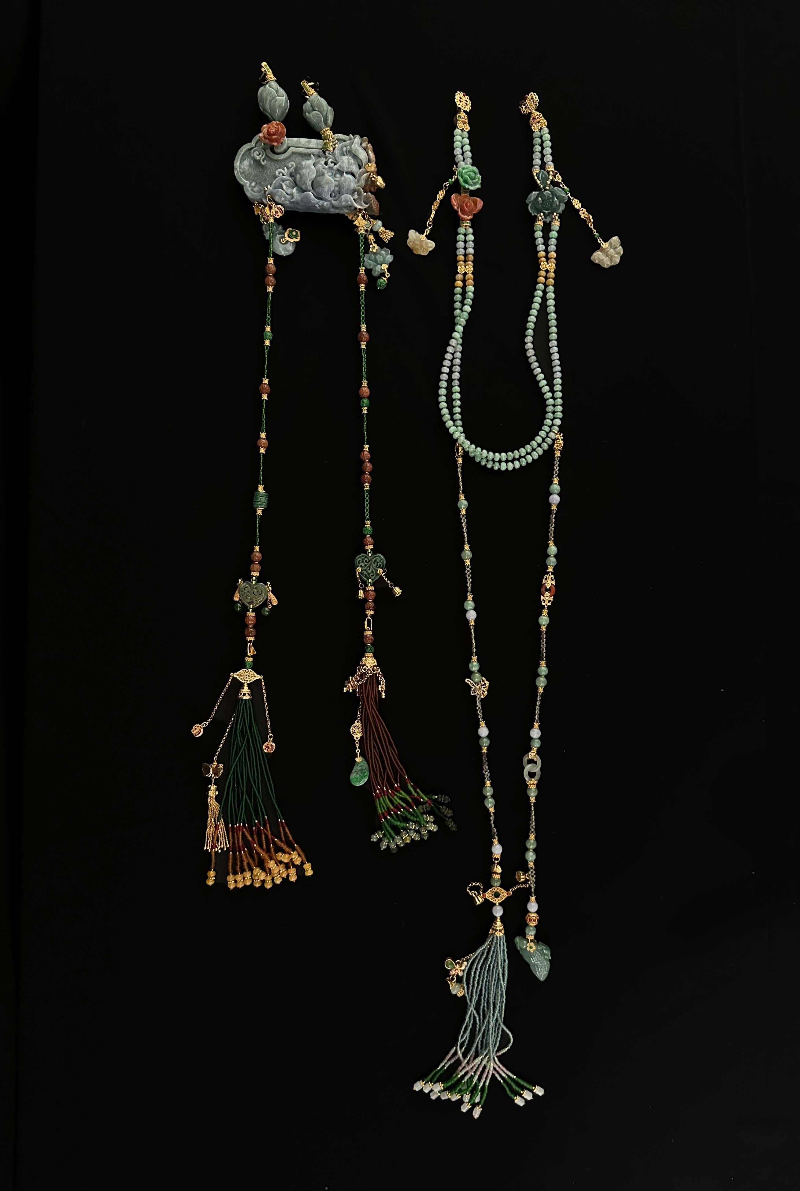 链身分三组,主链为 “翡翠珠 ,两侧副链为 “彩玉 + 金属配件”;