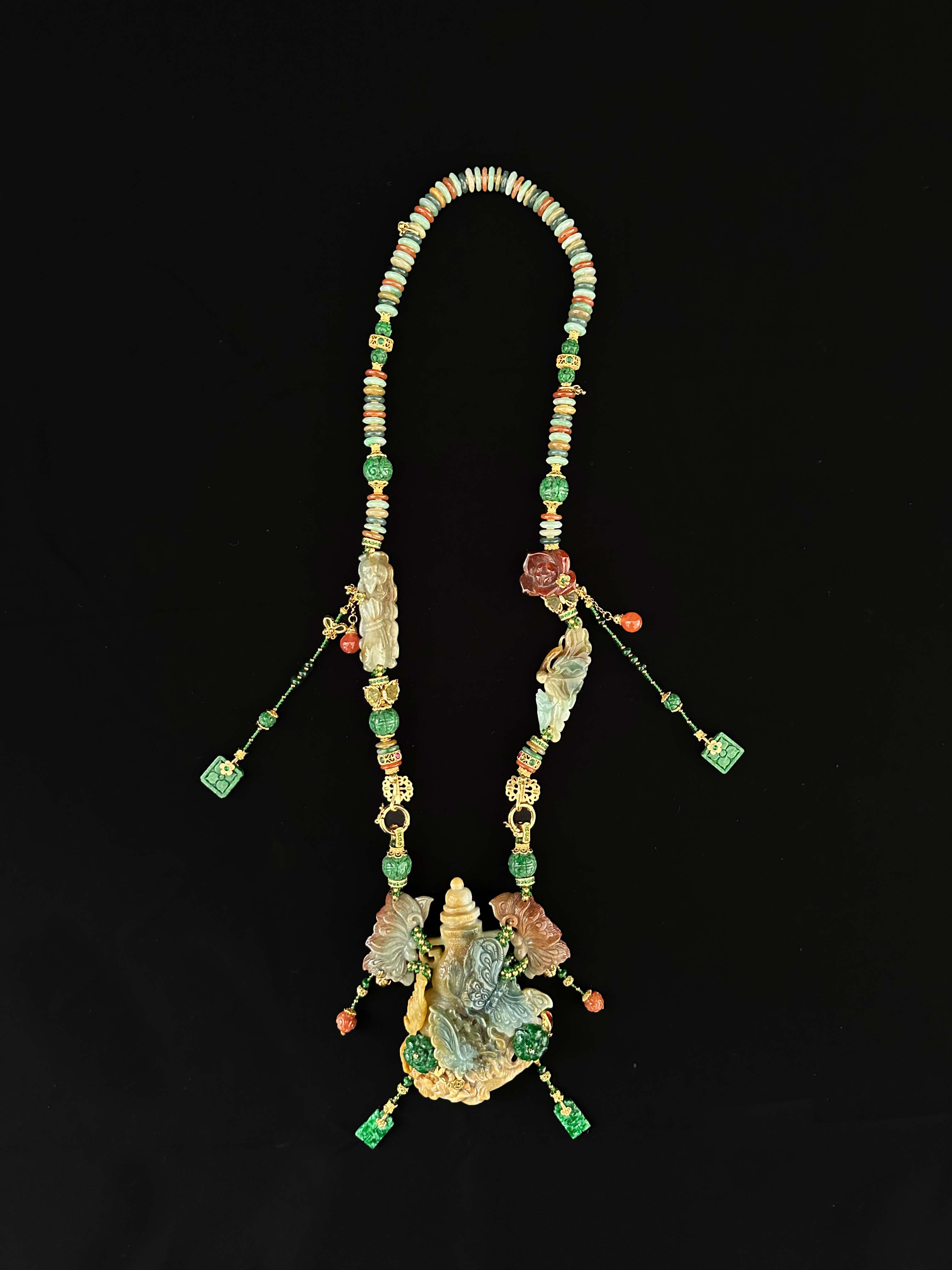 主体以 “彩玉 + 琉璃” 珠串为链身,配色含浅绿、橙黄、白色,色调柔和;