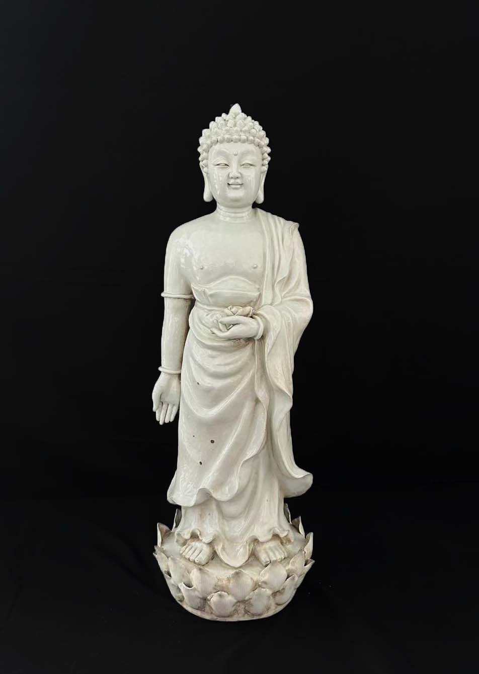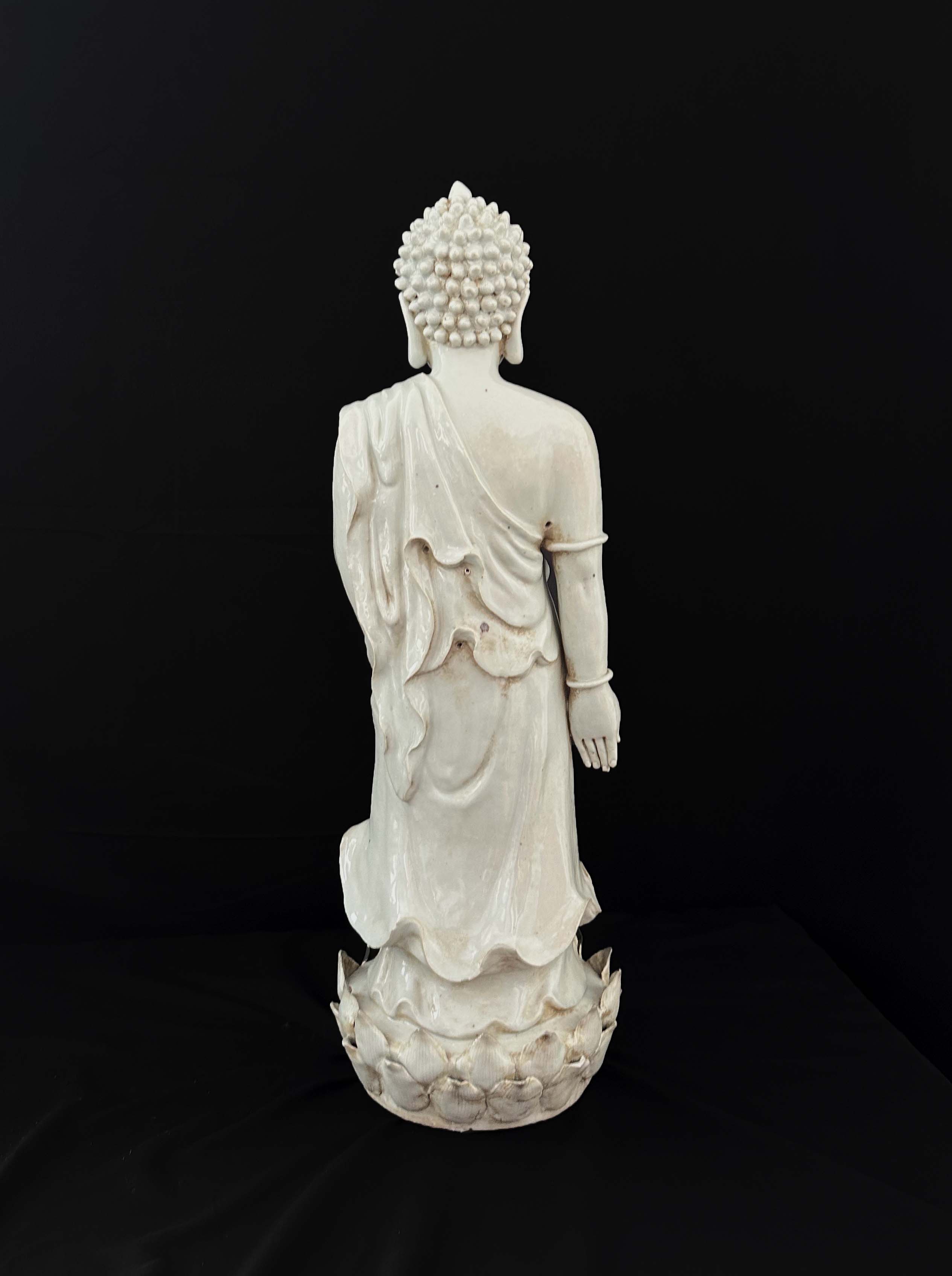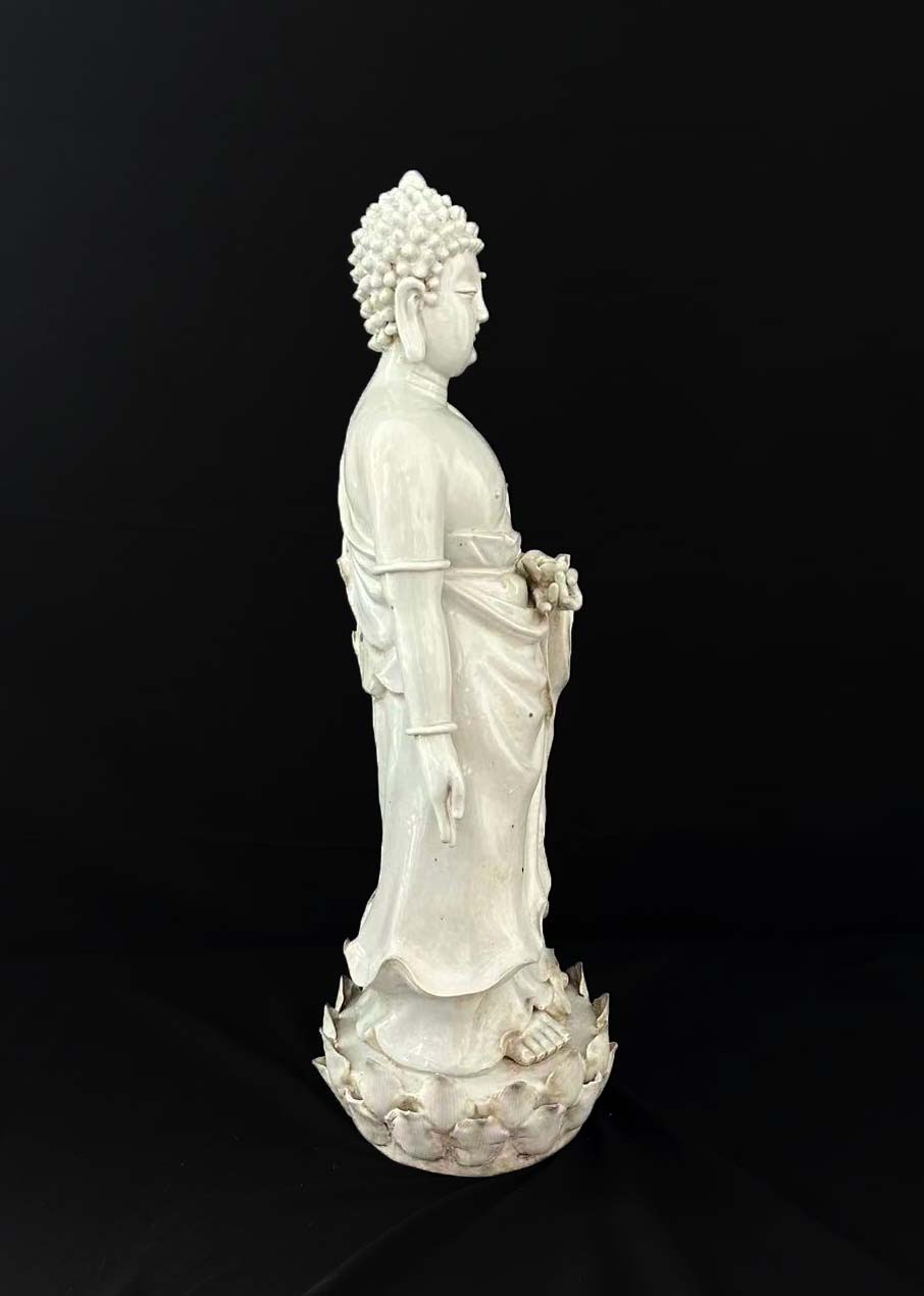 佛像螺髻发式、面相圆润,身披右肩覆体式袈裟,手持法器立于莲台之上,通体施白釉,通过刻划表现服饰褶皱,风格偏向写实装饰。