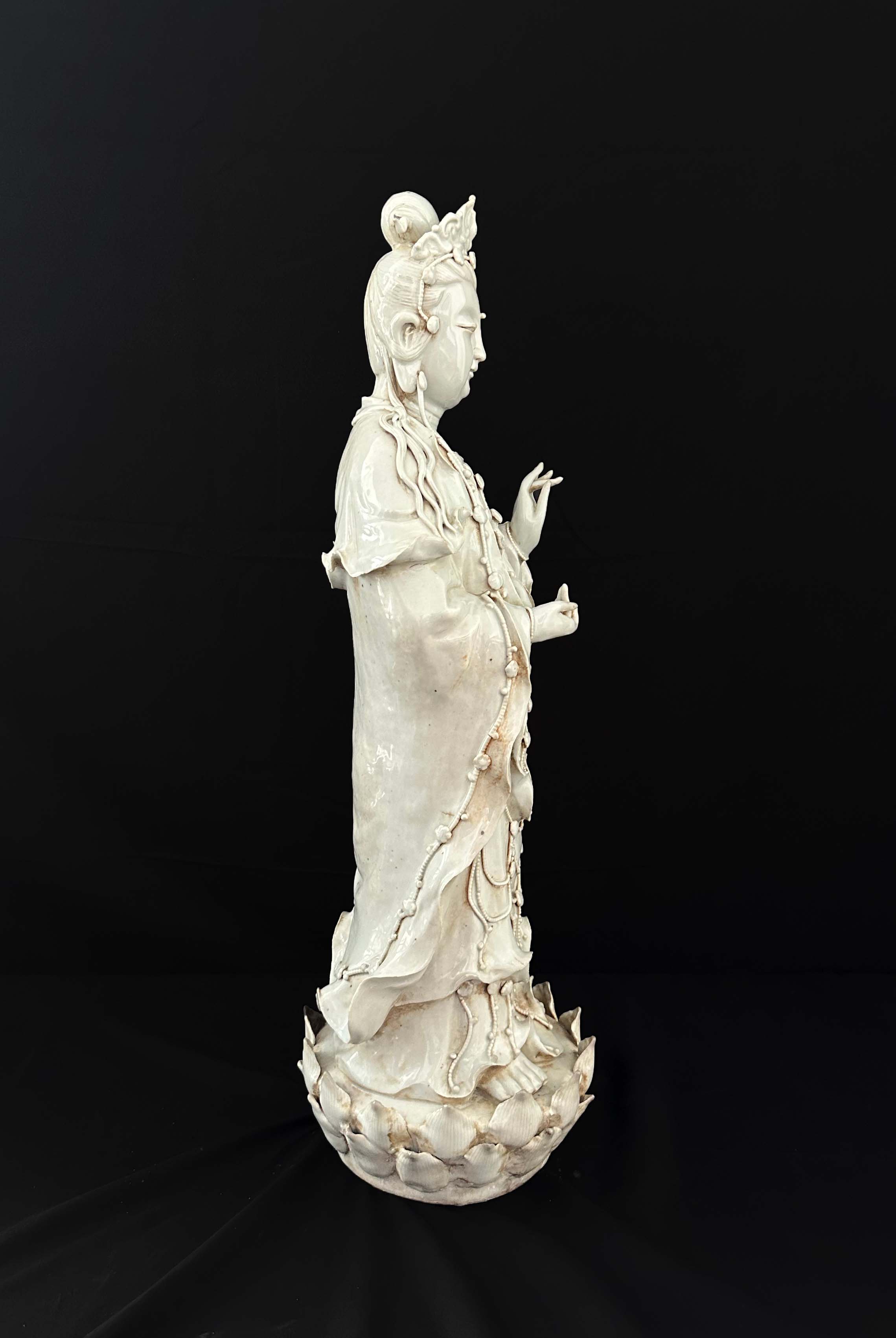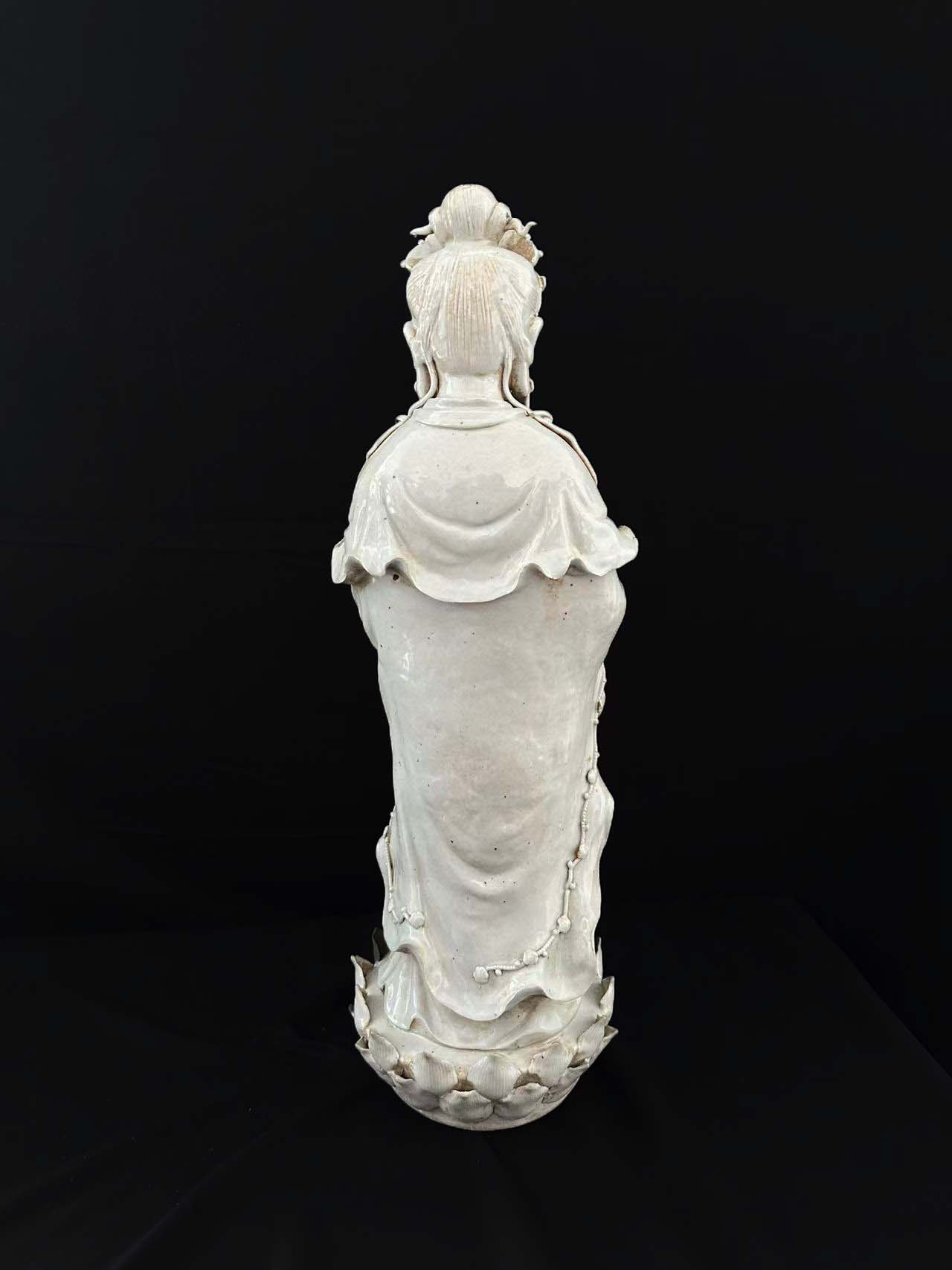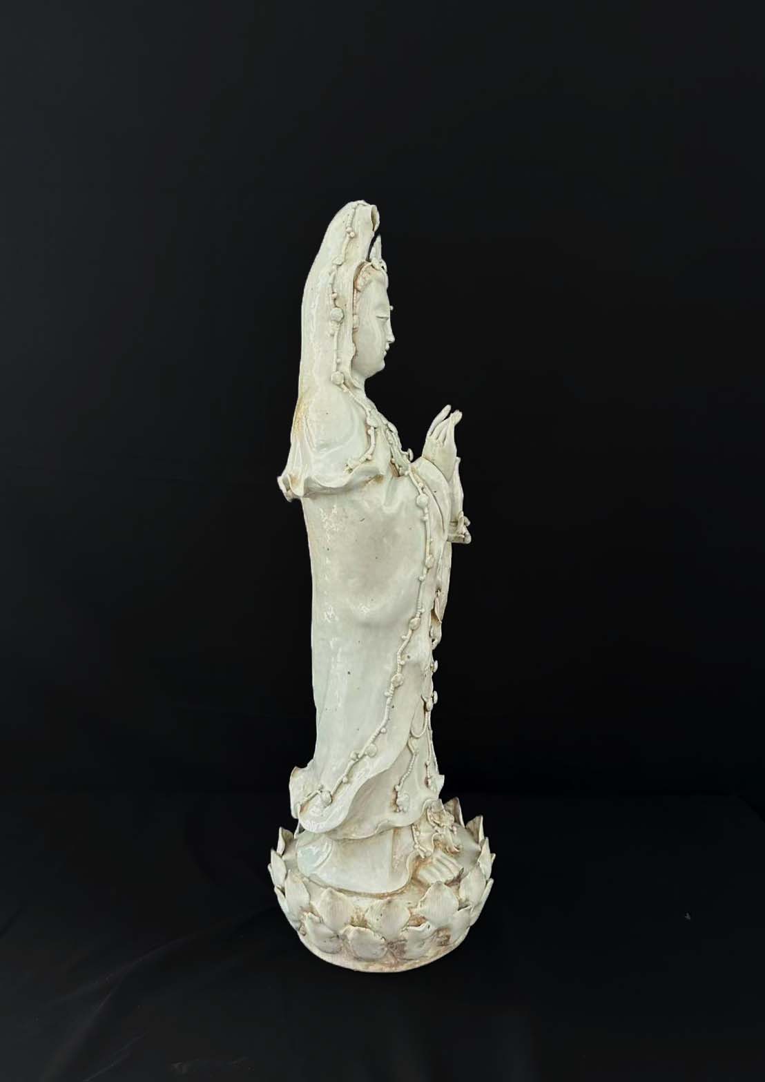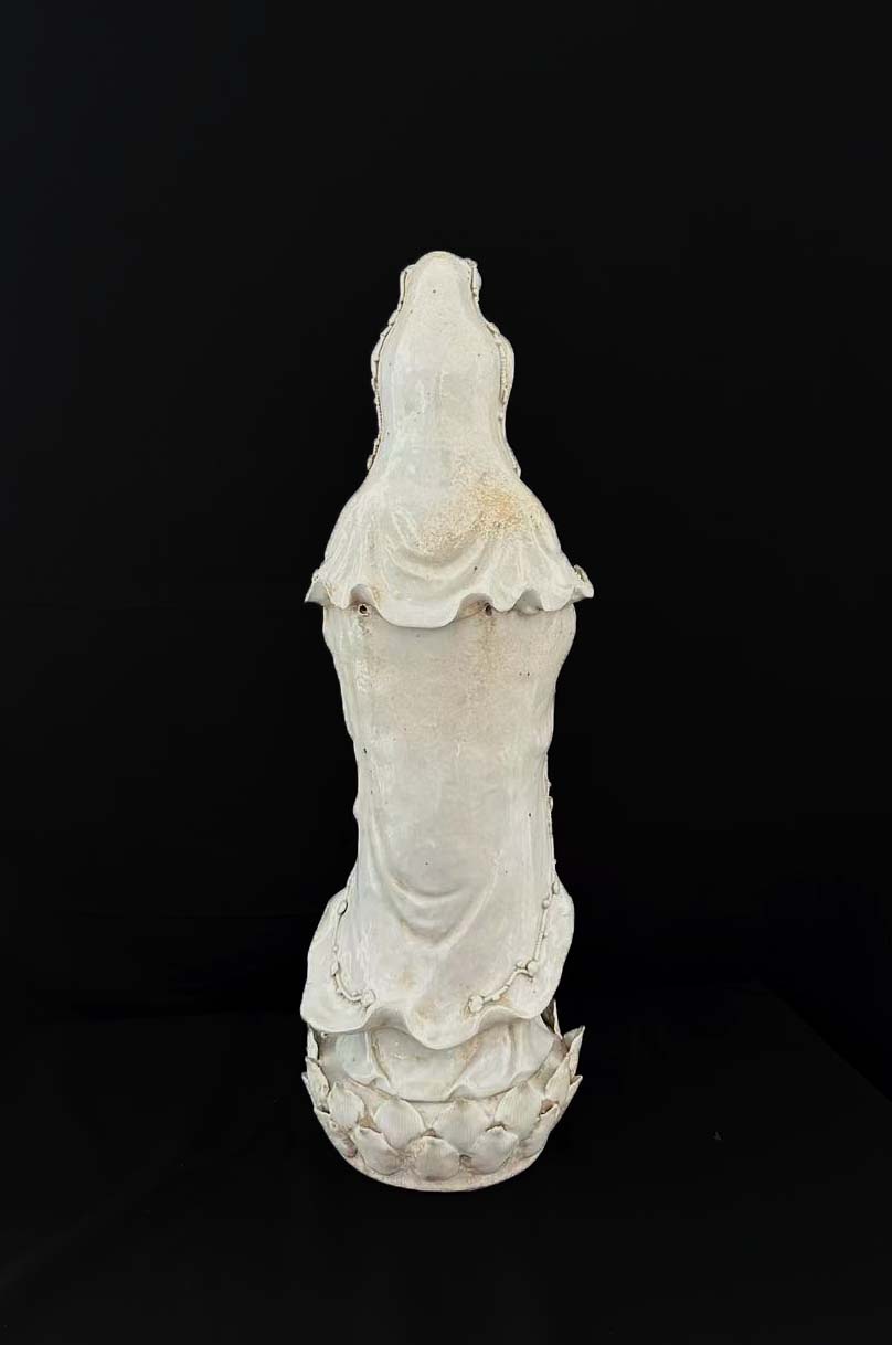 通体施白釉,通过刻划、堆塑表现服饰褶皱、璎珞细节,风格偏向写实与装饰结合。