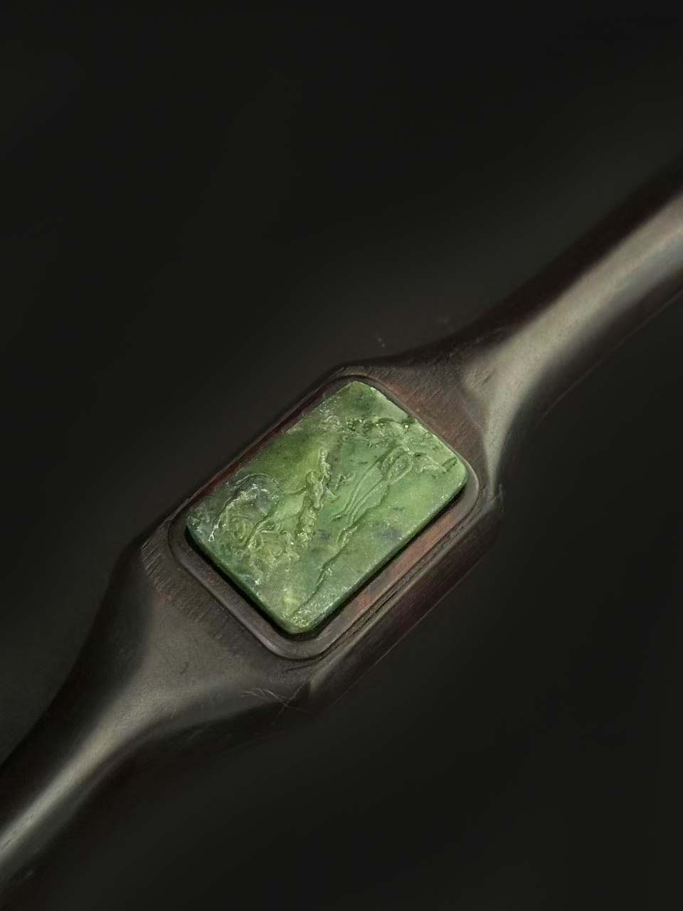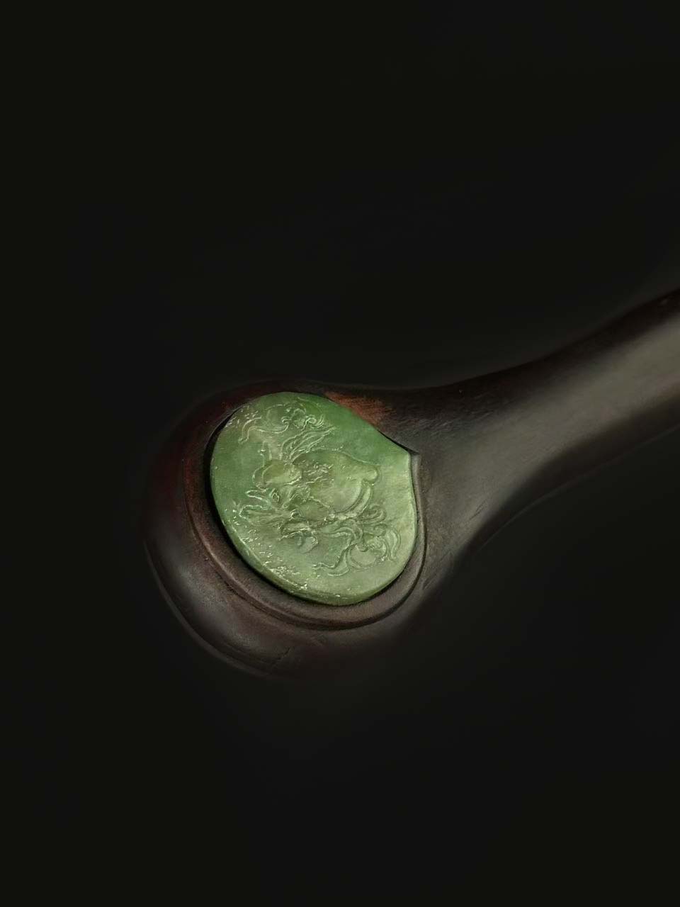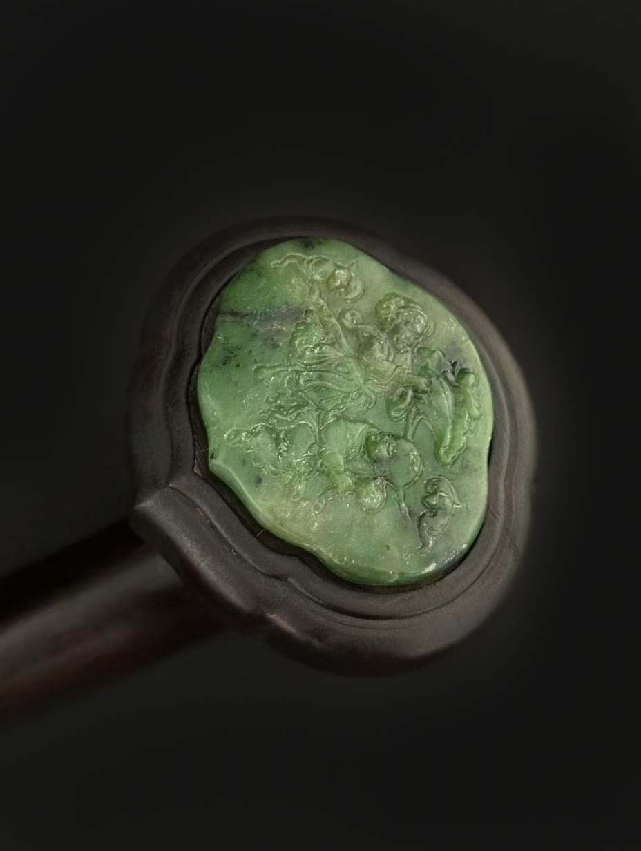 :呈菠菜绿色,质地细腻,分别镶嵌于如意的 “首”、“身”、“尾”三处,形成对称装饰。