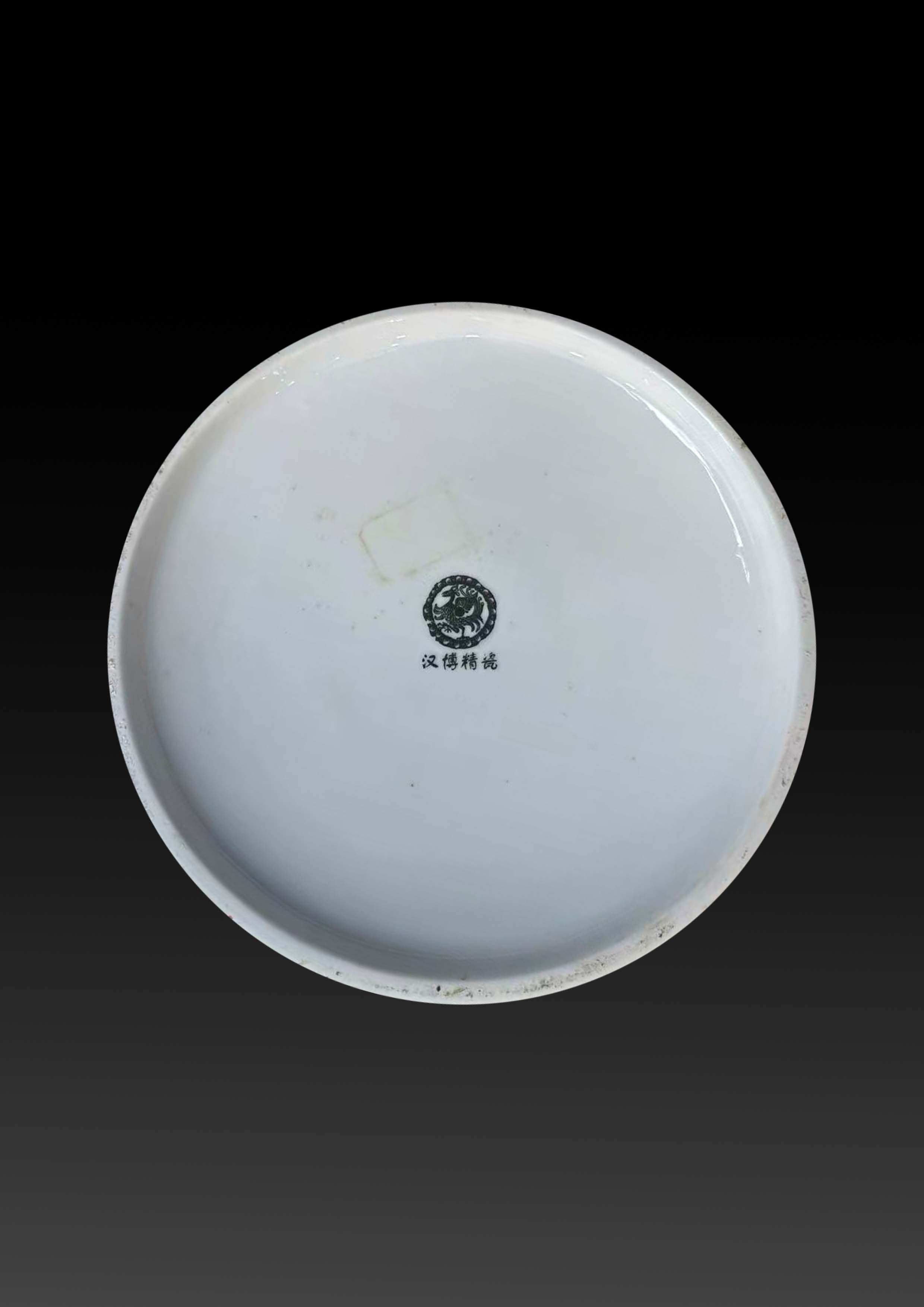 装饰采用新彩 / 粉彩工艺:色彩鲜艳明快,鸟雀、花卉的刻画细腻写实,背景的 “云纹 + 山水” 用晕染技法表现,兼具传统工笔花鸟的韵味与现代彩绘的视觉效果。