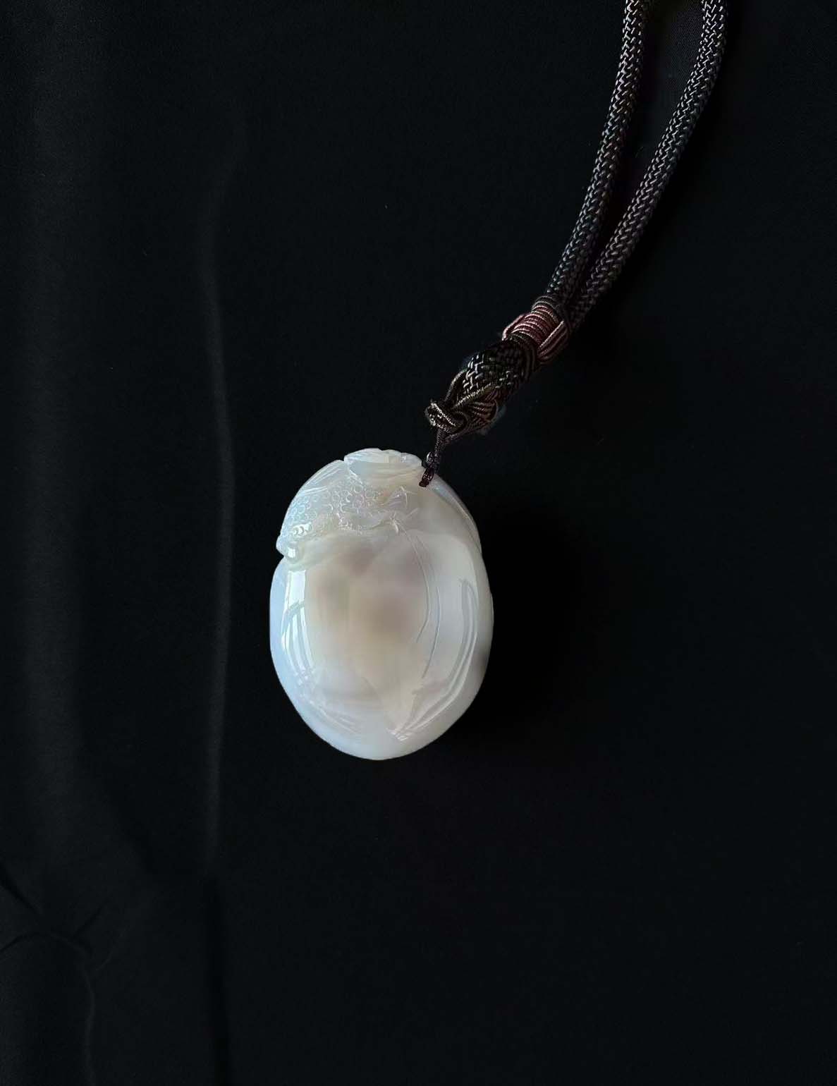 整体是 鹅蛋形,适合单手握持把玩,轮廓饱满流畅,尺寸小巧便携。采用浅浮雕工艺,表面雕刻了经典的 “福寿” 元素,搭配了蝙蝠纹饰,雕刻线条细腻流畅,图案和玛瑙本身的质感融合得很自然,既保留了玛瑙的温润底色,又通过浮雕增加了立体层次感。仅供参考 自行甄别