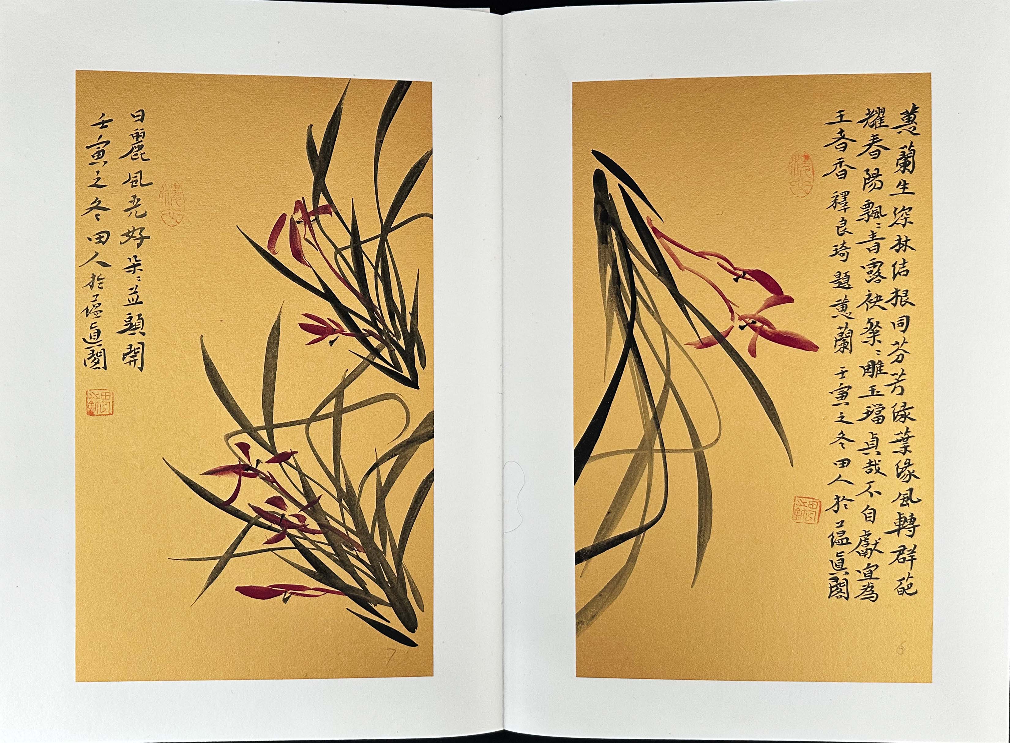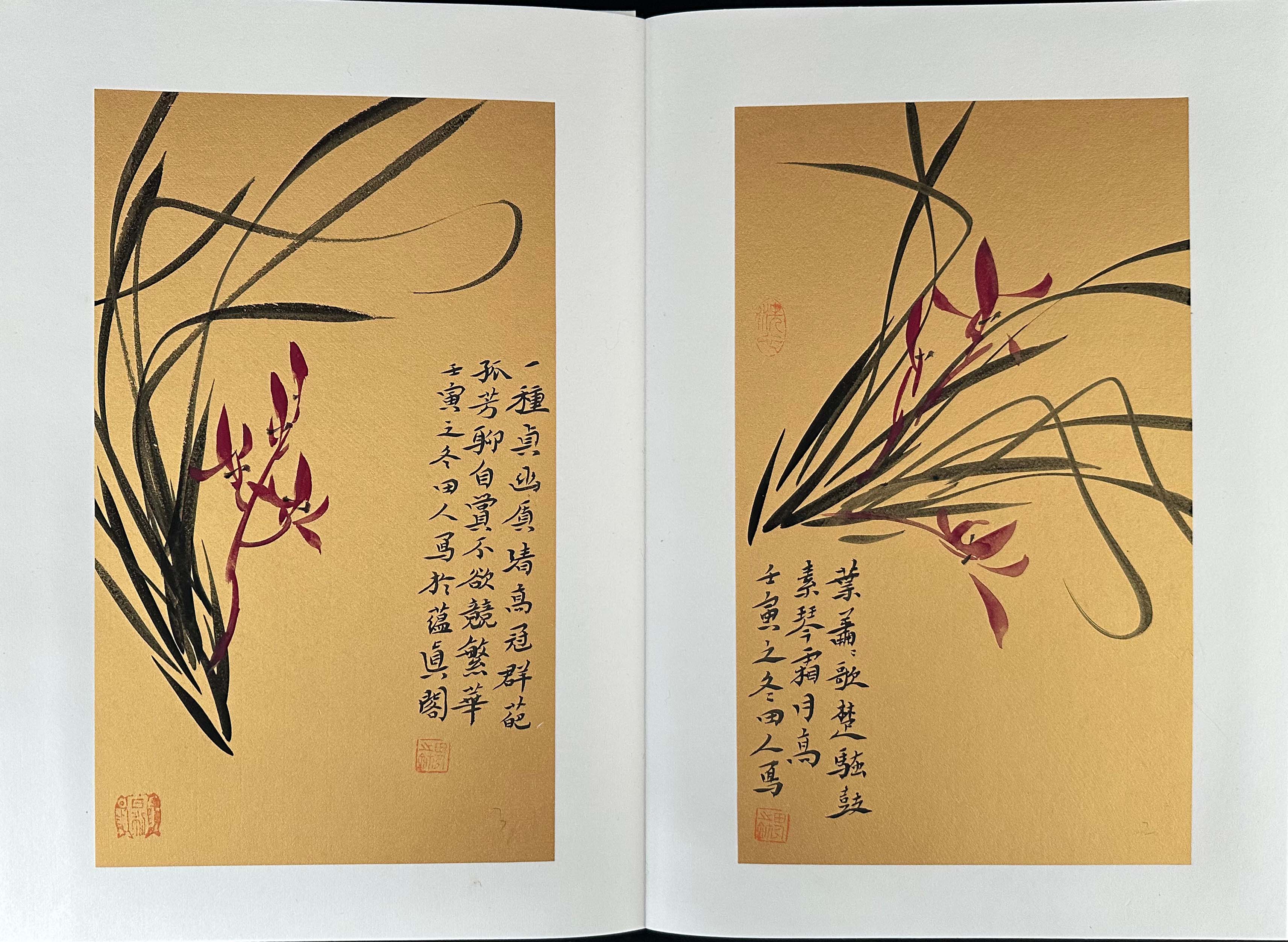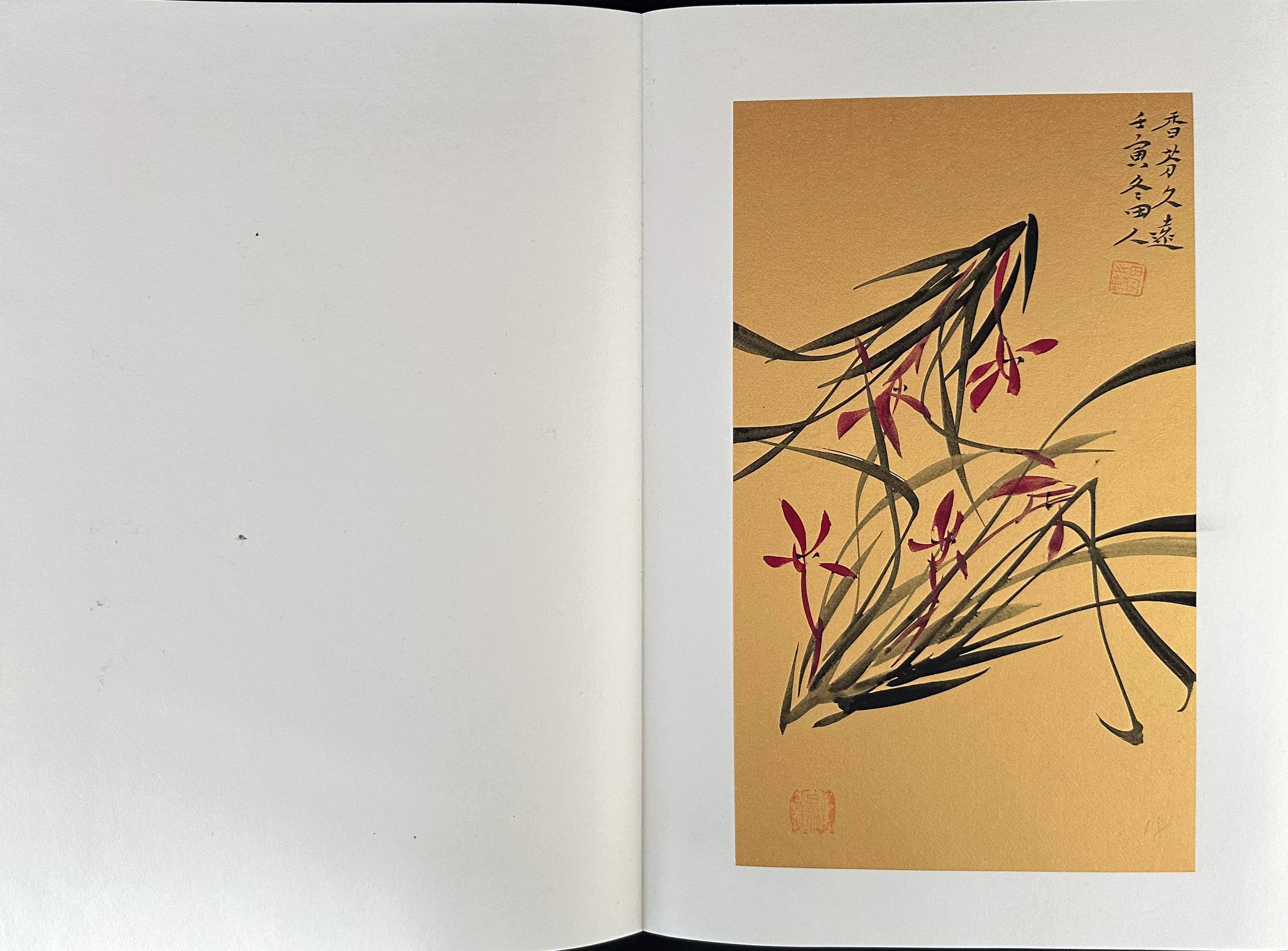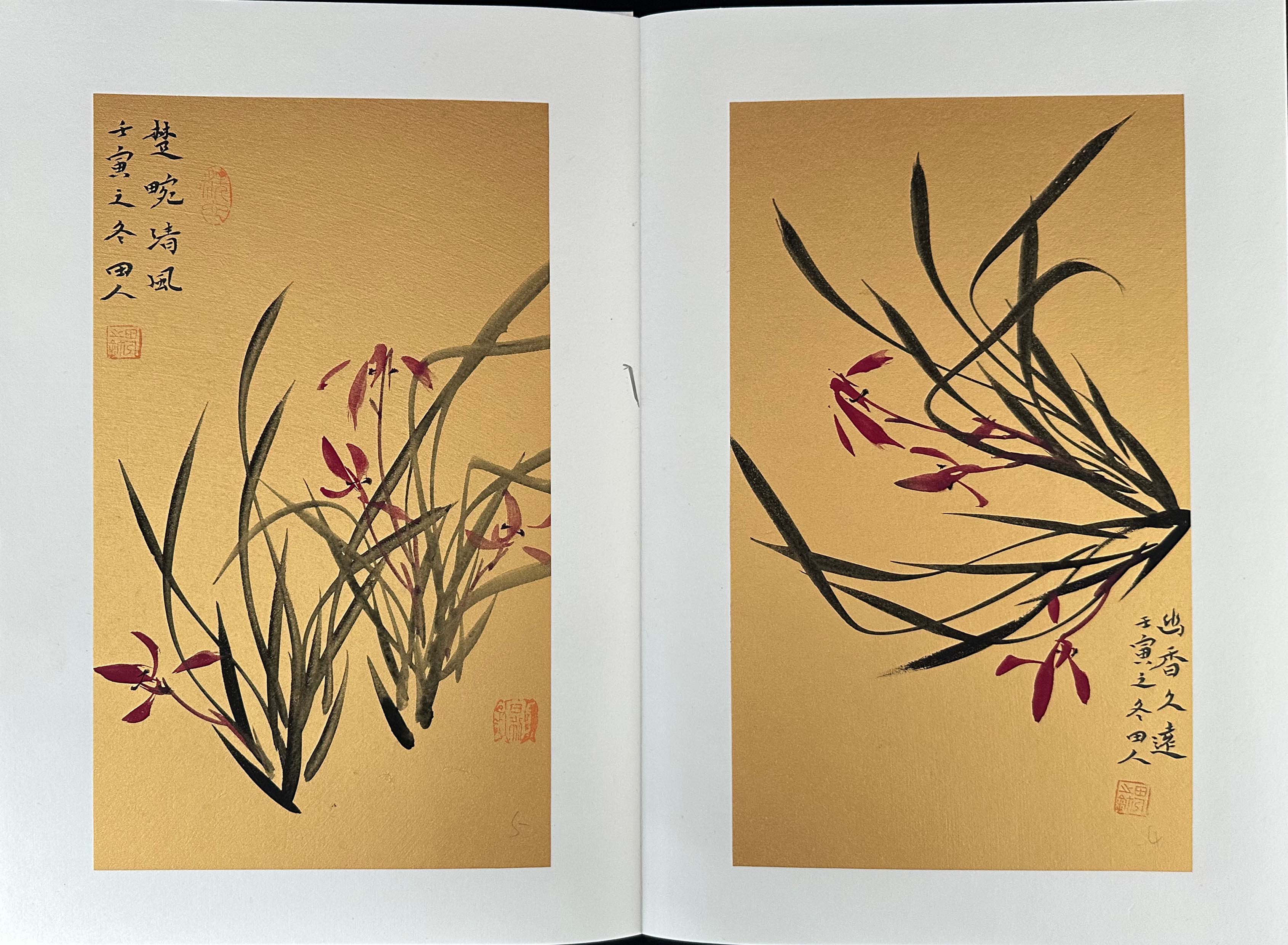 以 “兰花” 为主题,水墨绘兰叶,搭配朱红花朵