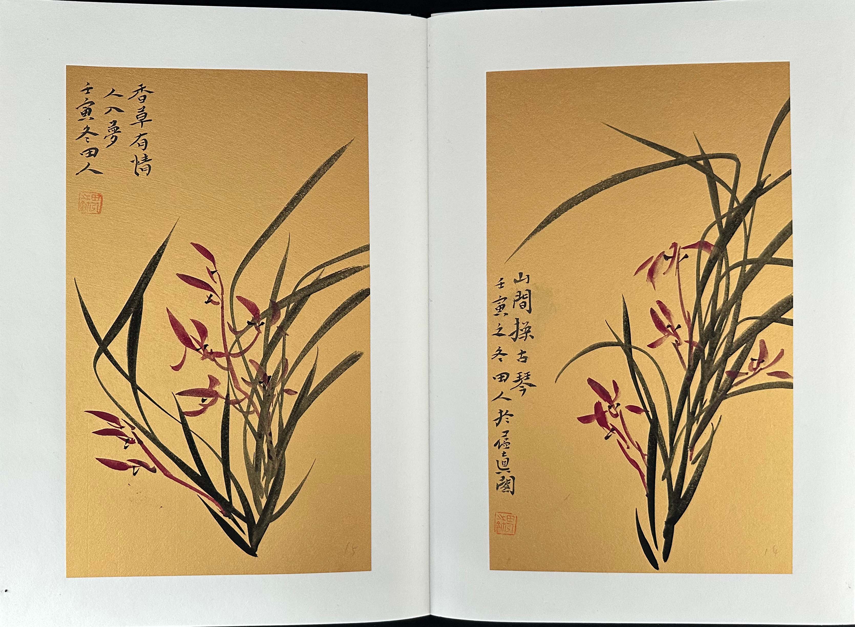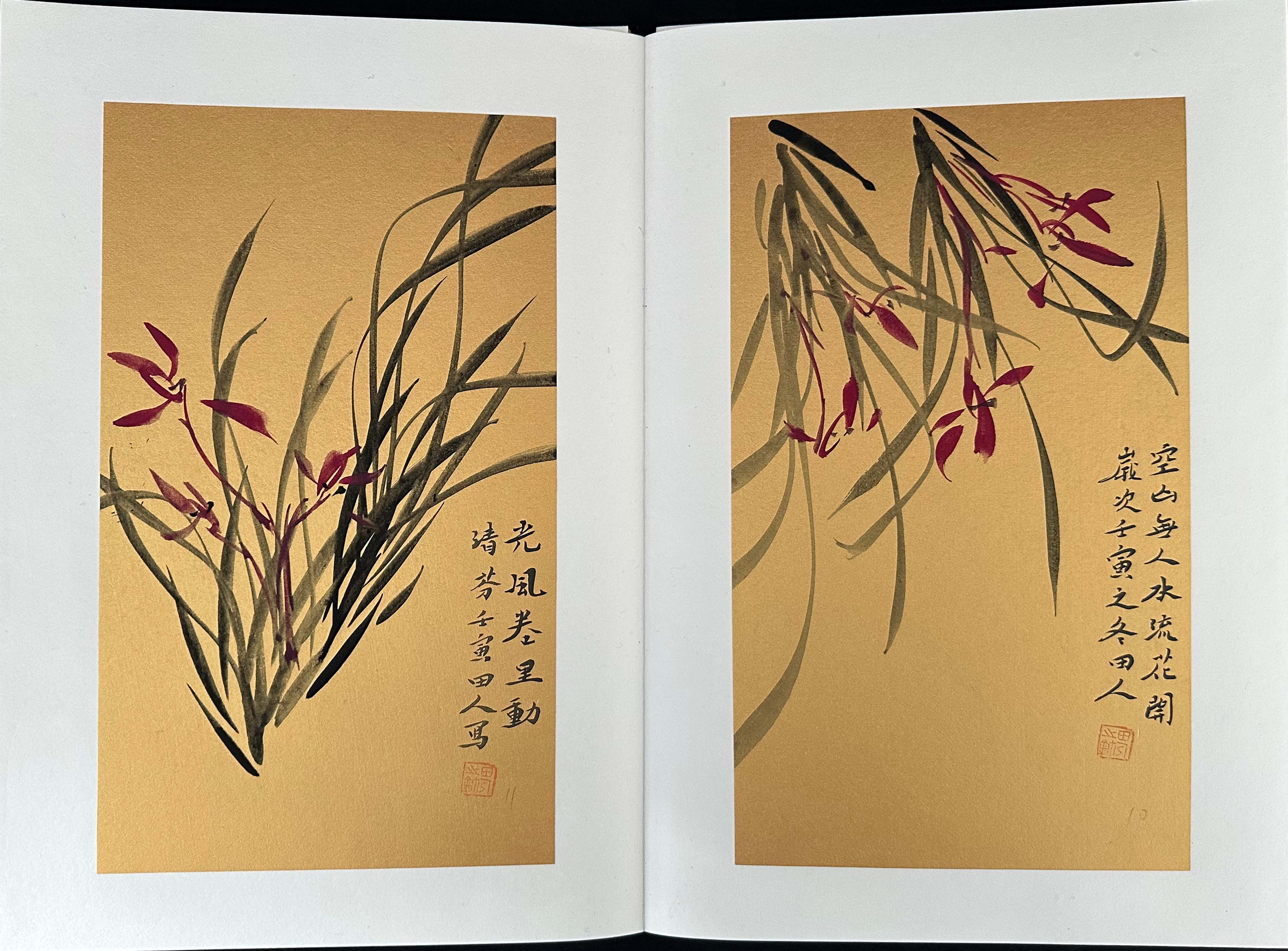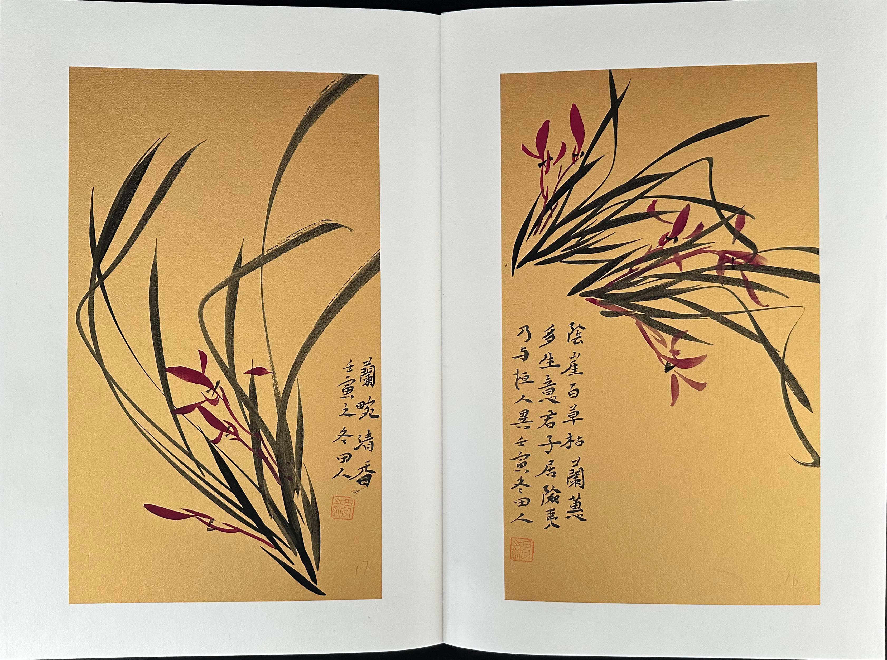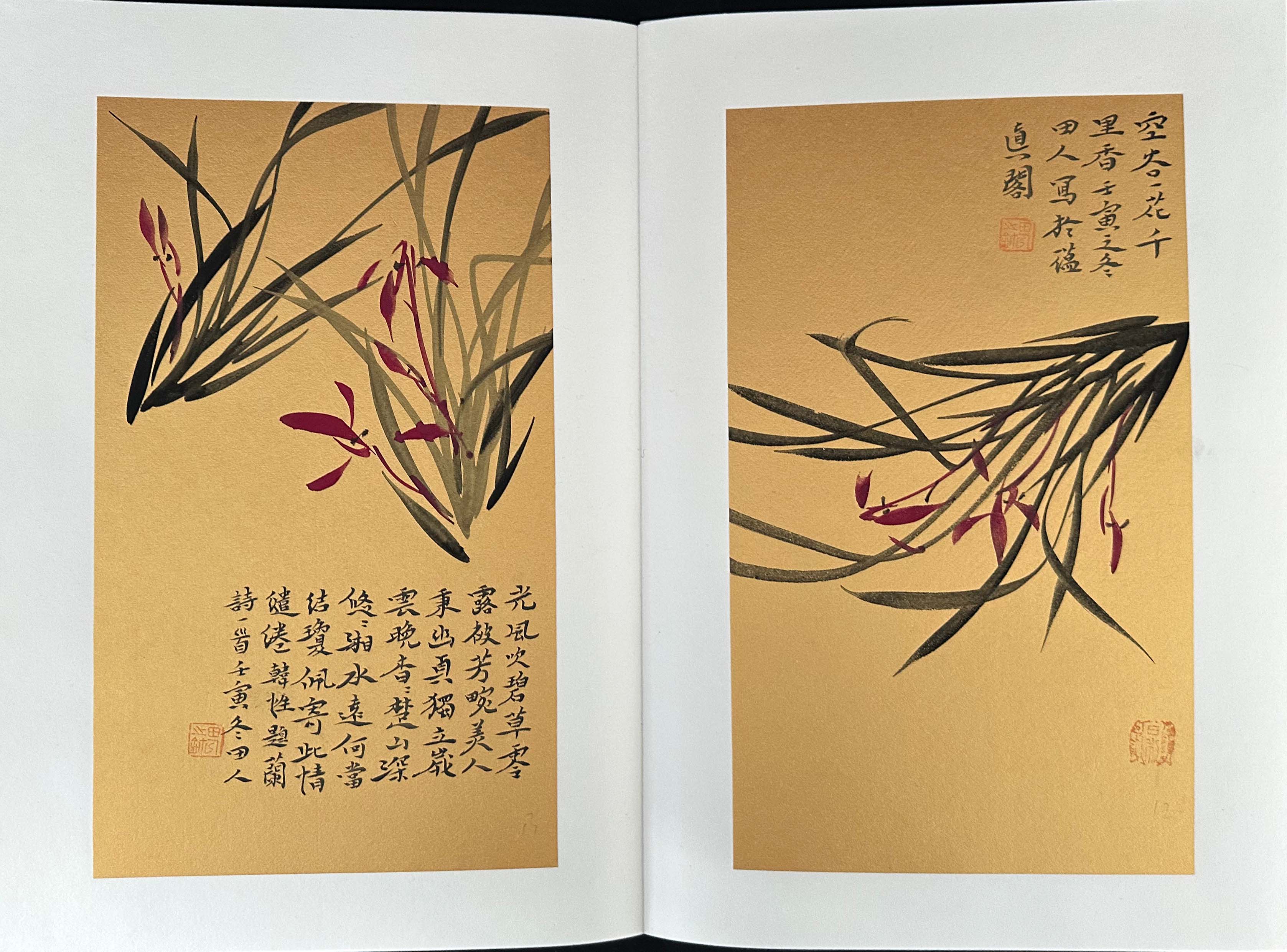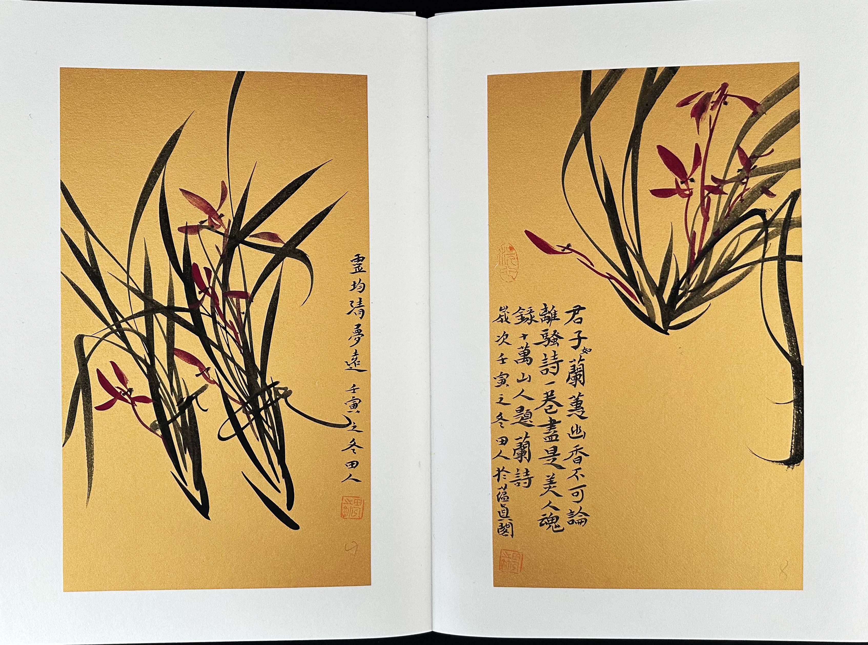 以 “兰花” 为主题,水墨绘兰叶,搭配朱红花朵
