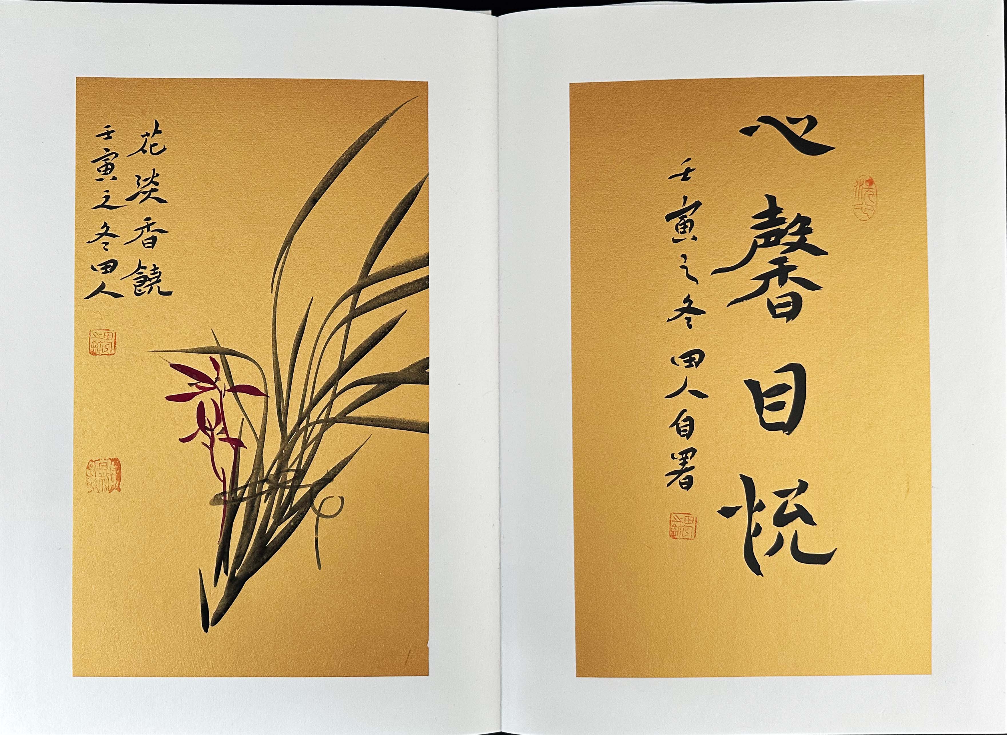 载体为金笺纸,底色华贵,与水墨、朱红形成鲜明对比,增强视觉层次;