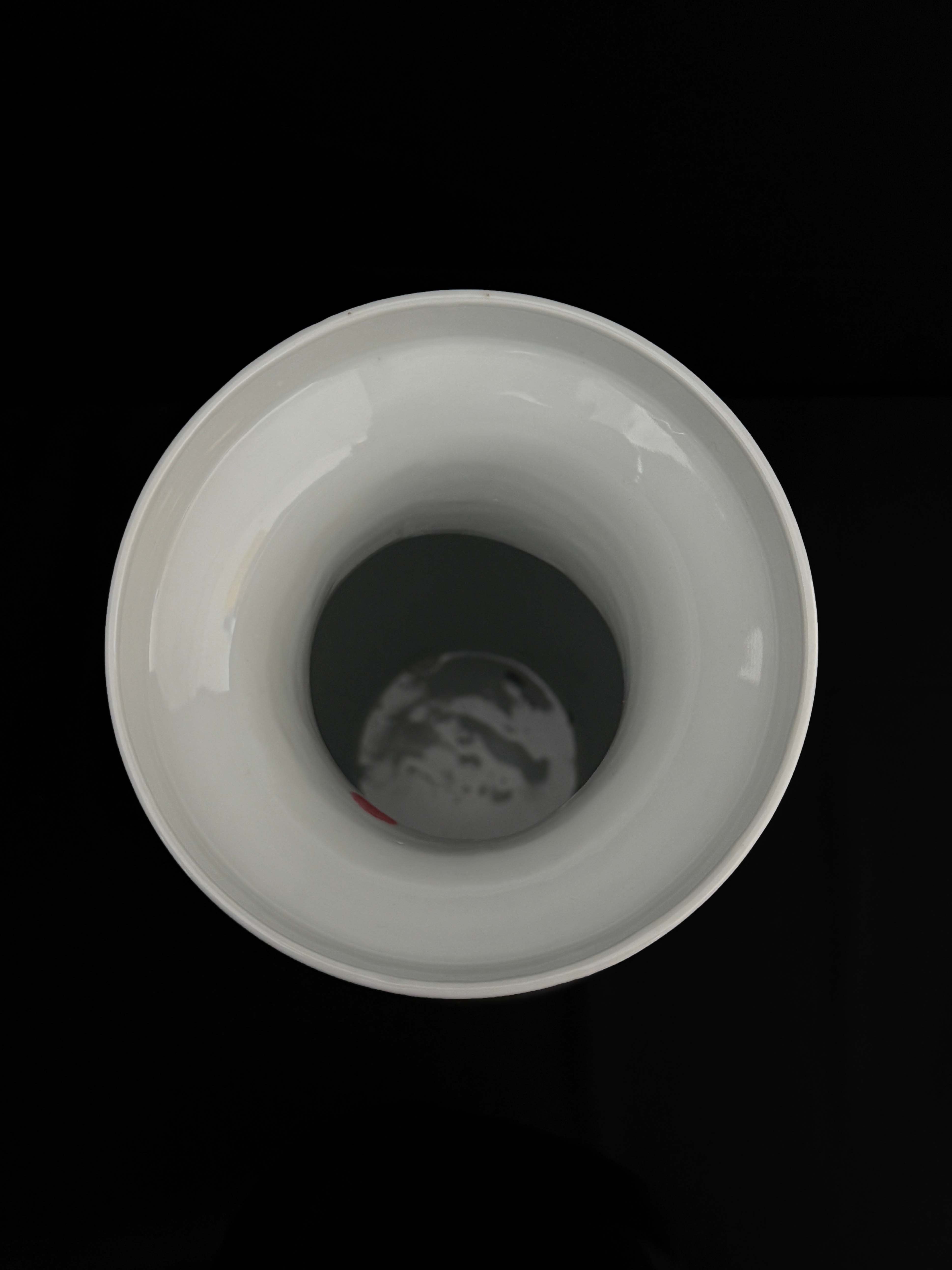 为敞口长颈瓶造型,颈部饰缠枝花卉纹,底部有装饰边纹,胎质洁白细腻,釉面光洁。