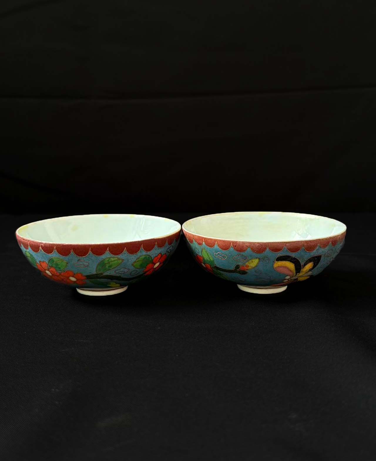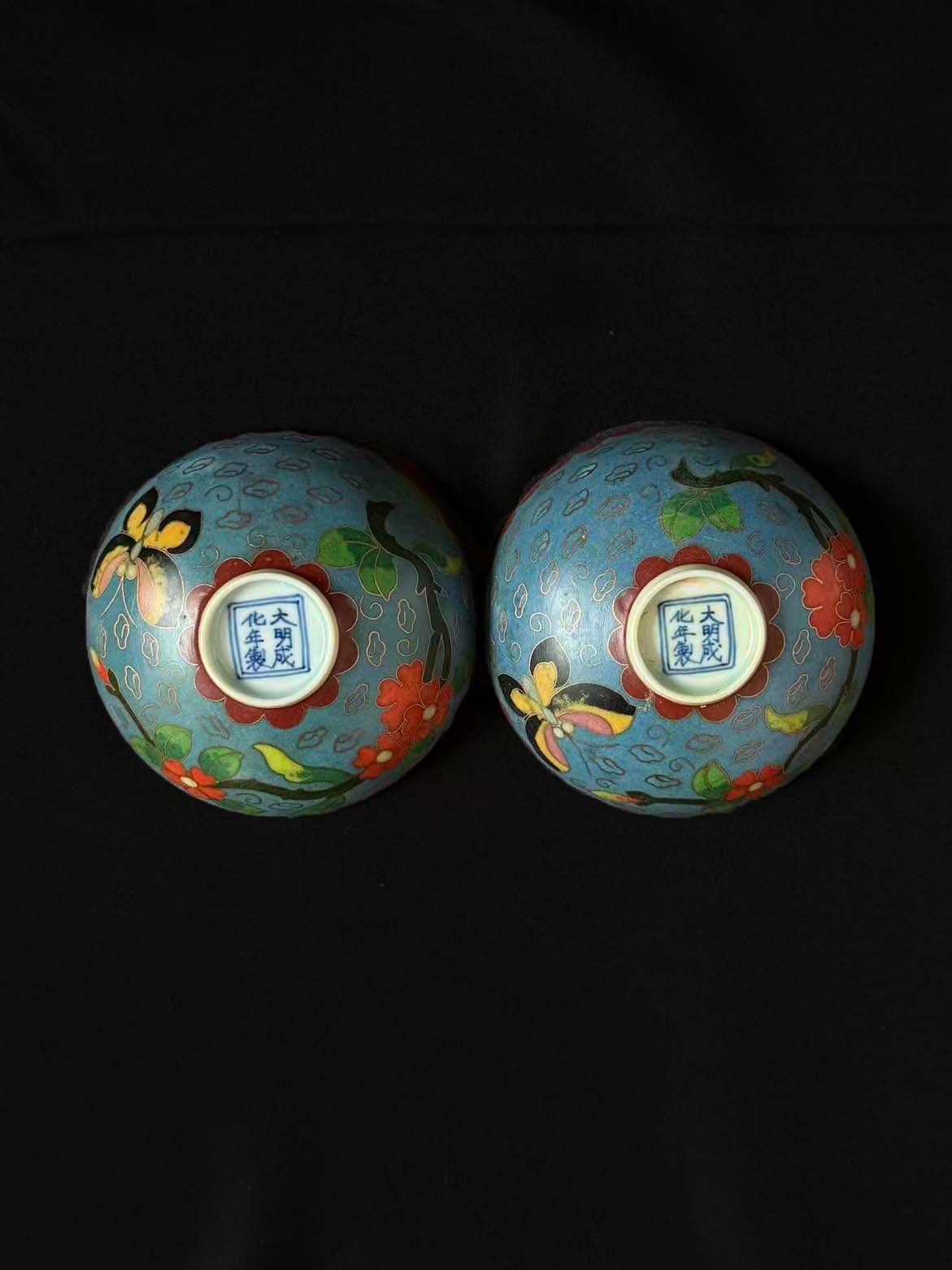 碗口装饰红色莲瓣纹,碗身以以天蓝色为地,绘制花卉、蝴蝶纹样,纹饰色彩鲜艳(红、绿、黄、黑等),线条勾勒清晰,还原了