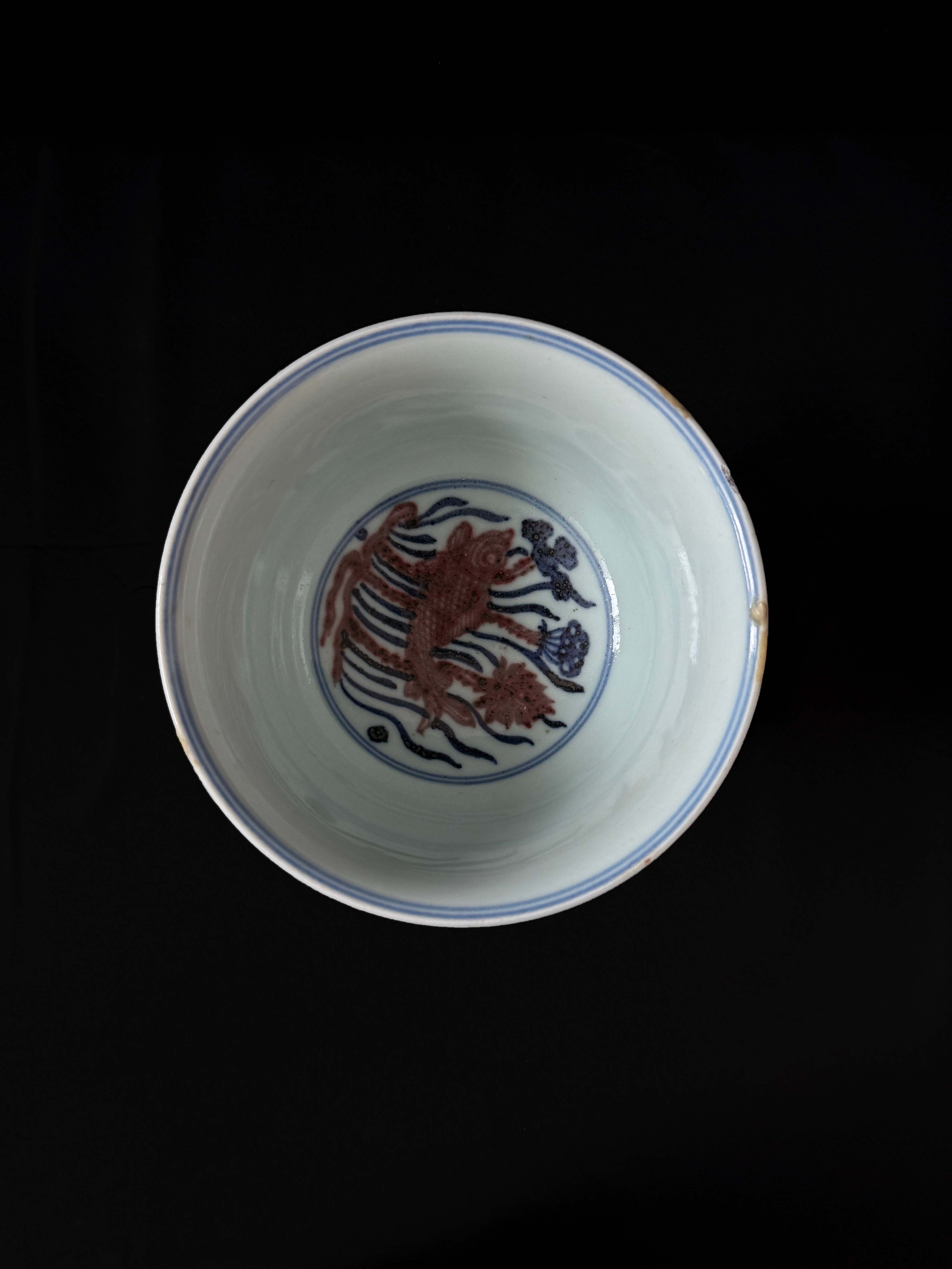 ”,画面绘游鱼穿梭于荷花、水草之间,“鱼” 谐音 “余”,“莲” 谐音 “连”,组合成 “连年有余” 的吉祥寓意,是传统瓷器的经典装饰题材。