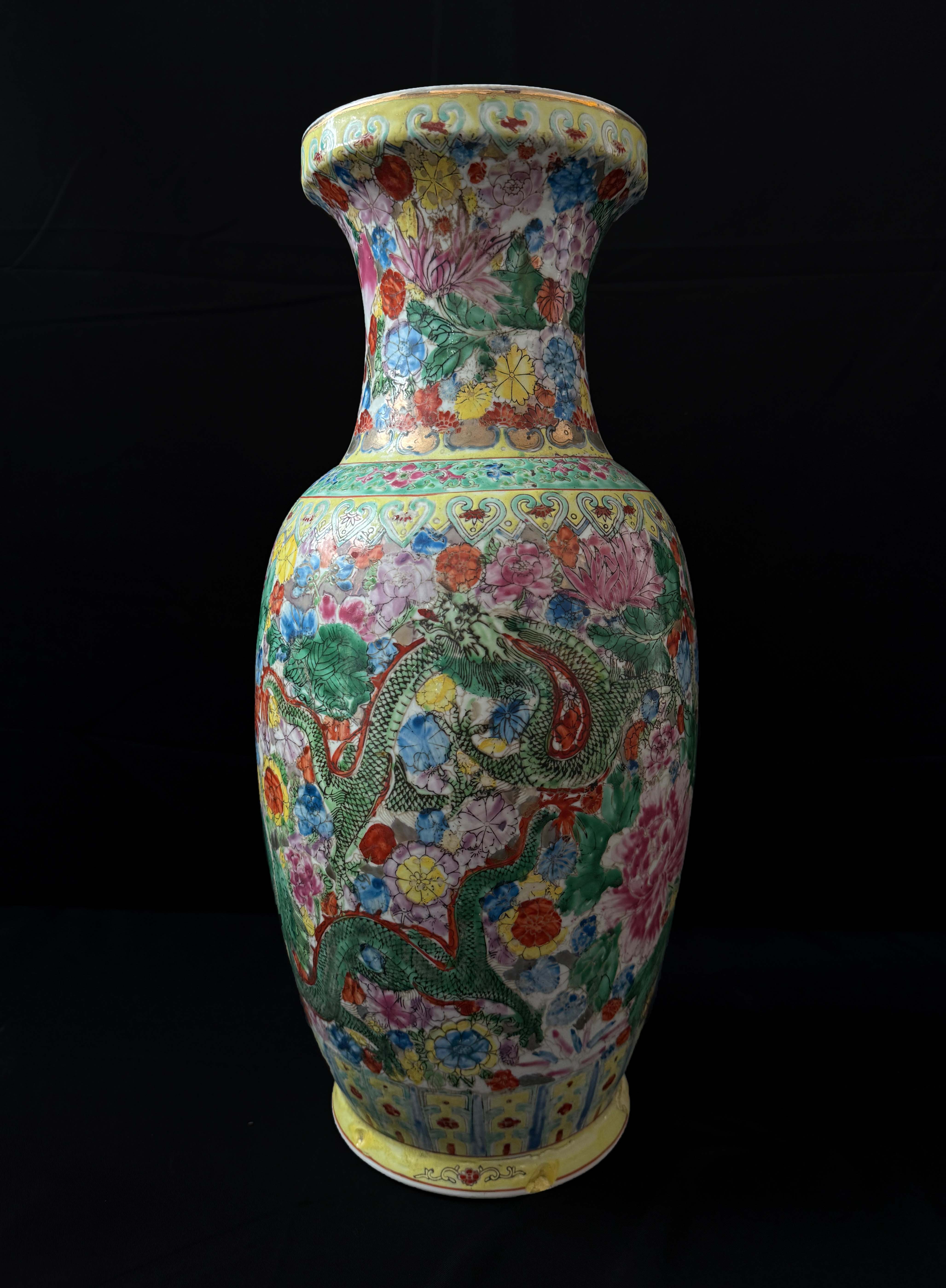 采用 “万花地”,百花不露地装饰风格,以密集花卉为底,搭配龙纹图案,色彩艳丽饱满。主体纹饰为 “龙纹 + 百花纹”:龙纹是传统瓷器的尊贵题材,象征权威与祥瑞;百花纹寓意 “繁花似锦、富贵满堂”,二者结合强化了吉祥华贵的主题。仅供参考 自行甄别