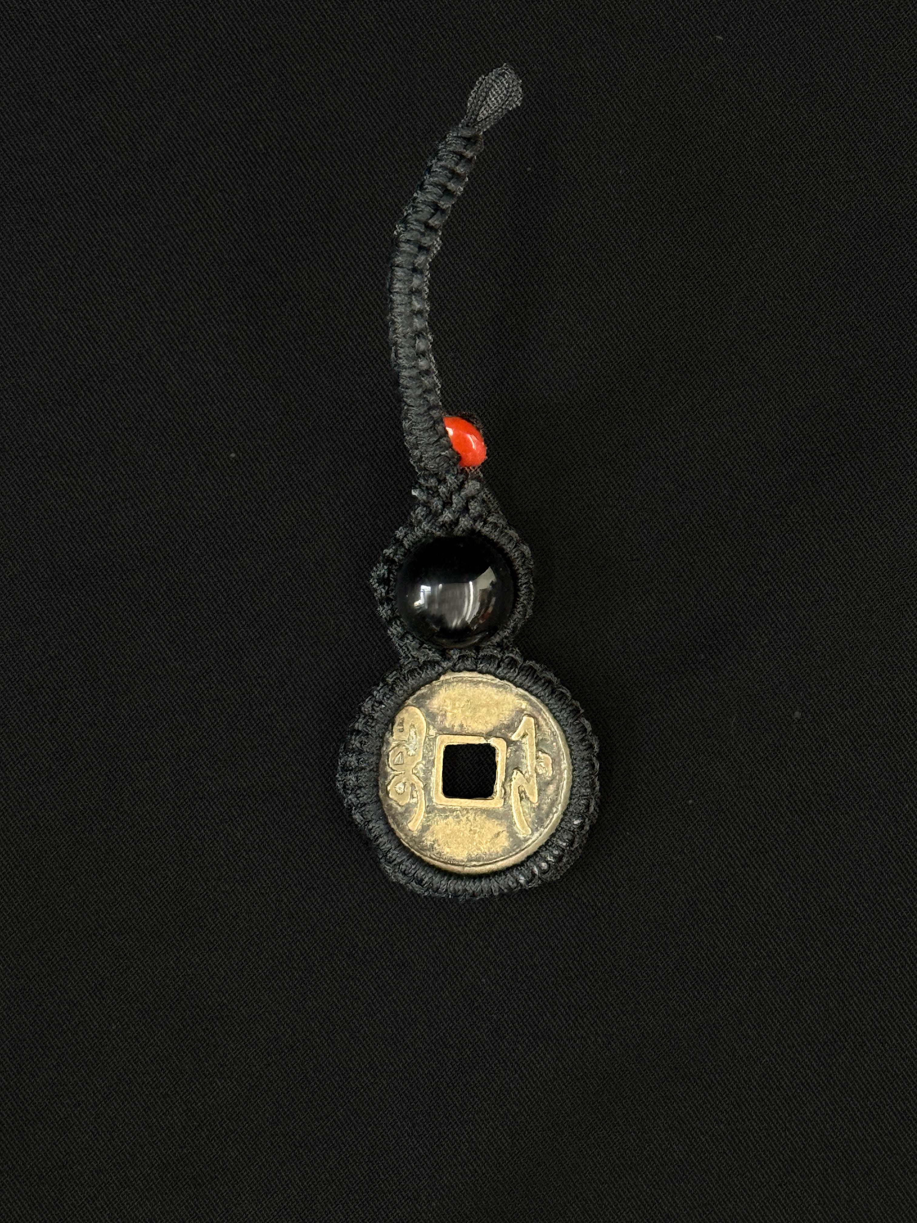 以 “道光通宝” 铜钱为核心(清代钱币),搭配编绳、装饰珠(图中为黑色与红色珠饰),采用传统结艺编织成葫芦造型。仅供参考 自行甄别