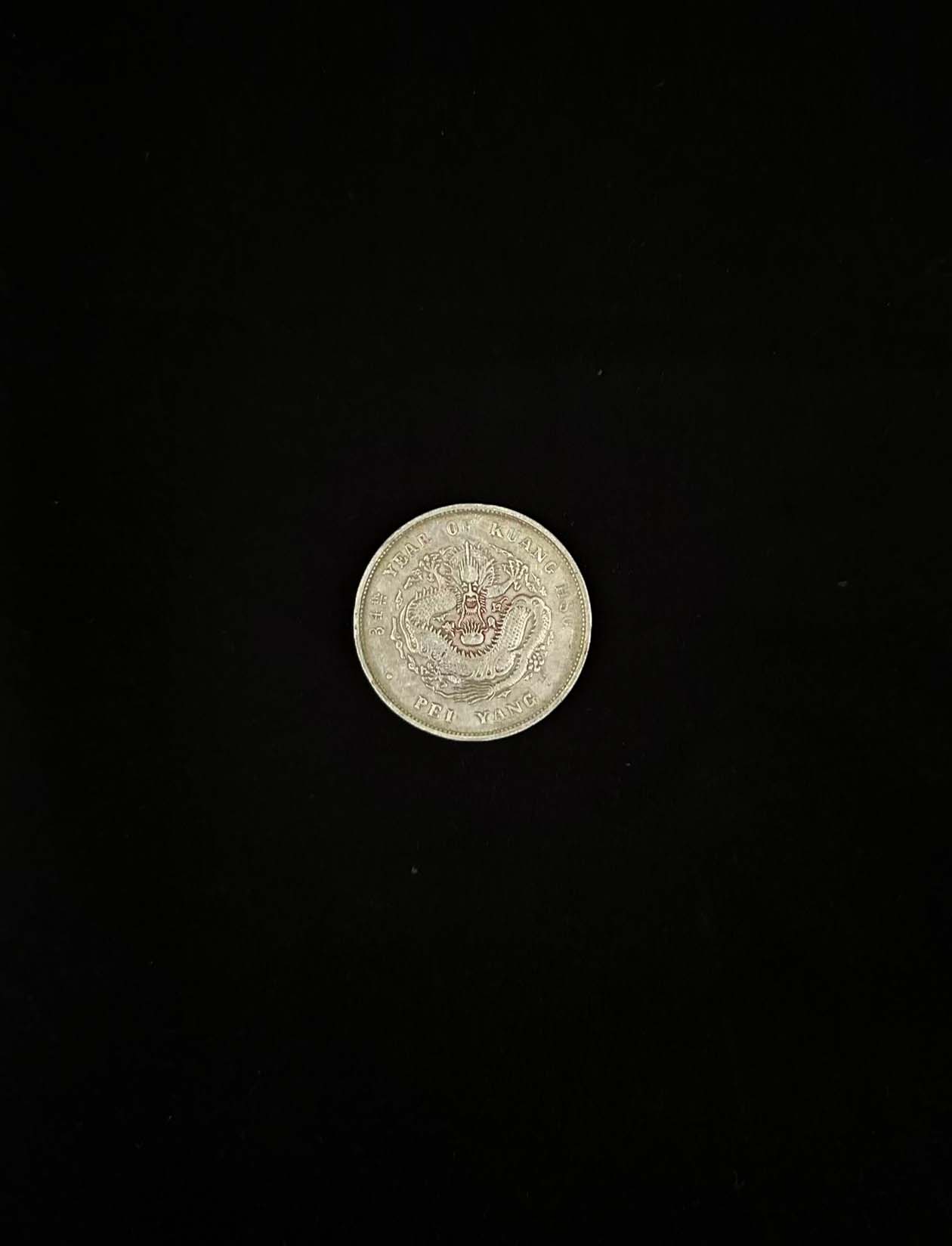 中心为蟠龙图案,上缘英文 “PEI YANG”,下缘英文 “7 MACE AND 2 CANDAREENS”,左右各一圆点 / 星点。仅供参考 自行甄别