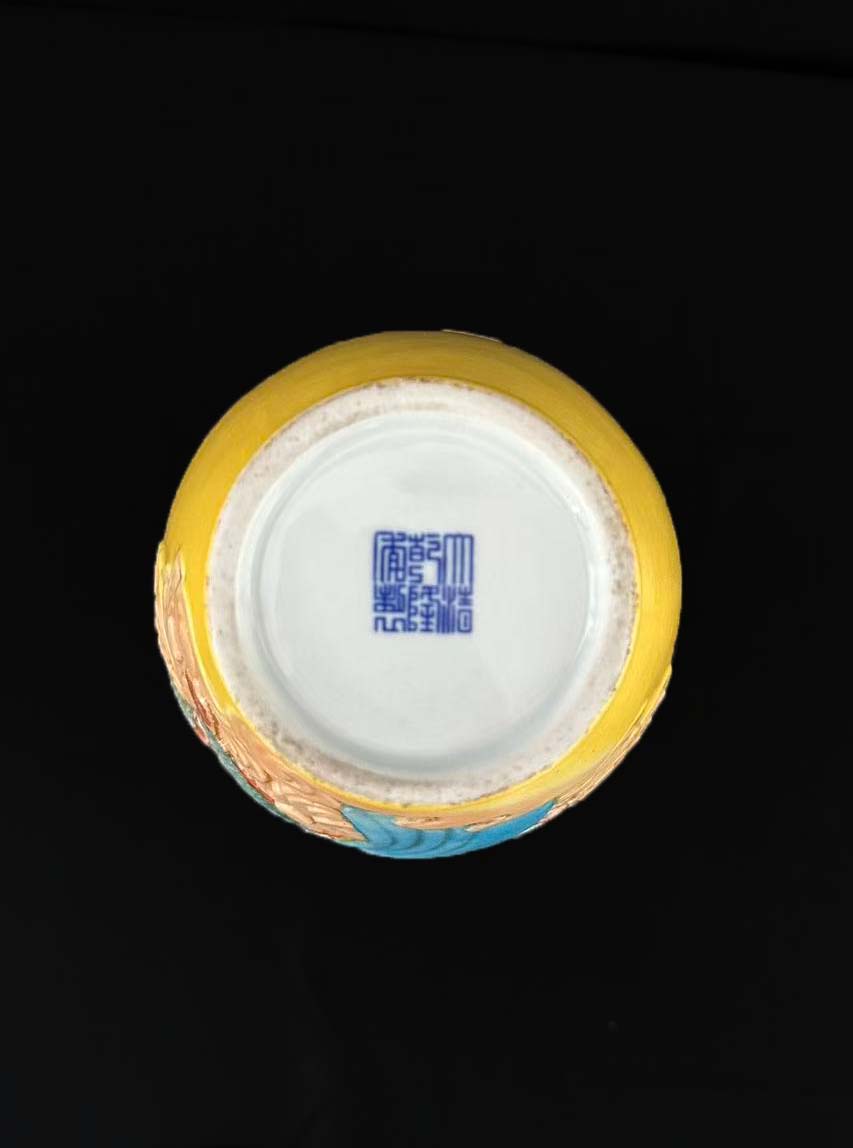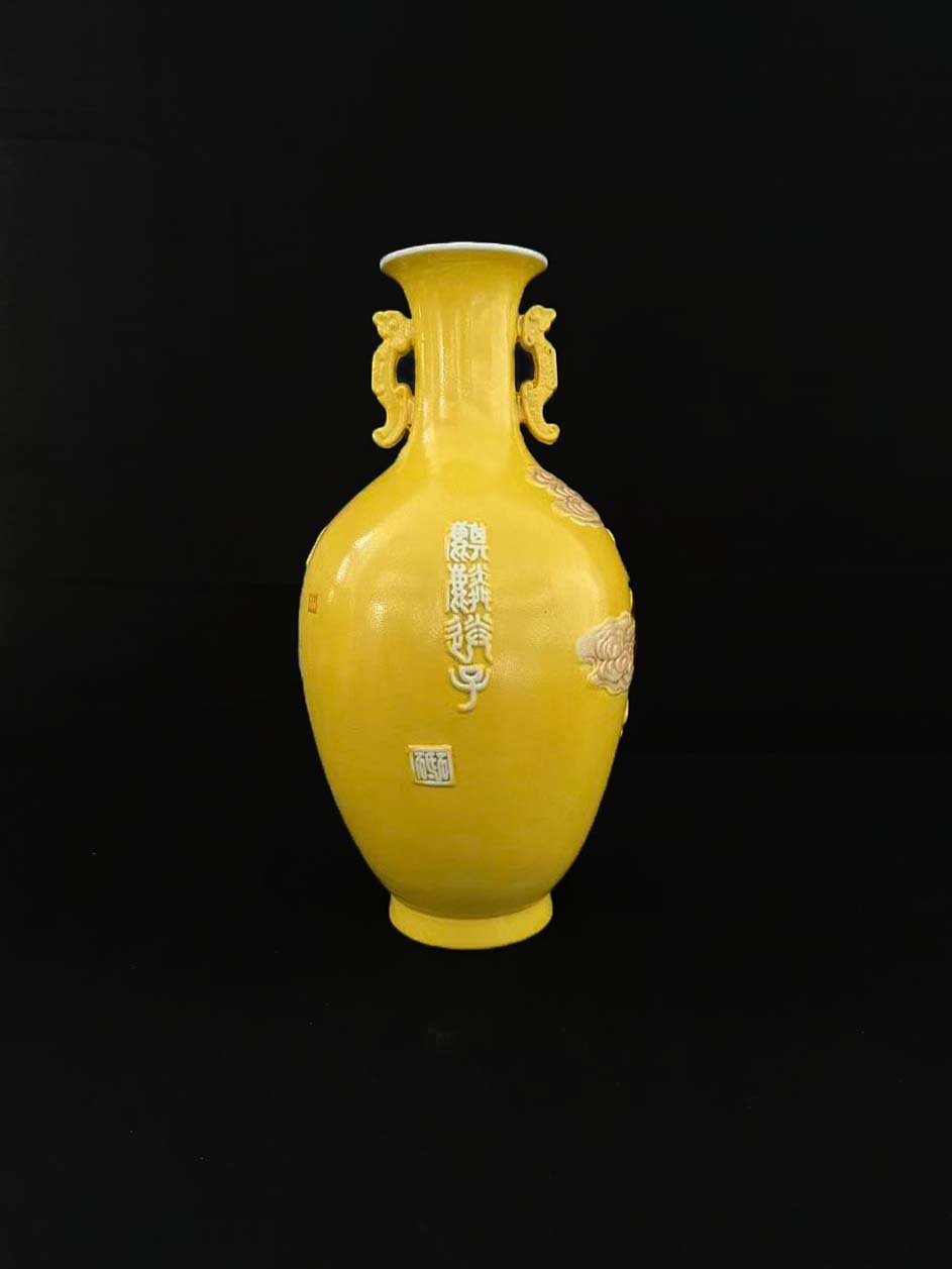 主体纹饰为 “浮雕” 技法,将人物、麒麟等形象立体塑造于瓶身,是清代粉彩瓷中 “重工粉彩” 的延伸风格,工艺复杂,体现了制瓷的立体装饰水平。“麒麟送子” 是传统吉祥题材,画面中观音抱子、麒麟相伴,寓意 “早生贵子、子嗣兴旺”,是民间与宫廷均流行的喜庆纹饰。为 “双耳瓶” 形制,颈部设双如意耳,瓶身修长。仅供参考 自行甄别