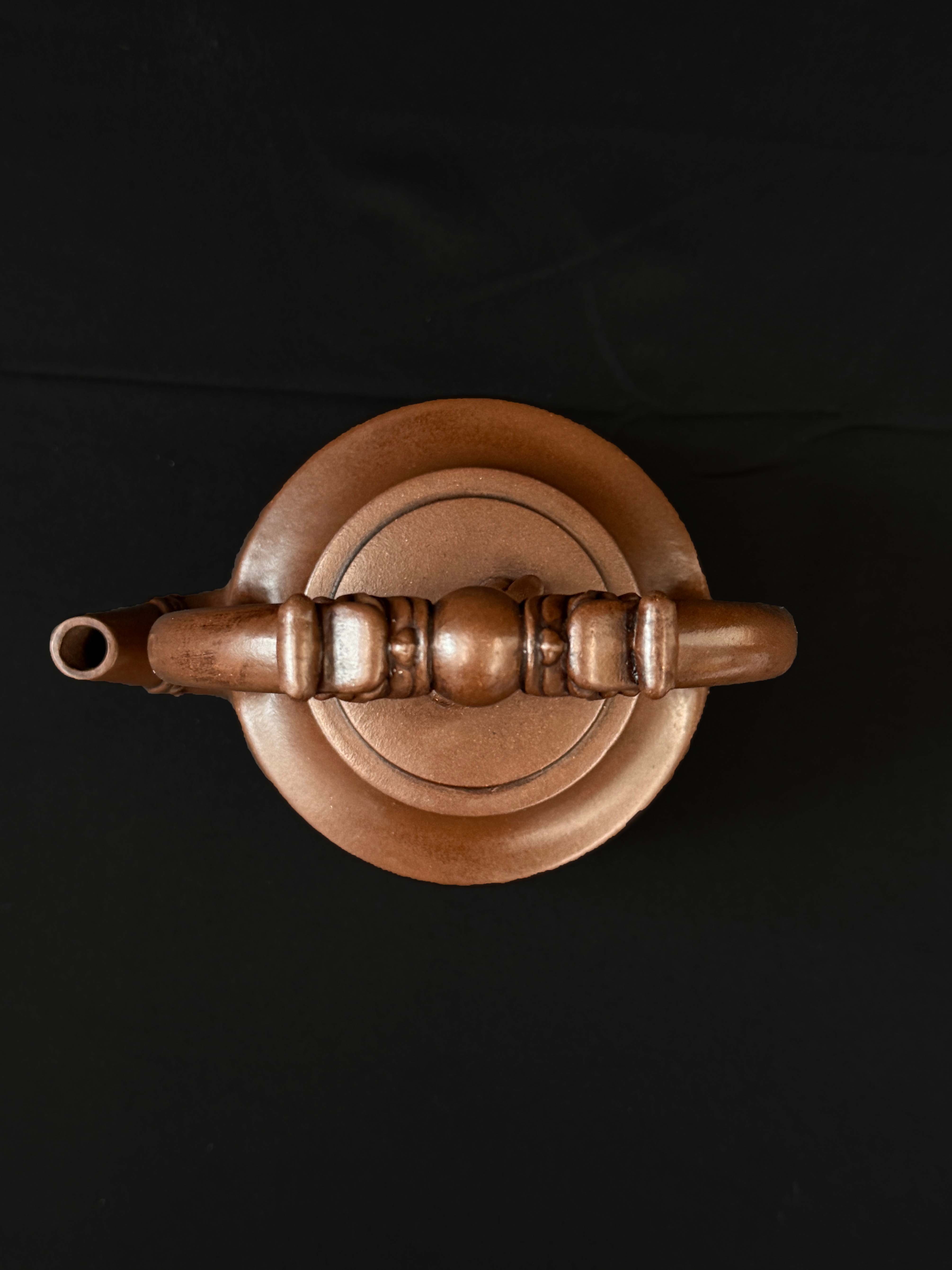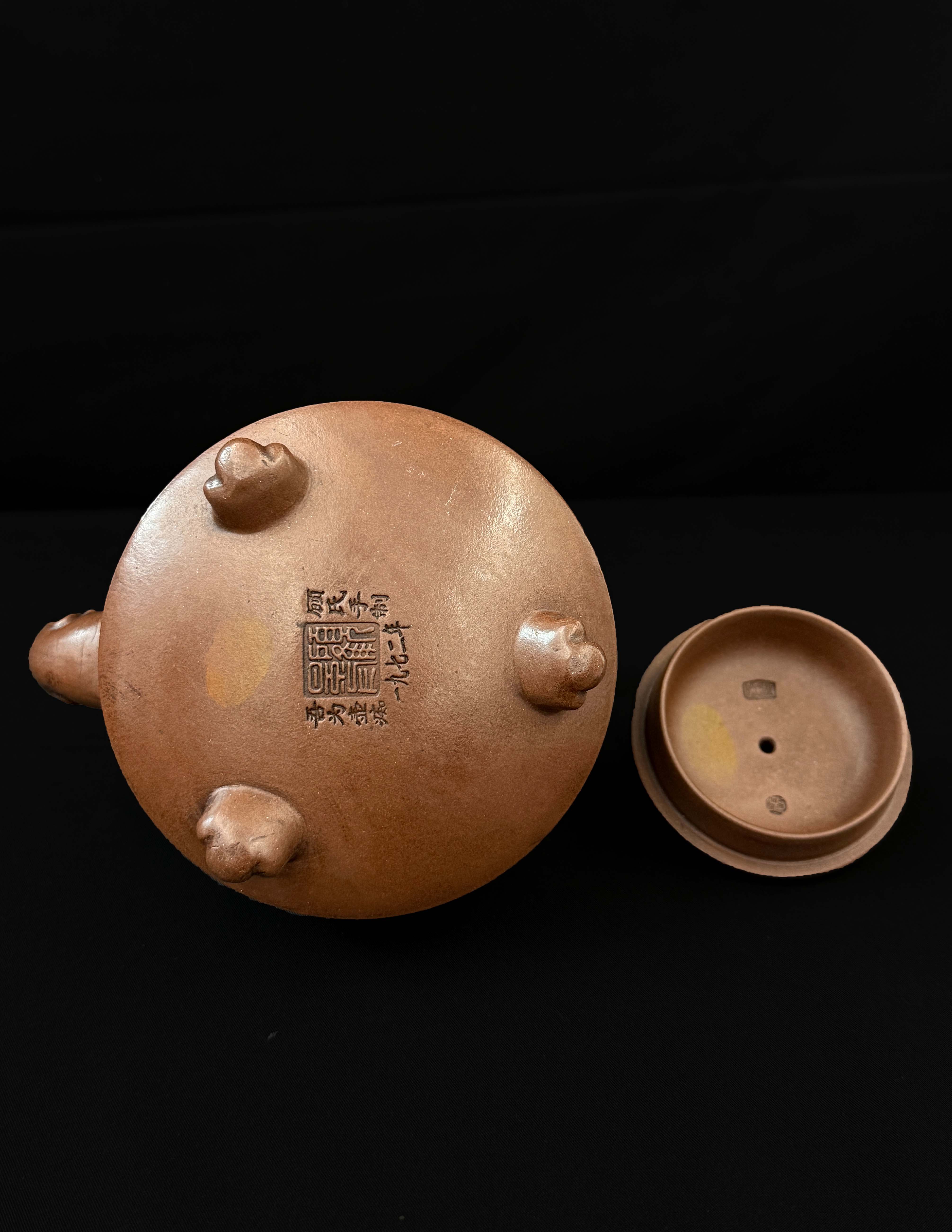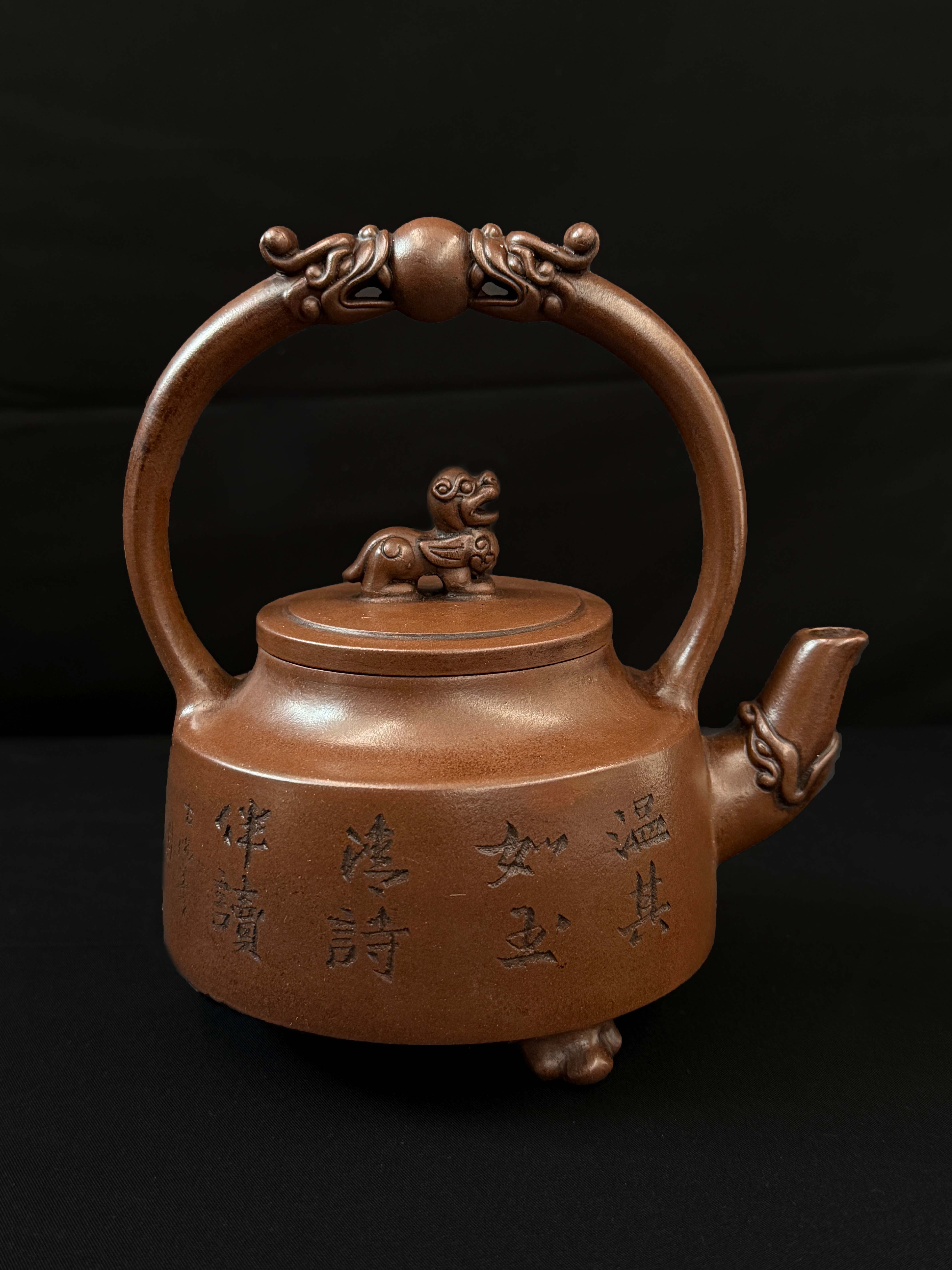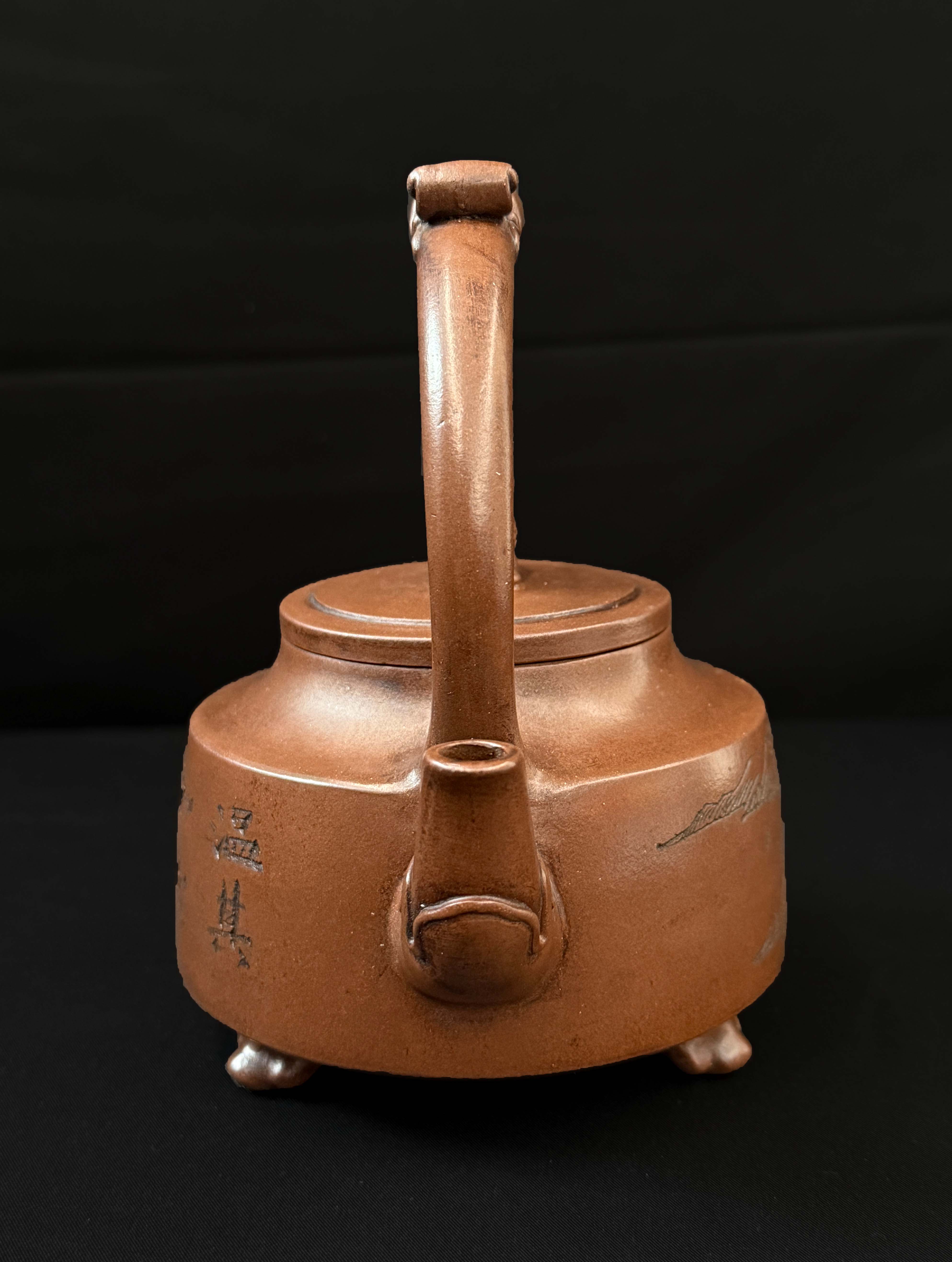 器型为 “三足提梁壶”:壶身呈扁圆状,底部设三兽足(增加稳定感),搭配高拱形提梁,整体轮廓饱满。