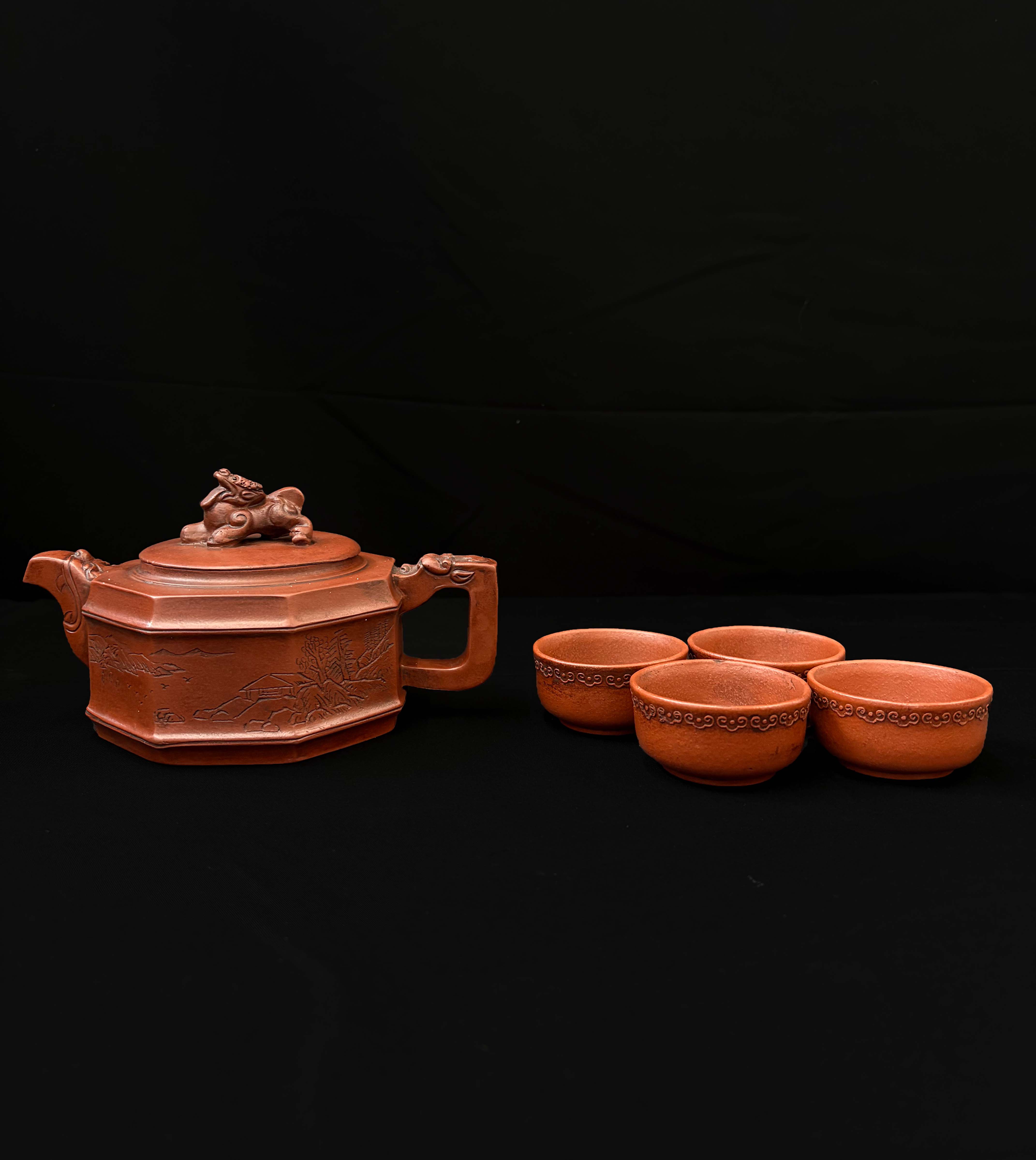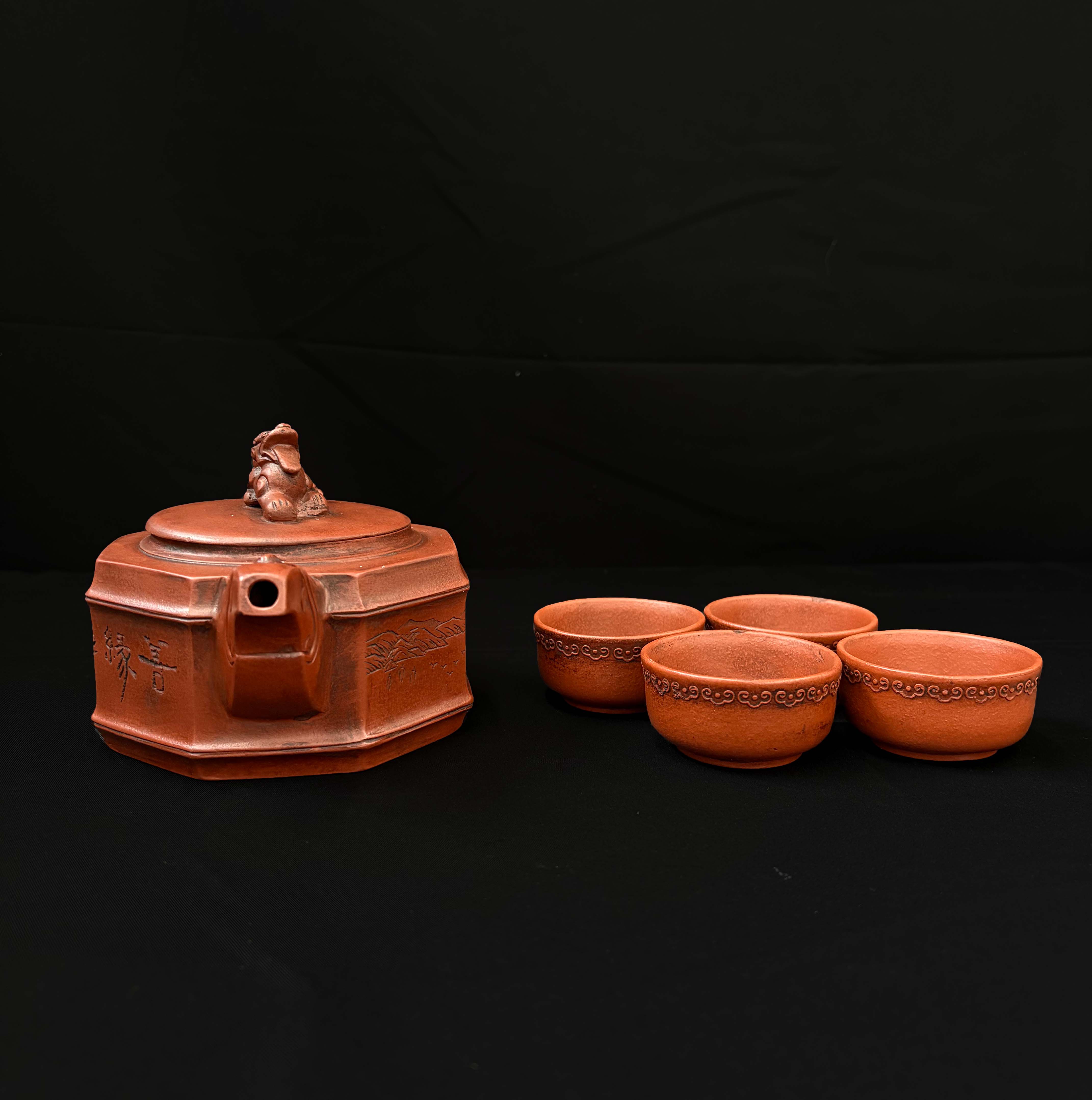 采用 “八方壶” 造型,壶身呈规整的八边形,线条硬朗,盖钮为瑞兽(仿龙形),壶流、壶把根部饰简化龙纹,壶腹刻绘山水纹样,整体围绕 “龙腾” 主题设计。壶身山水雕刻细腻,茶杯外壁饰回纹边饰,与壶身装饰风格统一。仅供参考 自行甄别