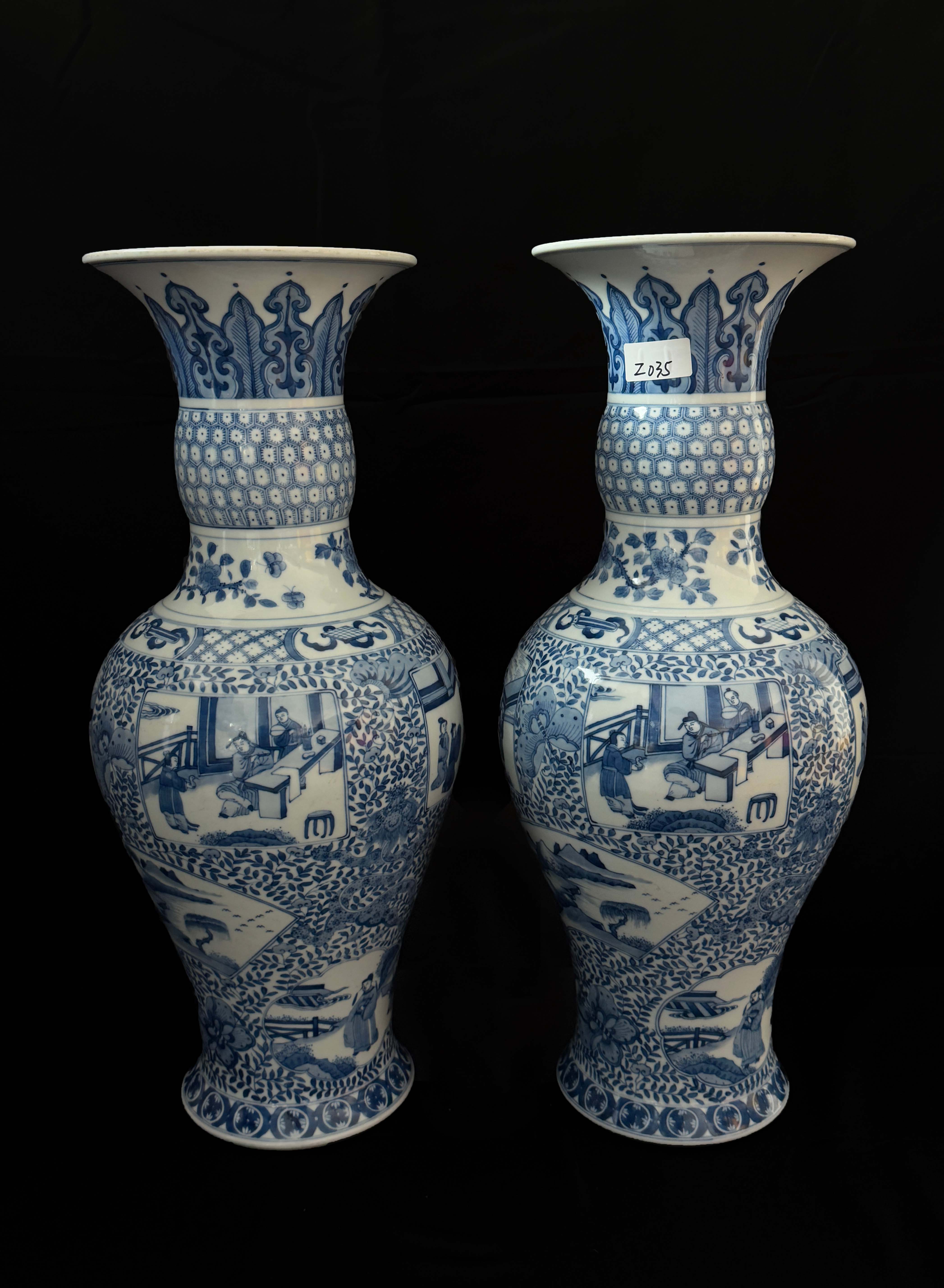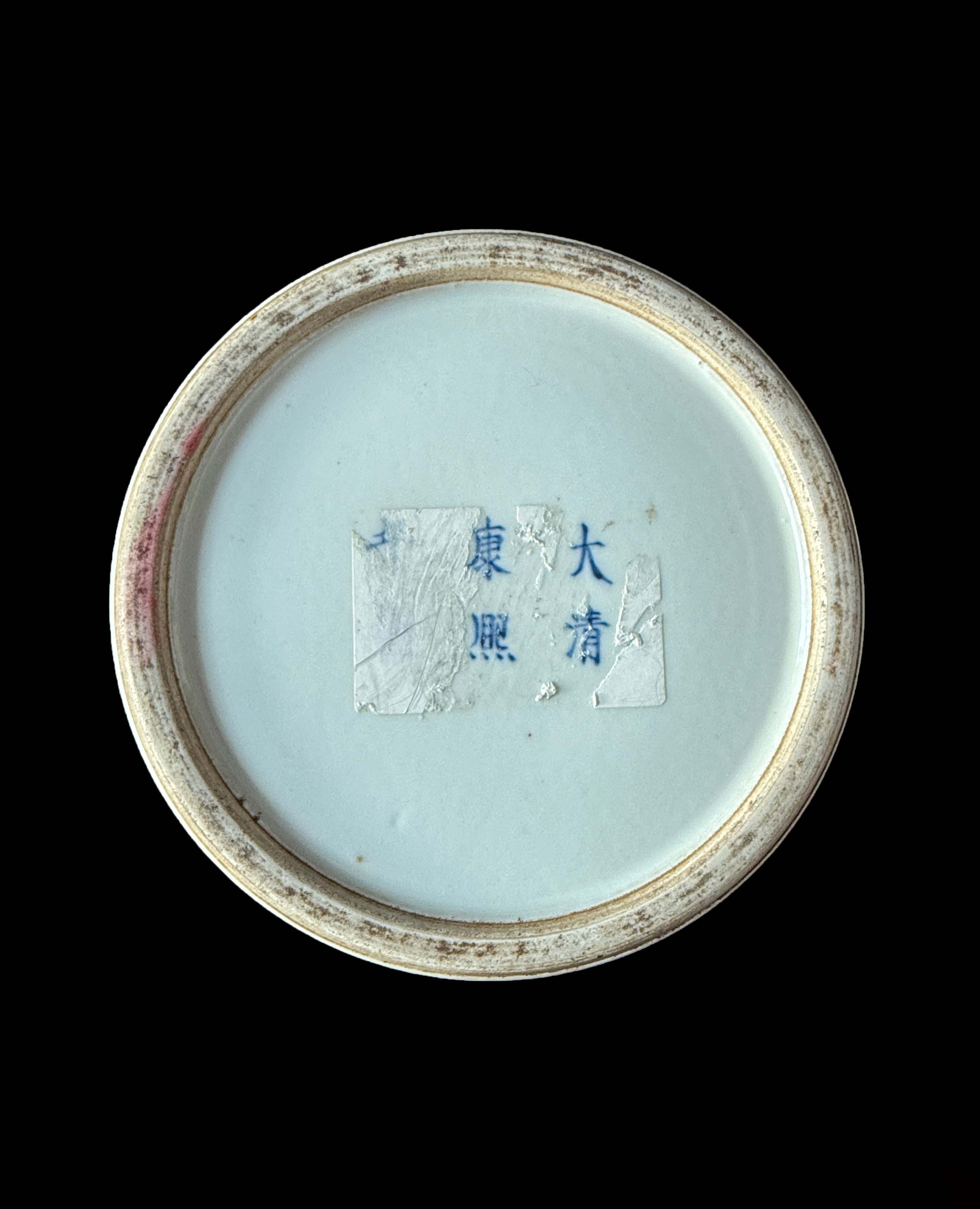 器身以 “锦地纹”为底,是康熙青花的经典装饰手法,凸显华丽繁复的风格。开设 “如意形 / 方形开光”(留白区域),内绘人物故事纹。