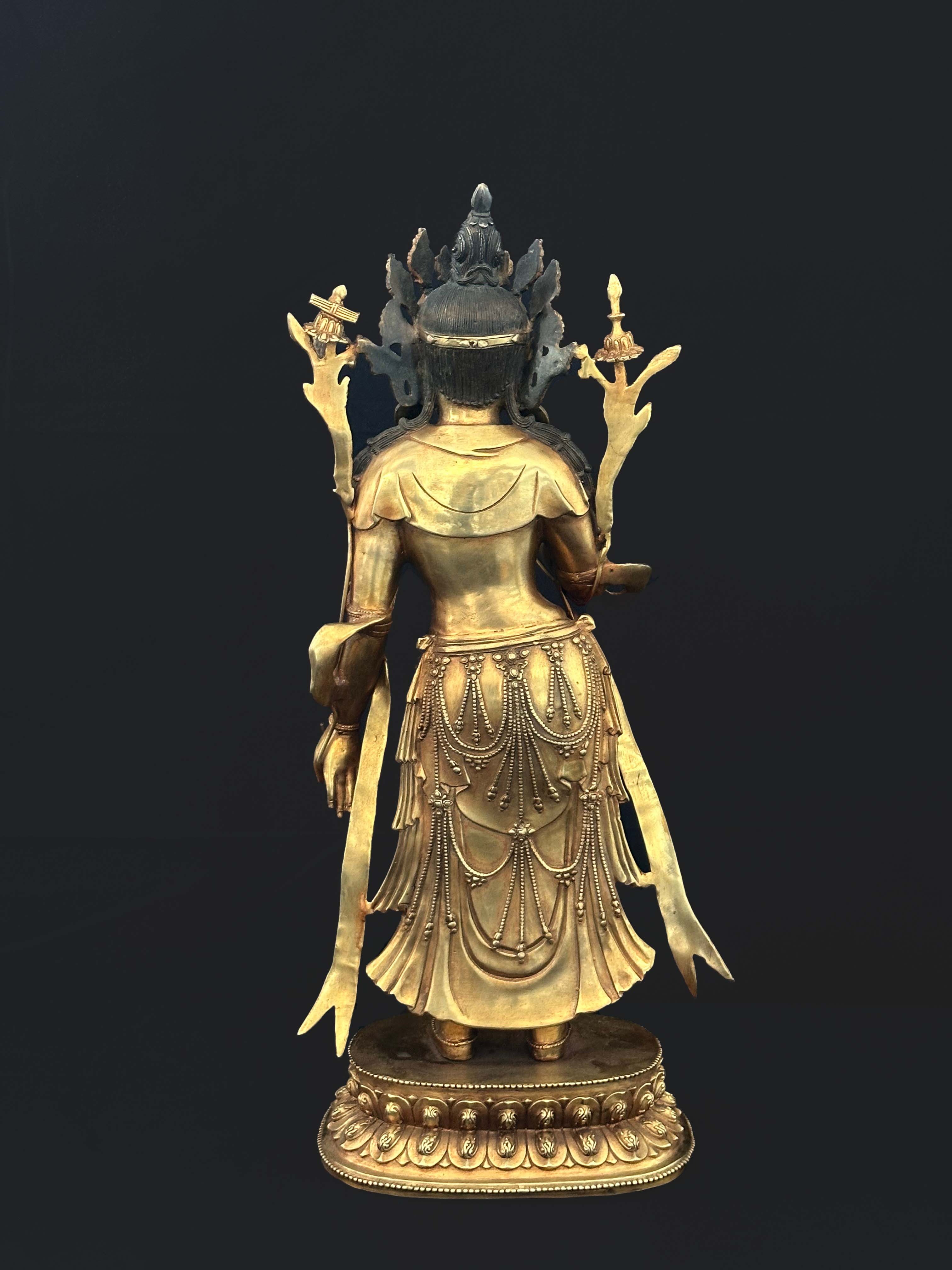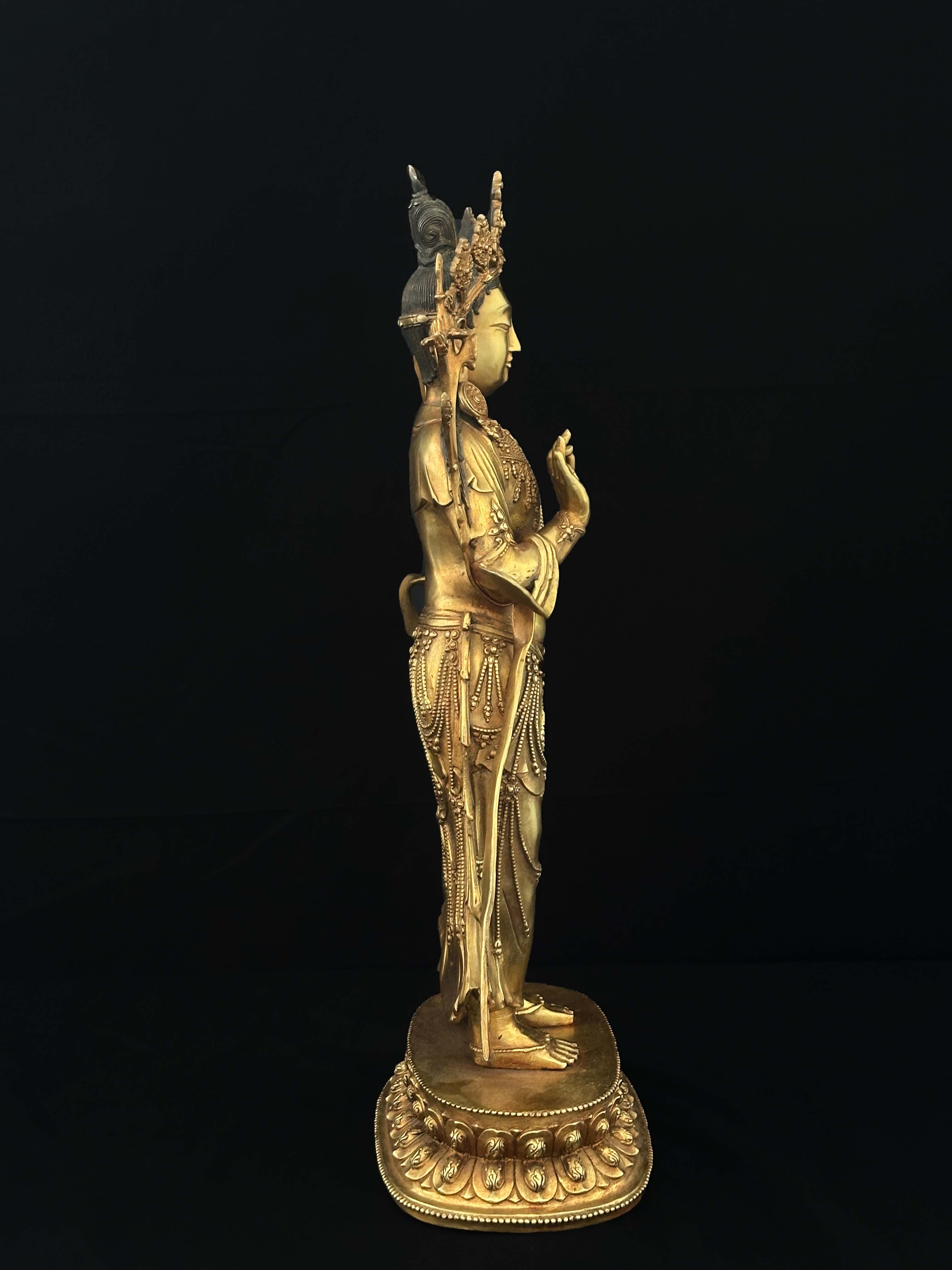 面相丰腴圆润,眉眼微垂含笑,融合明代仕女画的审美风格,兼具神性慈悲与人间亲近感;宝冠中通常嵌有 “阿弥陀佛” 化佛,是观音身份的标识。