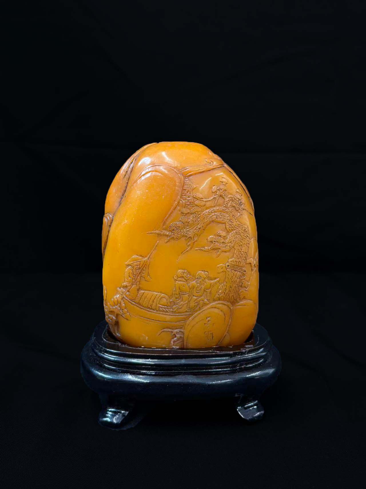 雕刻内容为 “山水人物”(画面可见舟中人物、松树、楼阁等元素),是传统薄意雕常见的 “文人雅集” 题材,体现古典山水意境。