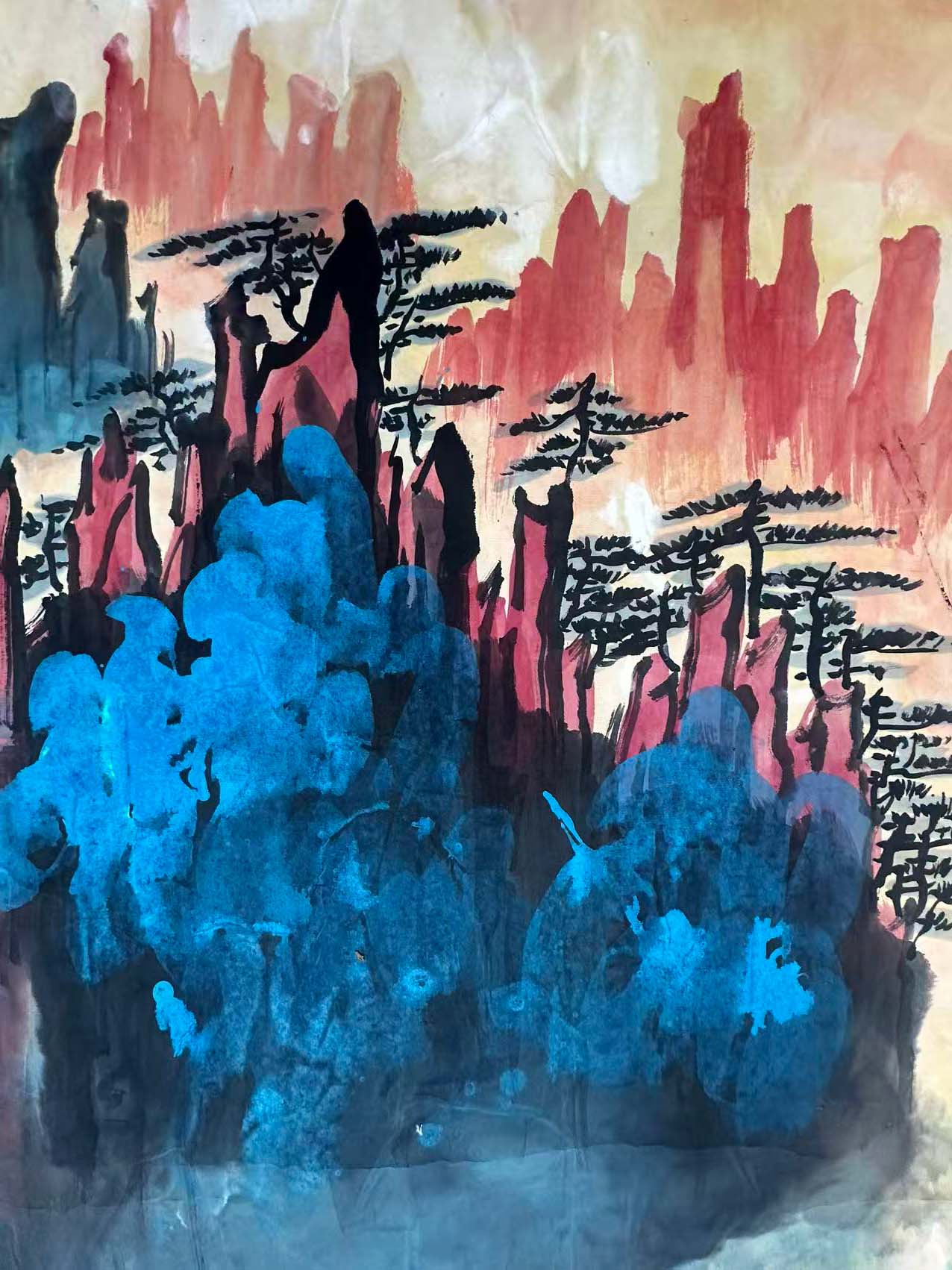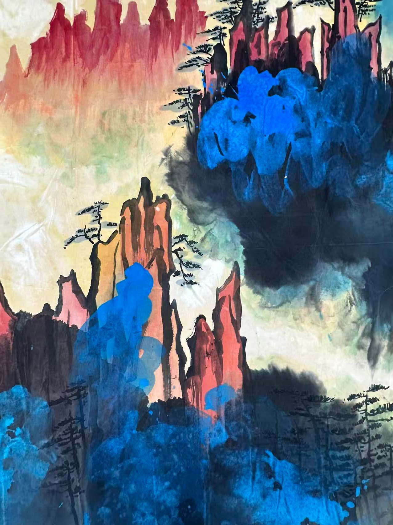 泼彩与泼墨结合,先以焦墨勾勒山峰、松枝的 “骨架”,再泼色、泼水,利用宣纸的渗化效果,营造出云海 “虚实相生” 的朦胧感。