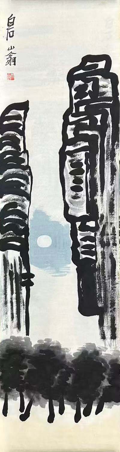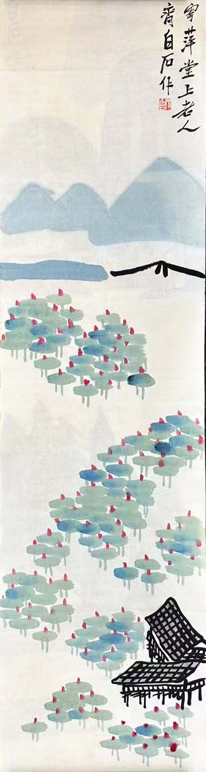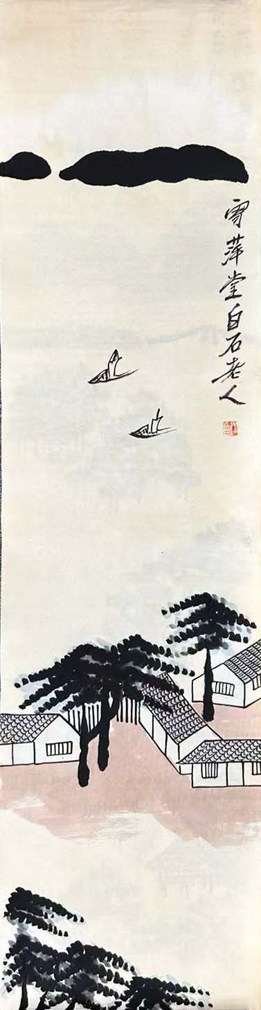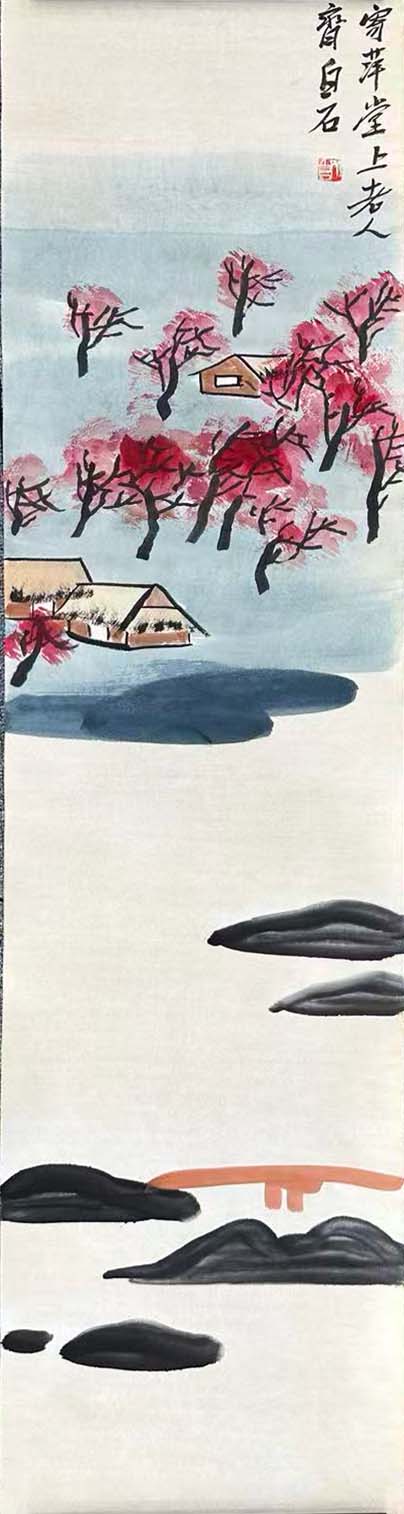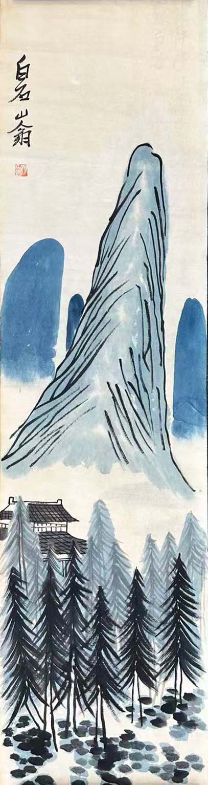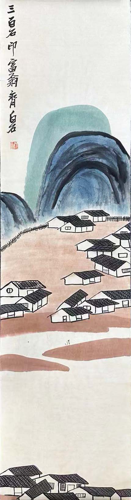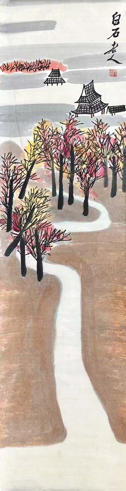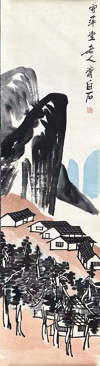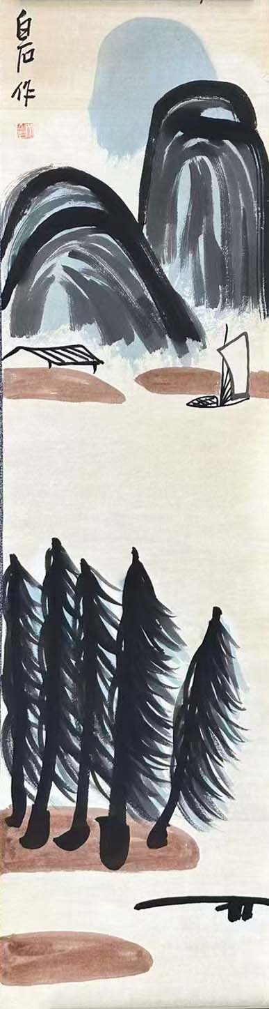 突破传统山水的 “皴法” 束缚,以简笔写意为主:用浓淡干湿的水墨(如 “斧劈皴” 简化为大块墨块)、鲜明的色彩(如朱砂点叶、石青染山),形成 “简劲雄浑、色彩明快” 的个人风格,被称为 “白石山水体”。