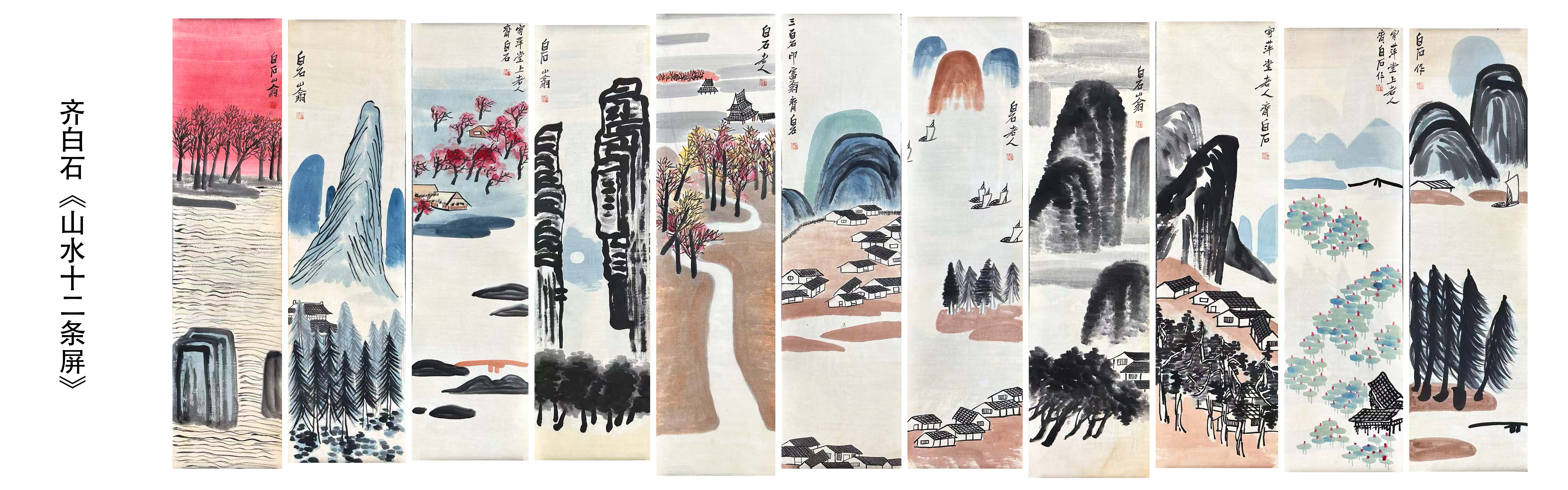 以 “四季山水 + 田园生活” 为核心题材,涵盖江岸秋林、孤峰远帆、村落人家、溪桥渔隐等 12 种山水意境,既融合了传统山水的 “可居可游” 理念,又注入了齐白石对家乡湘潭的田园记忆。
