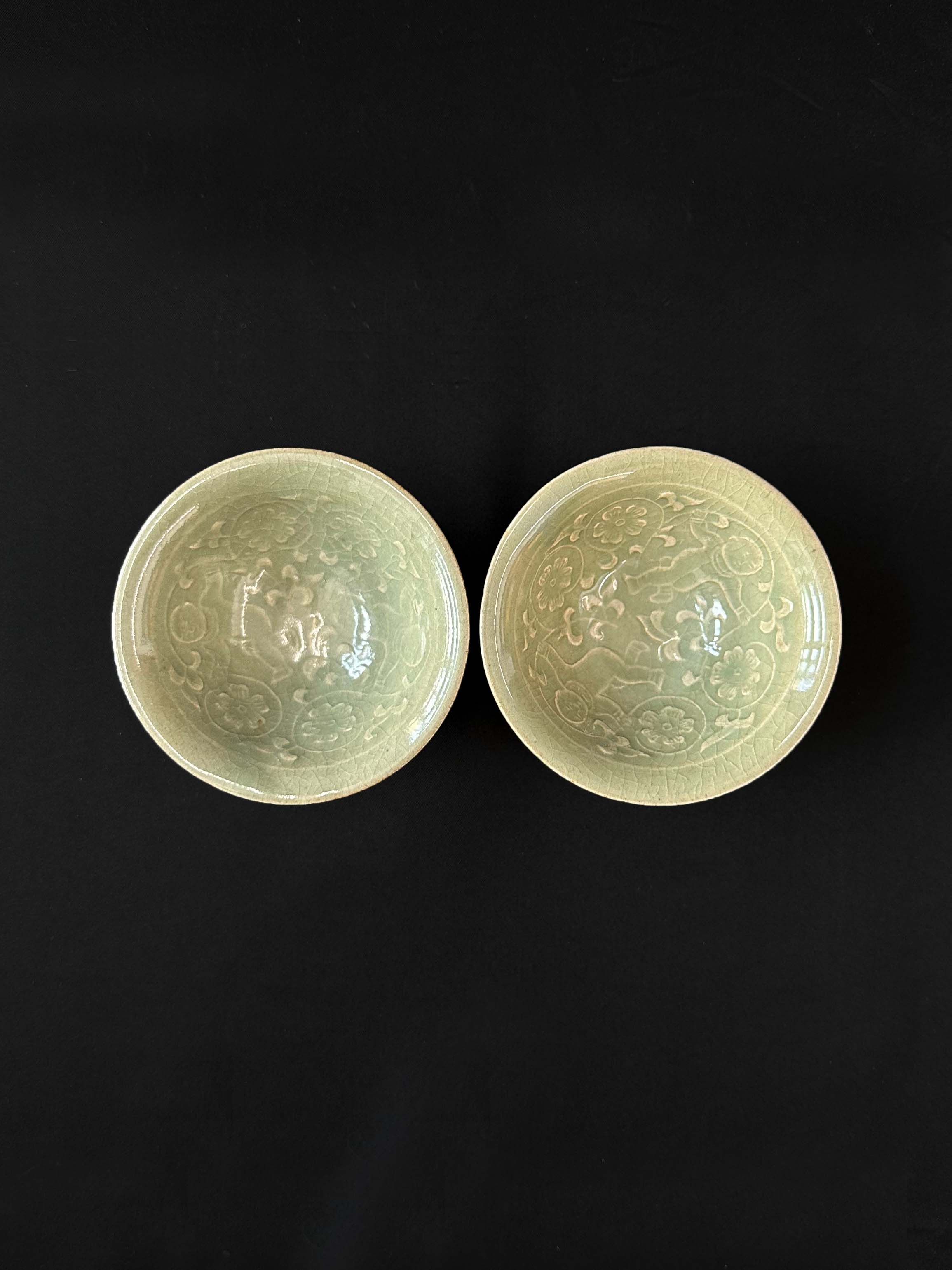 采用耀州窑标志性的 “剃刻花” 工艺,以金属刀具在胎体表面深剔浅刻,再施青釉高温烧成。盏心缠枝花卉纹饰线条犀利流畅,花叶翻卷灵动,层次分明如浮雕,每一刀都带着匠人的力道与韵律,尽显宋代 “刀笔生花” 的工艺巅峰。仅供参考 自行甄别