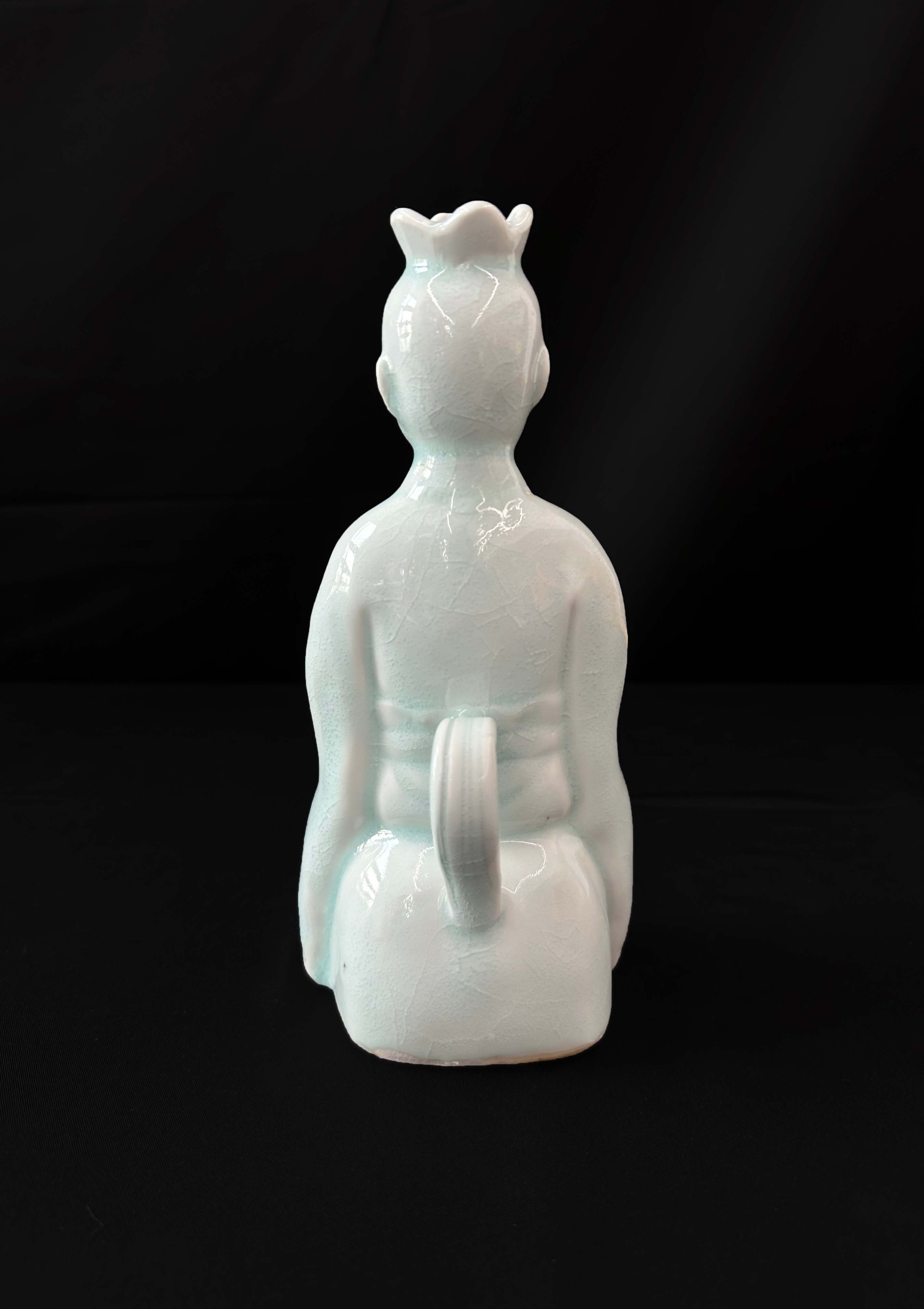 壶身塑为高士端坐造型,头戴冠冕,面容沉静祥和,双目微闭似在沉思;衣纹以写实手法刻画,线条流畅自然,褶皱层次分明,尽显宋代雕塑 “形神兼备” 的水准;双手捧持注水管,与壶身内部相通,既满足了注水的实用功能,又让人物造型与器物功能浑然一体
