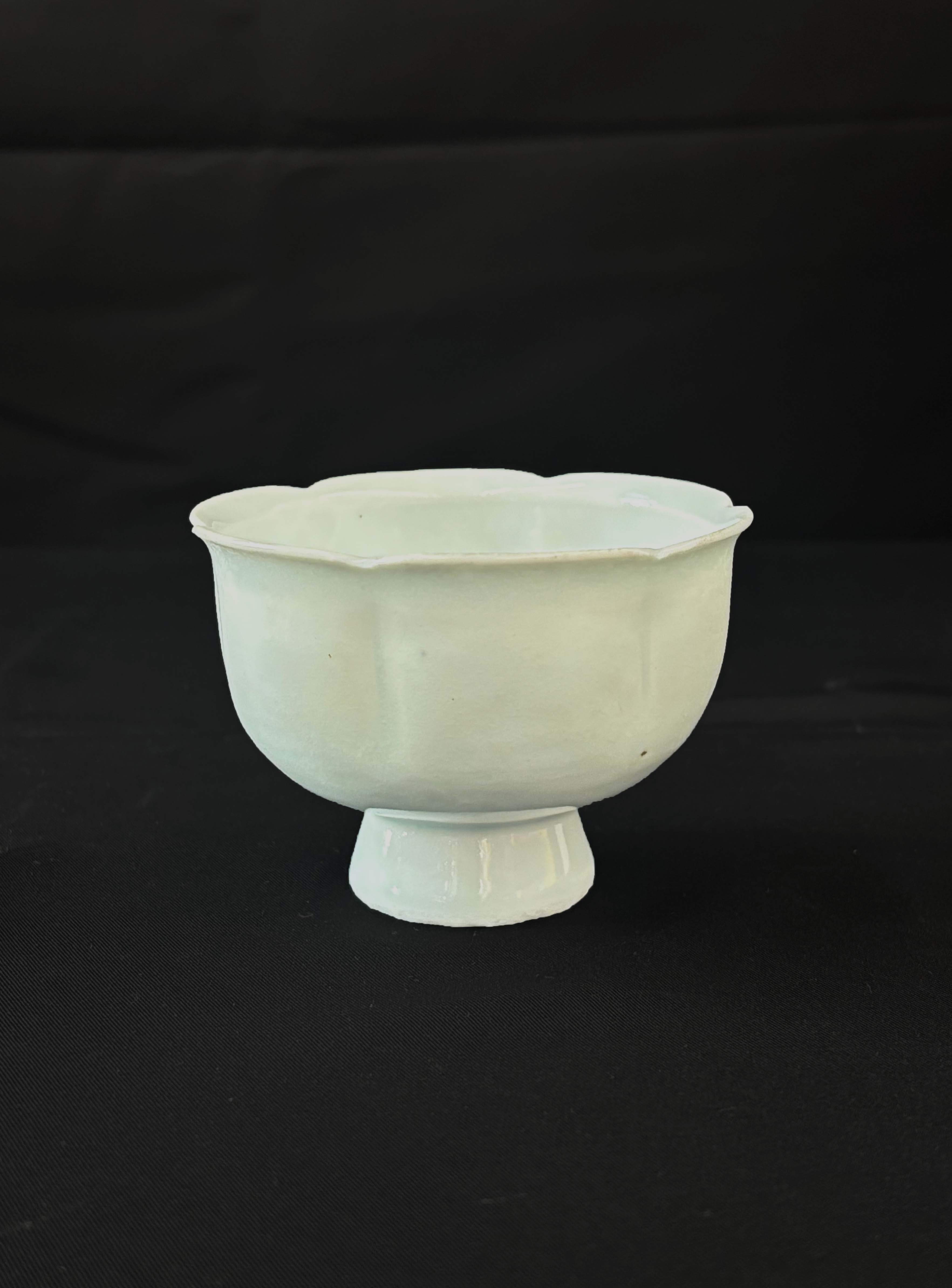 造型,花瓣线条柔美起伏,弧壁斜收至小足,比例协调,既便于斗茶时持握聚香,又以极简线条勾勒出宋代器物的雅致风骨;杯心隐见同心圆弦纹,与葵口的花瓣纹形成呼应,简约而不失层次。
