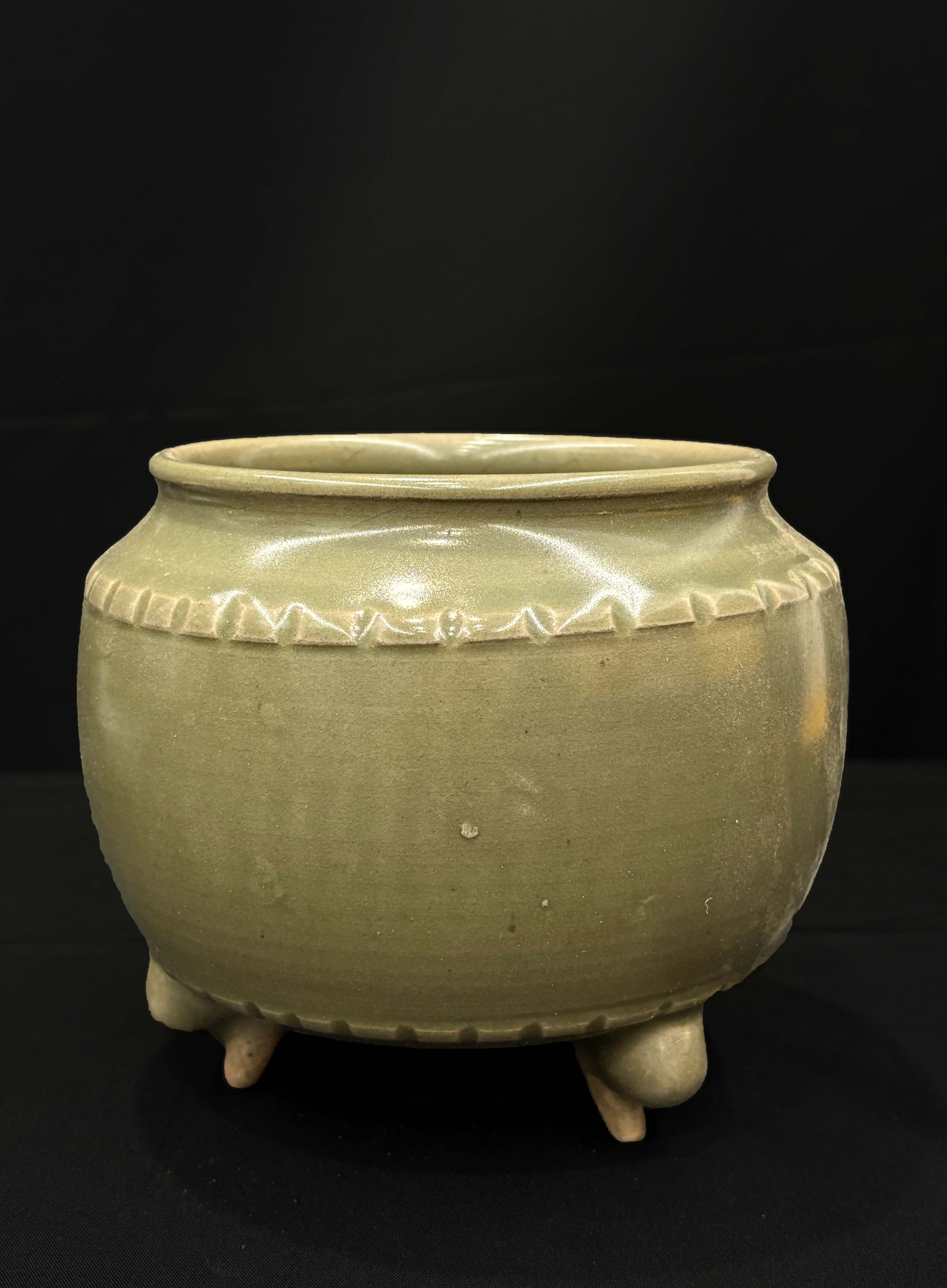 整体为敛口、鼓腹、三足的经典炉式造型,口沿下方装饰一周锯齿状弦纹,线条饱满圆润,器型规整,弦纹层次分明,三足与炉身衔接自然。