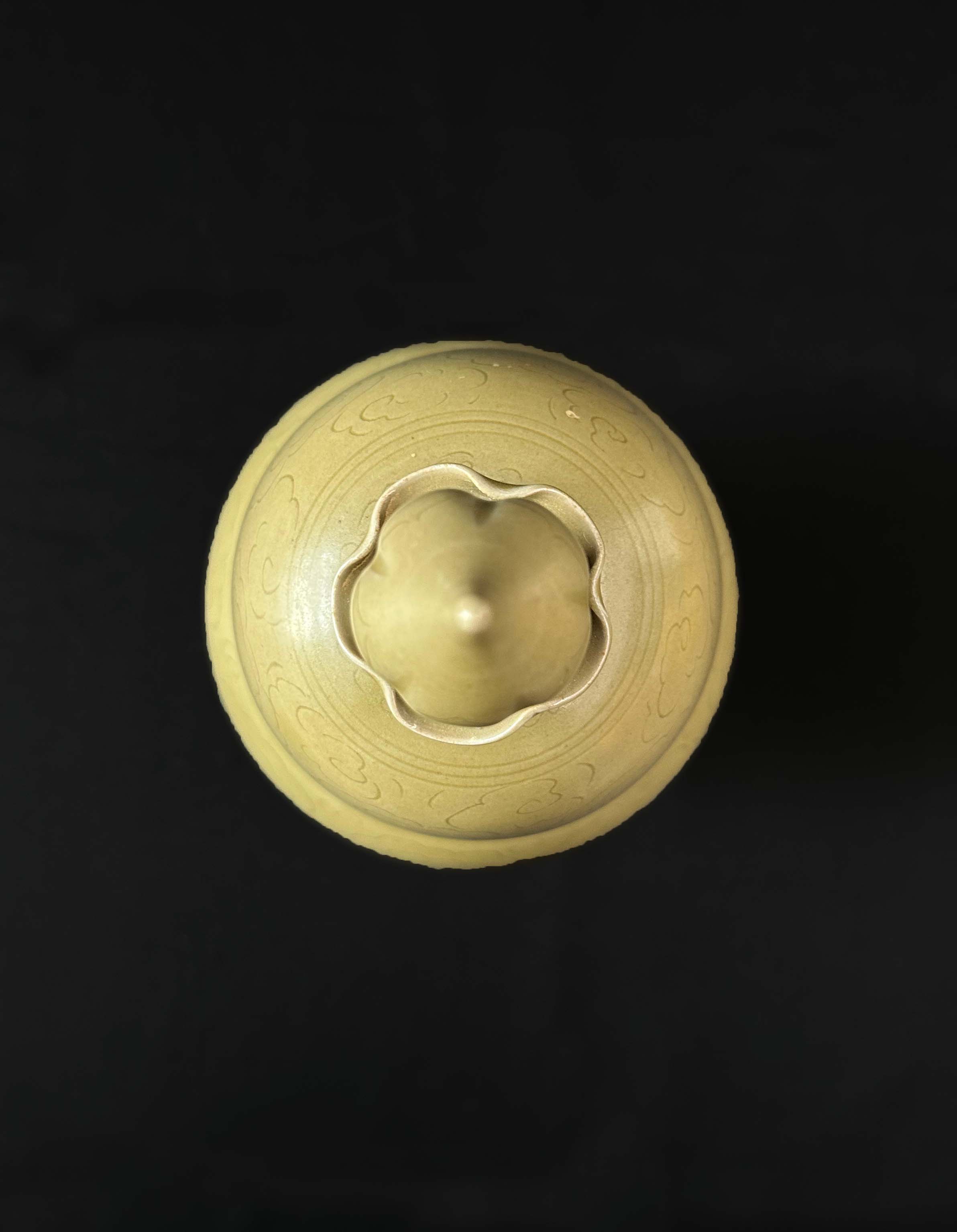 壶身满饰细线刻云纹,线条纤细流畅、婉转灵动,云纹连绵舒展、层次分明,每一道纹路都带着匠人的呼吸感,尽显越窑 “刻花如丝” 的工艺巅峰;盖顶宝珠钮与壶身云纹呼应,造型精巧雅致,与器型浑然一体。