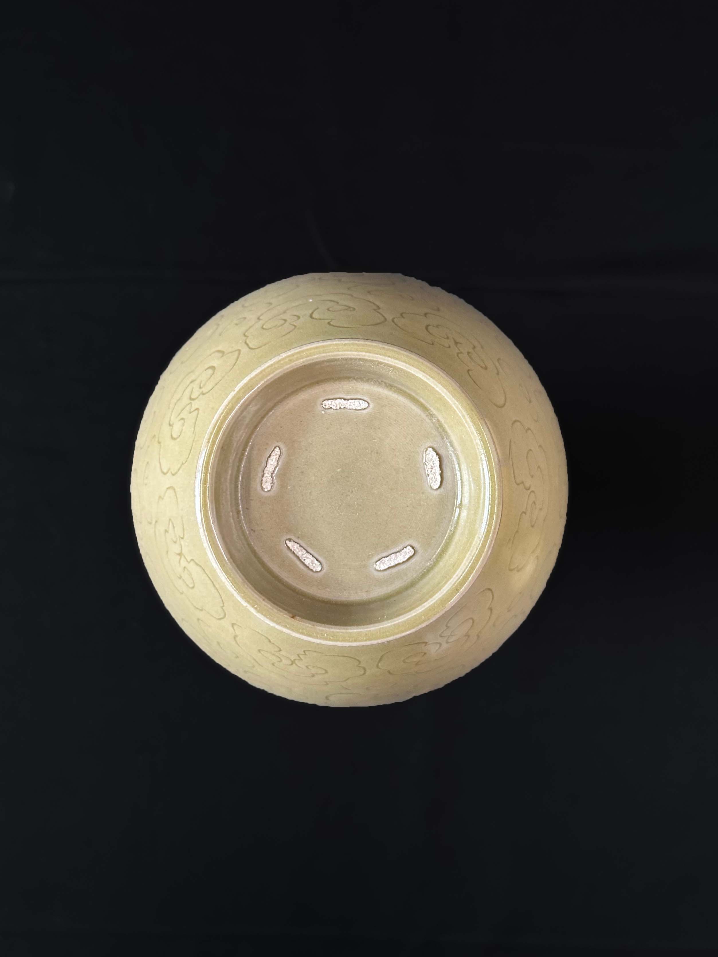 通体施越窑标志性的秘色釉,釉色温润如玉,呈青黄交融的蜜蜡质感,釉面莹润匀净,触之似玉如脂;胎体采用越窑特有的 “紫金土”,质地坚密细腻,修足规整利落,底足露胎处可见浅褐色胎土,老化痕迹自然,印证了越窑 “薄胎厚釉” 的贡瓷工艺标准。
