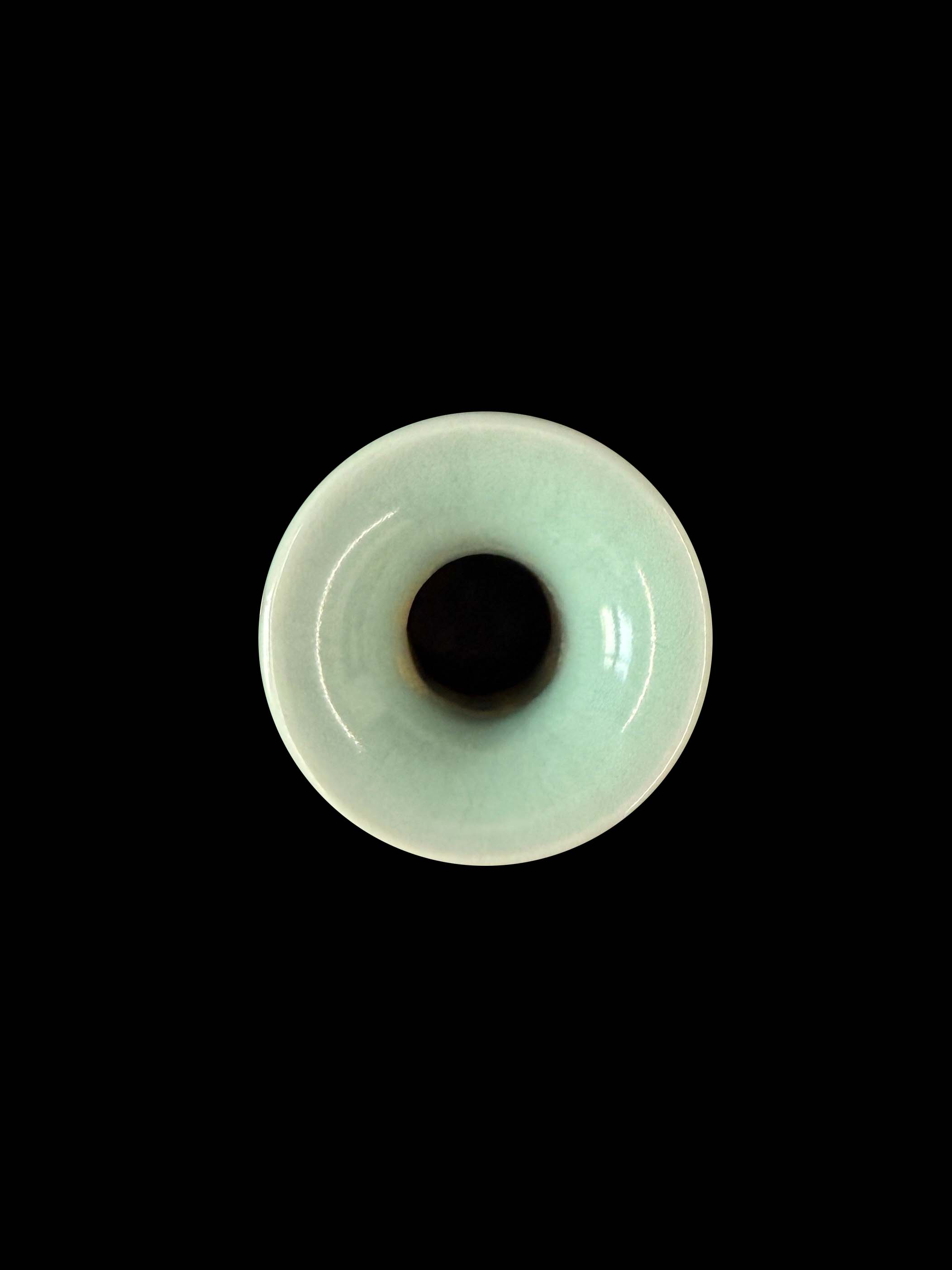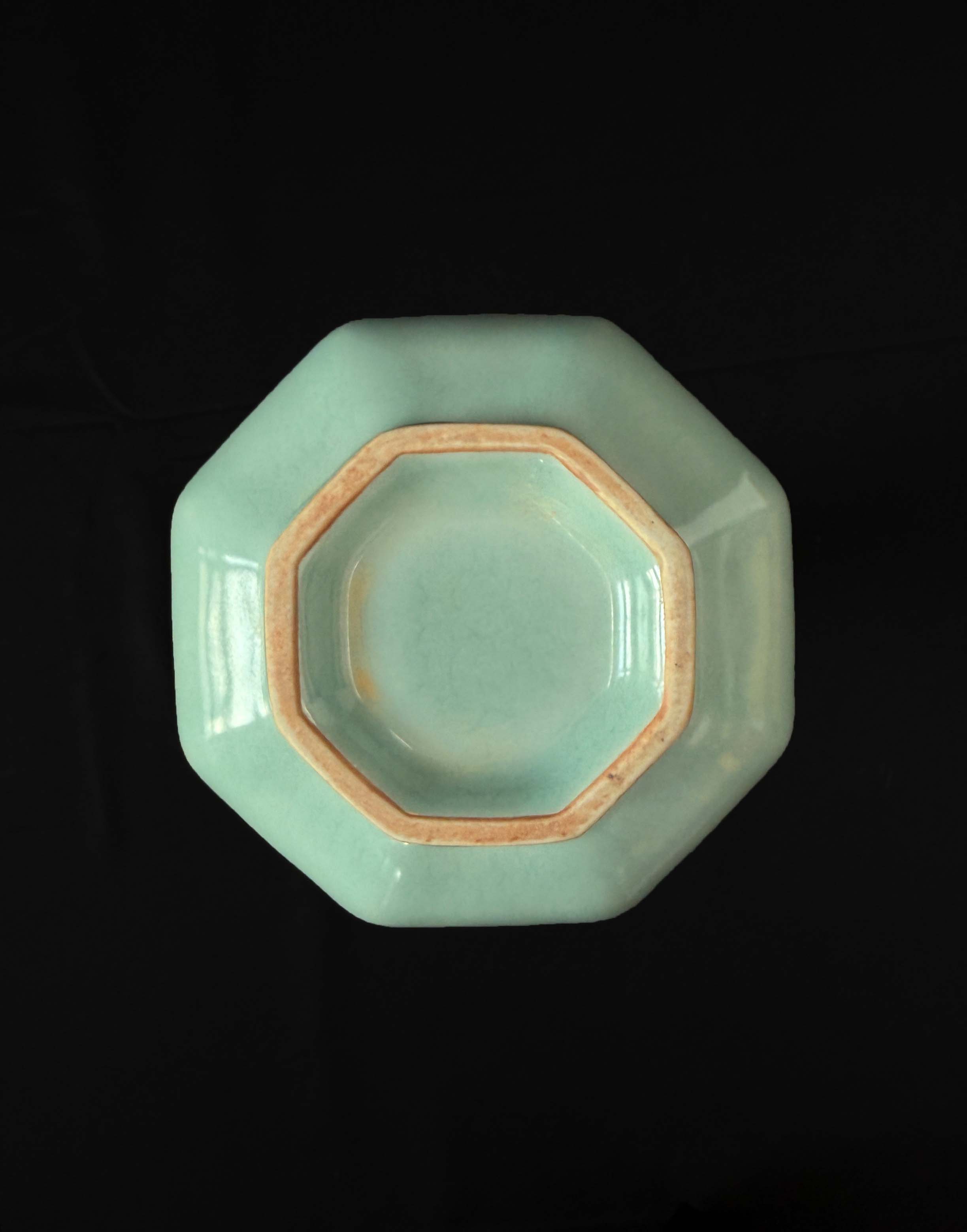瓶口为盘口设计,长颈做竹节式分段凸起,线条挺拔有力。瓶身呈八棱形,棱角分明,转折处线条流畅,造型规整大气。整体比例协调,既保留了官窑的端庄典雅,又融入了龙泉窑的温润质感。施粉青釉,釉层肥厚莹润,色泽柔和淡雅,是龙泉窑仿官窑的标志性釉色。釉面带有细微开片,模仿官窑的 “冰裂纹” 效果,增添了古朴的韵味。仅供参考 自行甄别