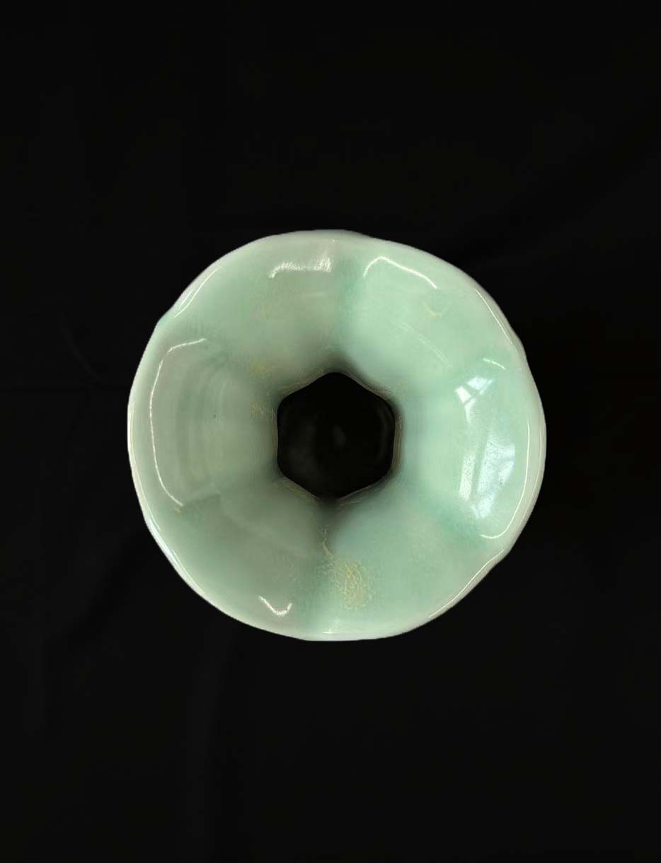 通体施龙泉窑标志性的粉青釉,釉色温润如玉,呈淡青偏绿的通透质感,釉面莹润匀净,触之似玉如脂;胎体采用龙泉窑特有的 “紫金土”,质地坚密厚重,底足露胎处可见浅褐色 “朱砂底”,釉面隐见细碎冰裂纹,与粉青釉的温润形成微妙平衡。