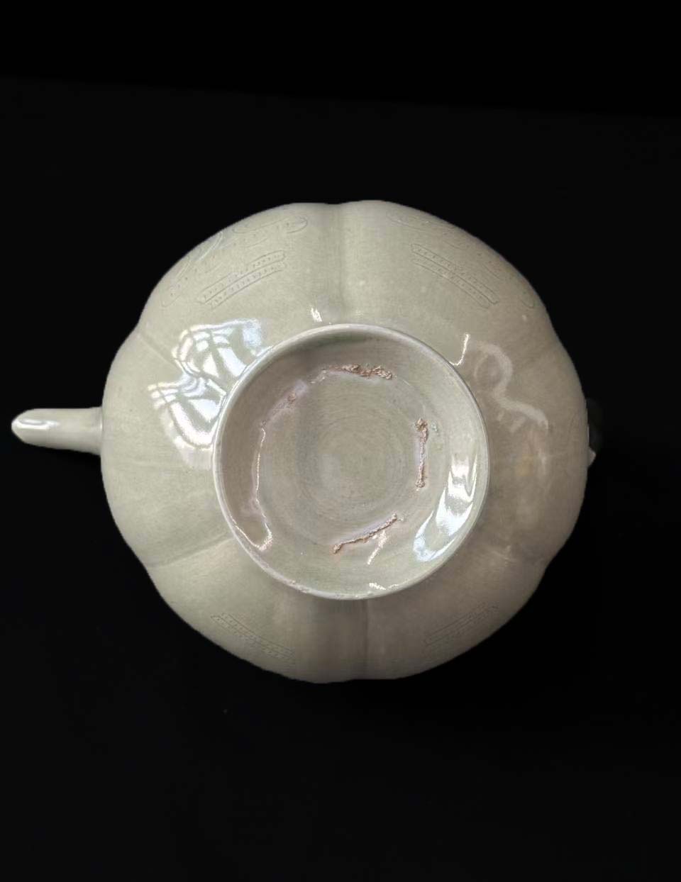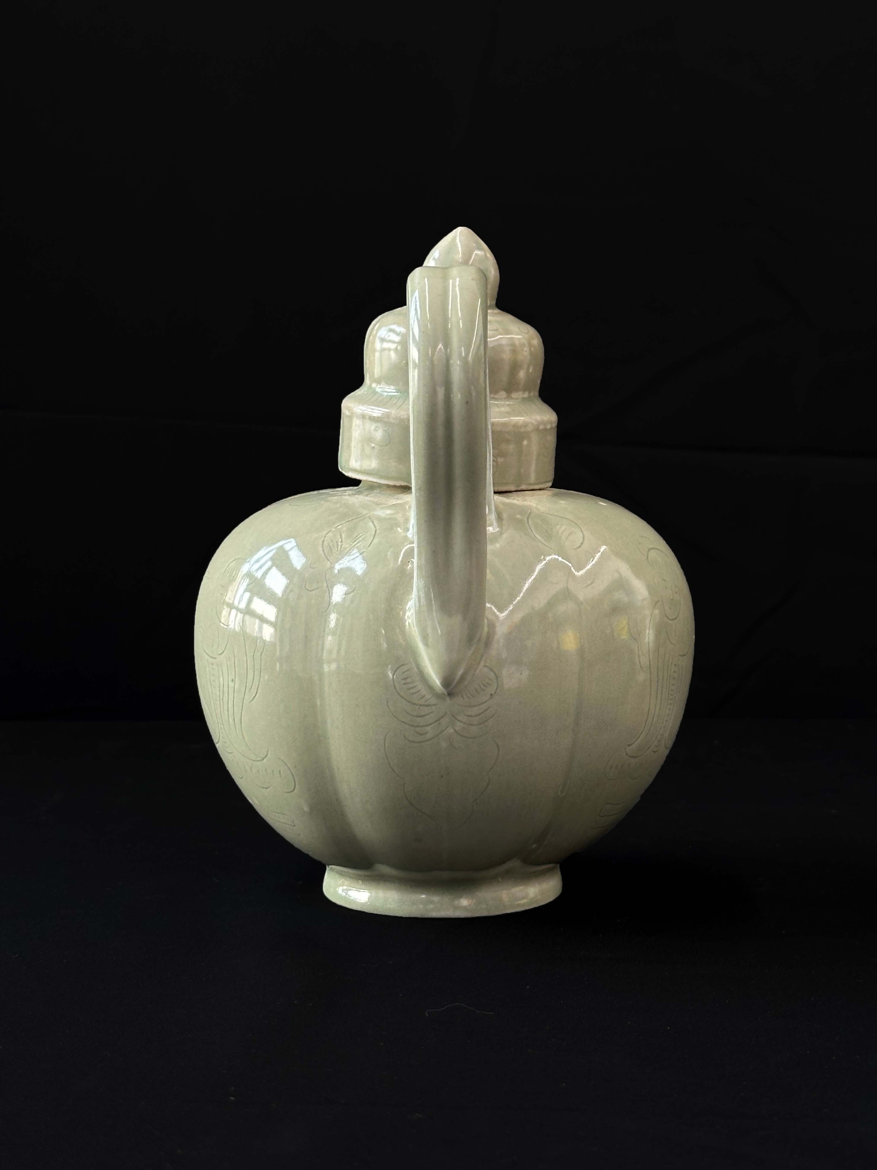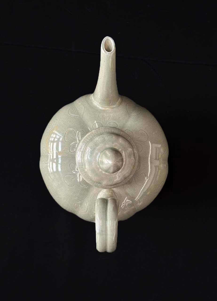 壶身作六棱瓜瓣造型,线条饱满硬朗,既增加了握持时的稳定性,又让器型在雄浑中透着灵动;每瓣棱面满饰细线刻人物纹,人物姿态舒展、衣纹流畅,似宫廷仕女或仙人形象,每一道纹路都带着匠人的呼吸感,尽显越窑 “刻花如丝” 的工艺巅峰;盖顶宝珠钮与瓜棱壶身呼应,造型精巧雅致,盖身带透气孔设计,兼具实用与审美。