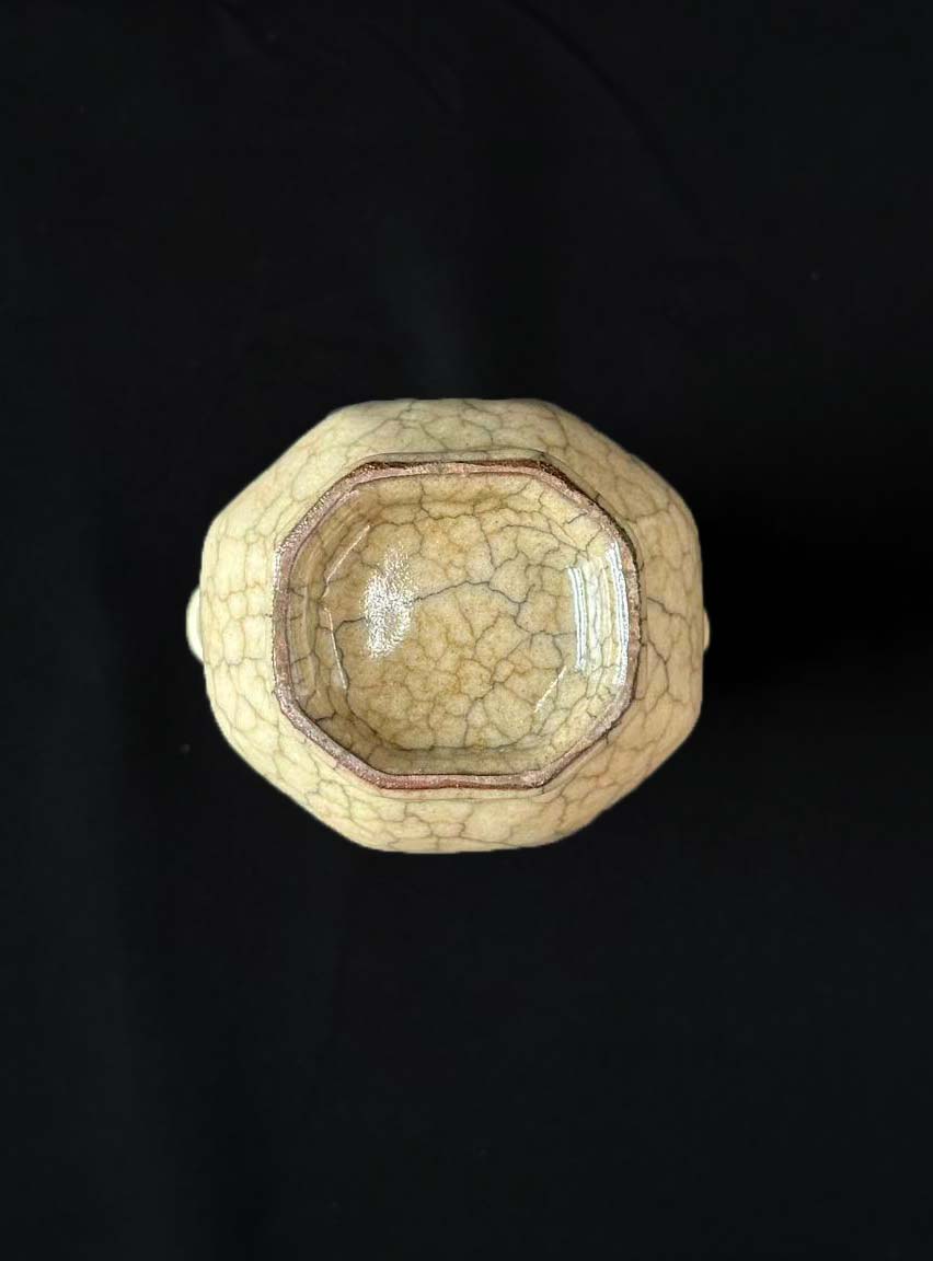 整体呈温润的米黄色釉,釉面肥厚莹润,泛着柔和的 “酥油光”,釉面布满密集的开片纹,粗裂纹呈深褐色(铁线),细裂纹呈浅黄色(金丝),深浅交织,是哥窑标志性的 “金丝铁线” 特征。